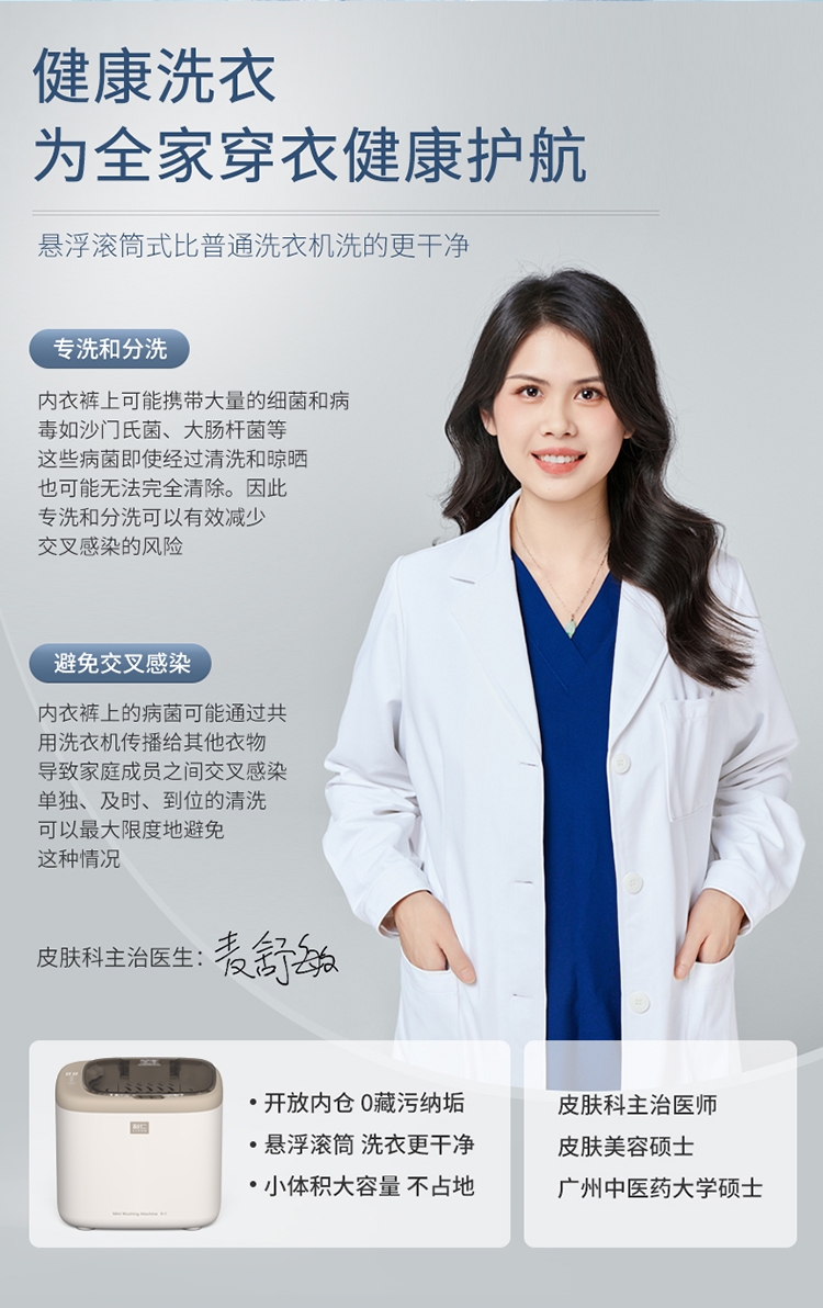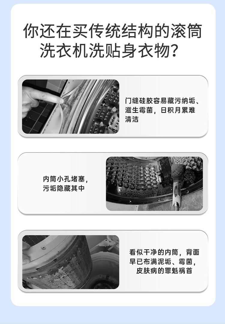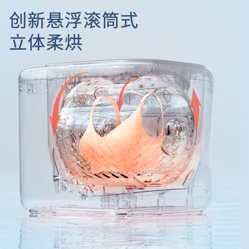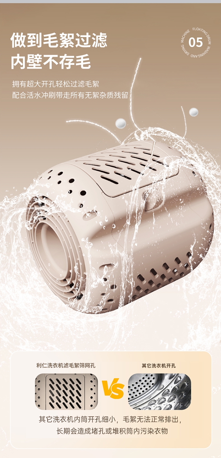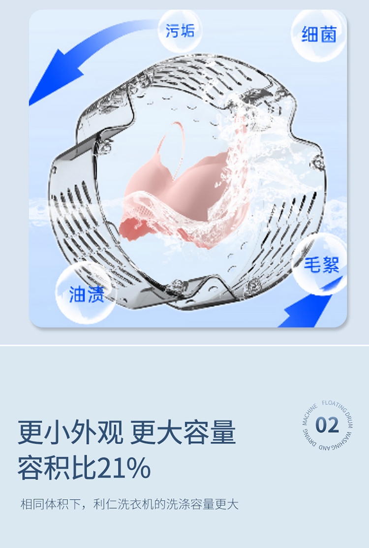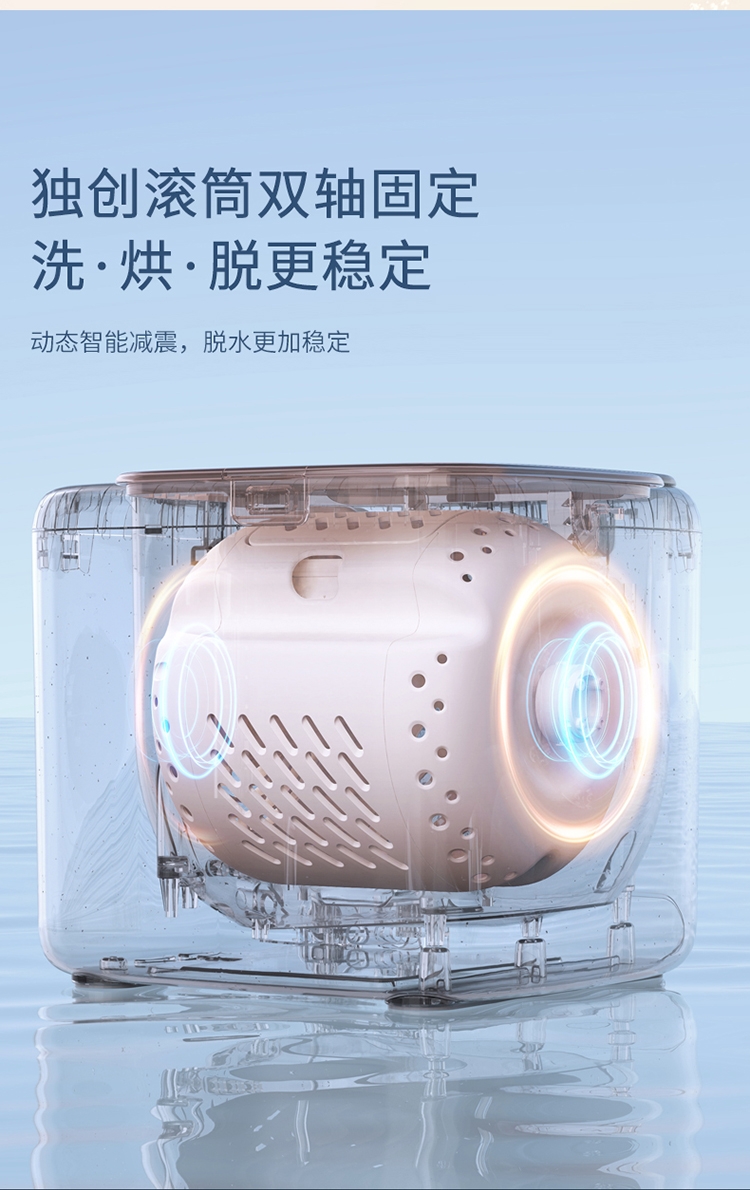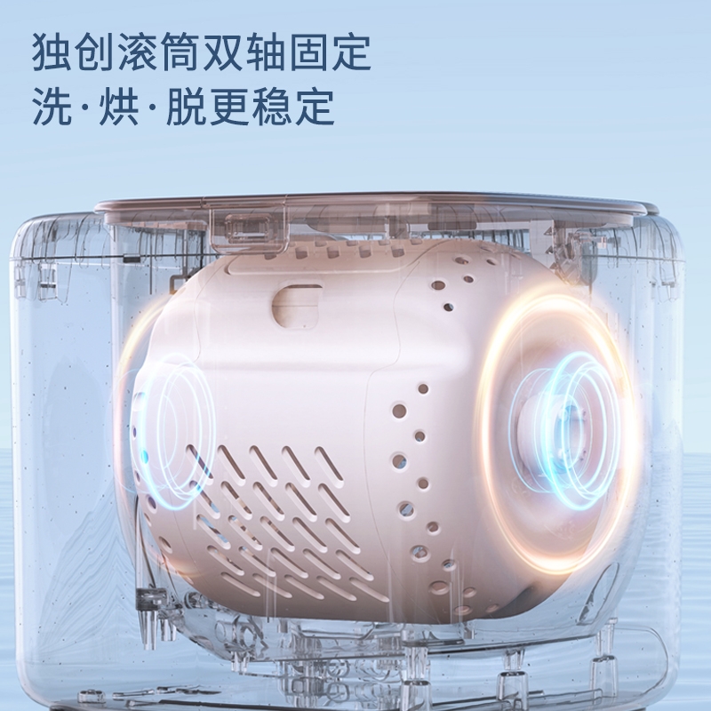 正反滚筒转,衣物每分钟拍洗约200次;更小外观更大容量 容积比21%;独创滚筒双轴固定 洗·烘·脱更稳定