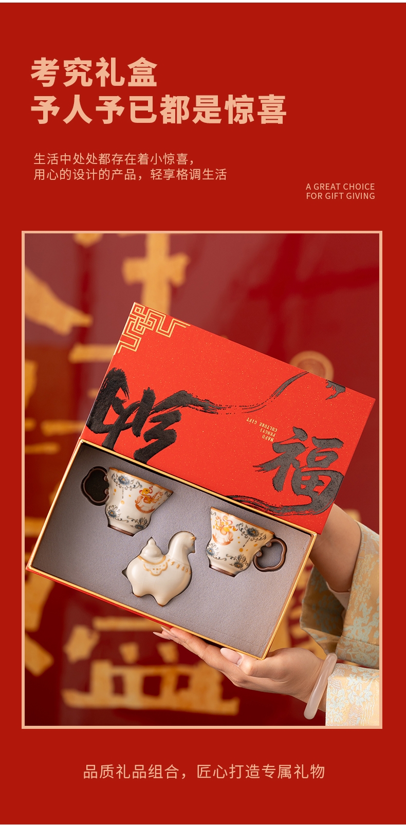 马年开门红礼品,马到成功杯子摆件套装,马背上葫芦;寓意福禄。亚黄汝瓷,玛瑙入釉,蝉翼开片,;家有千财万贯,不如汝窑一片。独家专利技术新品。画面