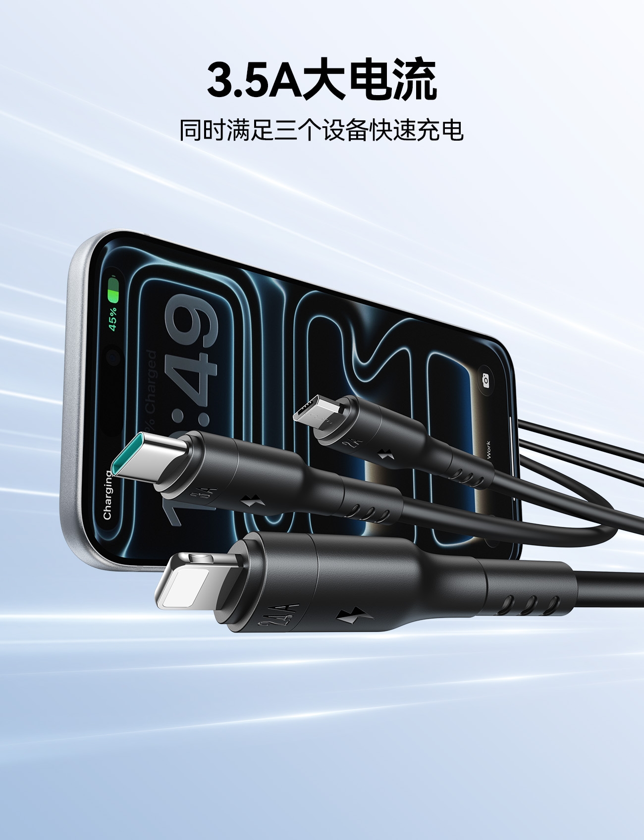 .3.5A大电流,同时满足三个设备快速充电;兼容性强所有手机都能充亦能满足日常的大部分数码设备;.加长网尾:加长柔韧网尾,保护芯线更耐弯折