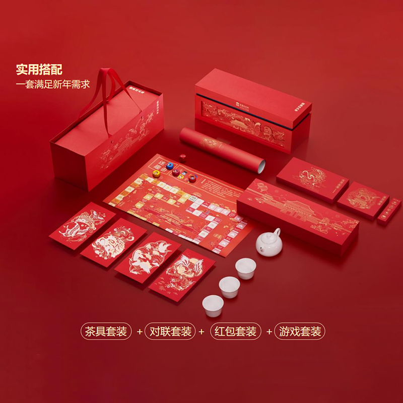 配置:茶具套装茶壶1个,茶杯3个 红包套装红包套装:4款8个大红包 对联套装 上下联横批1副,福字2张 游戏套装迷宫游戏:1套
