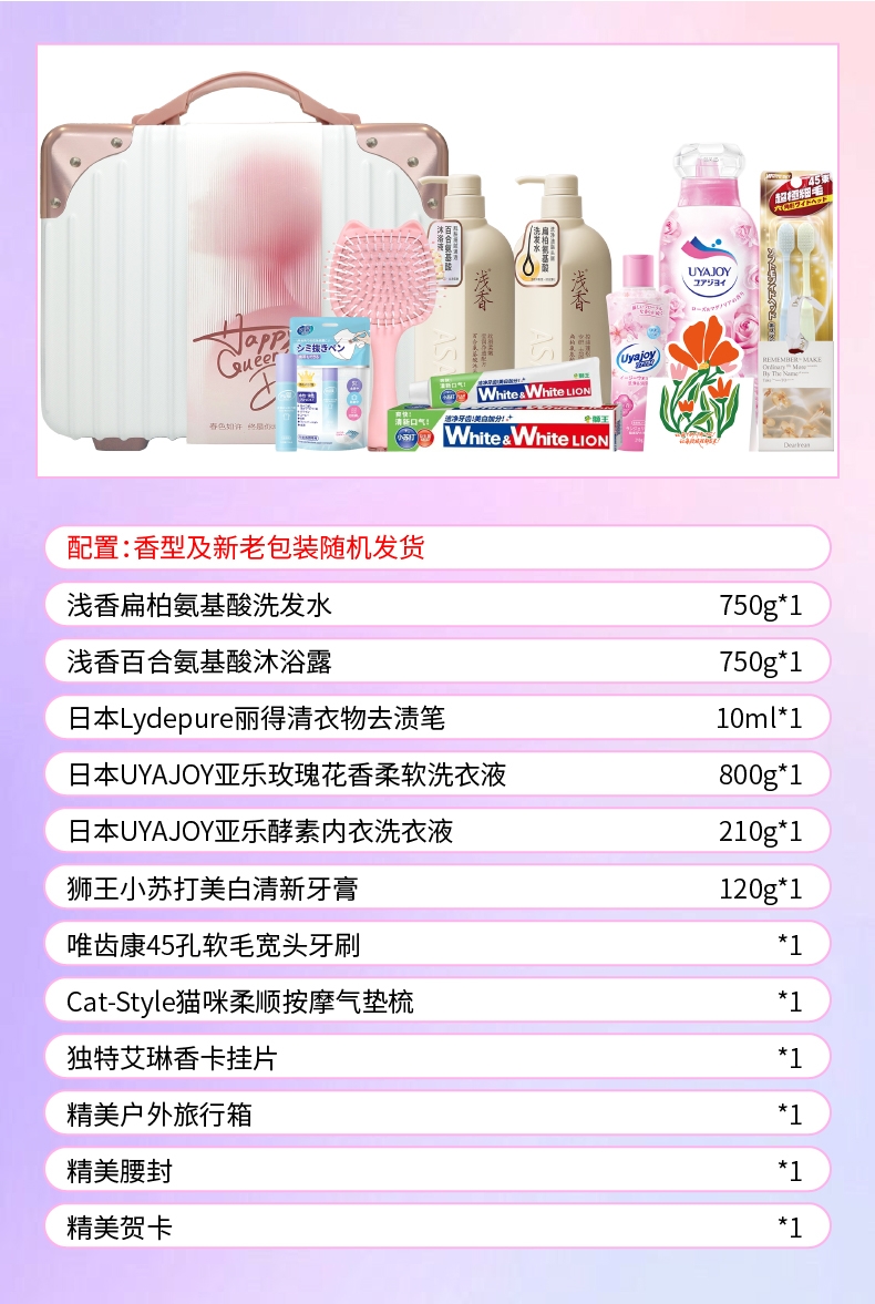 配置清单:浅香扁柏氨基酸洗发水750g*1 浅香百合氨基酸沐浴露750g*1 日本Lydepure丽得清衣物去渍笔10ml*1 日本UYAJOY亚乐玫瑰花香柔软洗衣液800g*1 日本UYAJOY亚乐酵素内衣洗衣液210g*1 狮王(Lion)小苏打美白清新牙膏120g*1 唯齿康45孔软毛宽头牙刷(2支装)*1 Cat-Style猫咪柔顺按摩气垫梳*1 独特艾琳香卡挂片*1(赠品) 精美户外旅行箱*1 精美腰封*1(量大可定制) 精美贺卡*1(量大可定制)