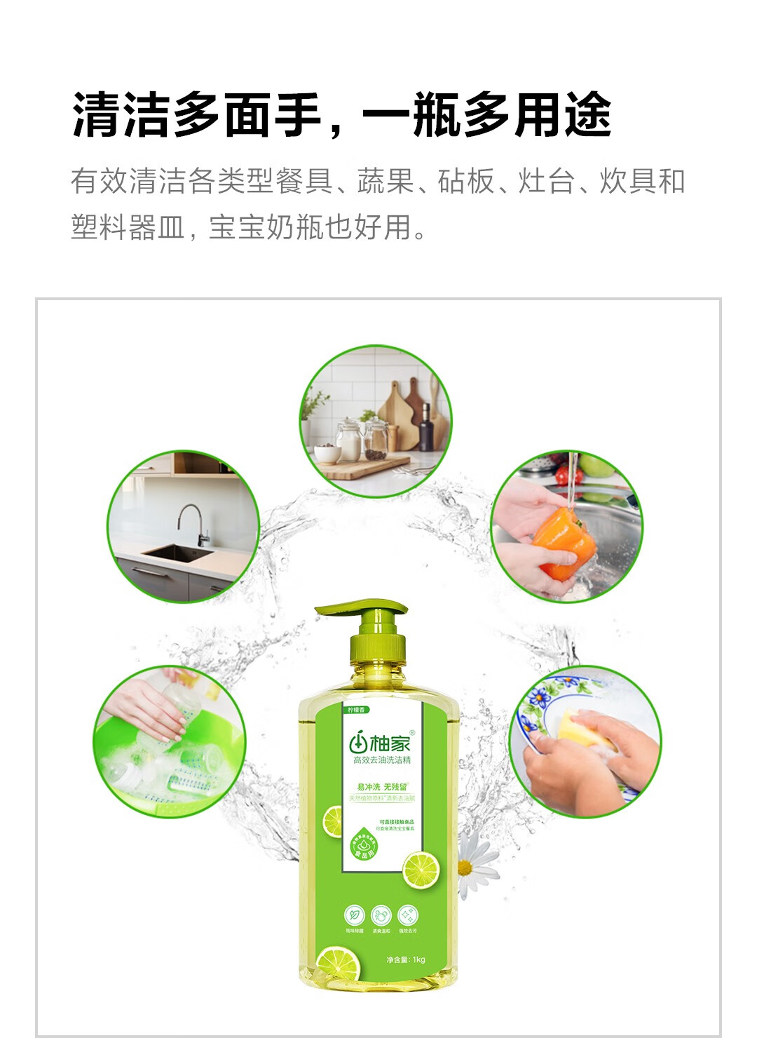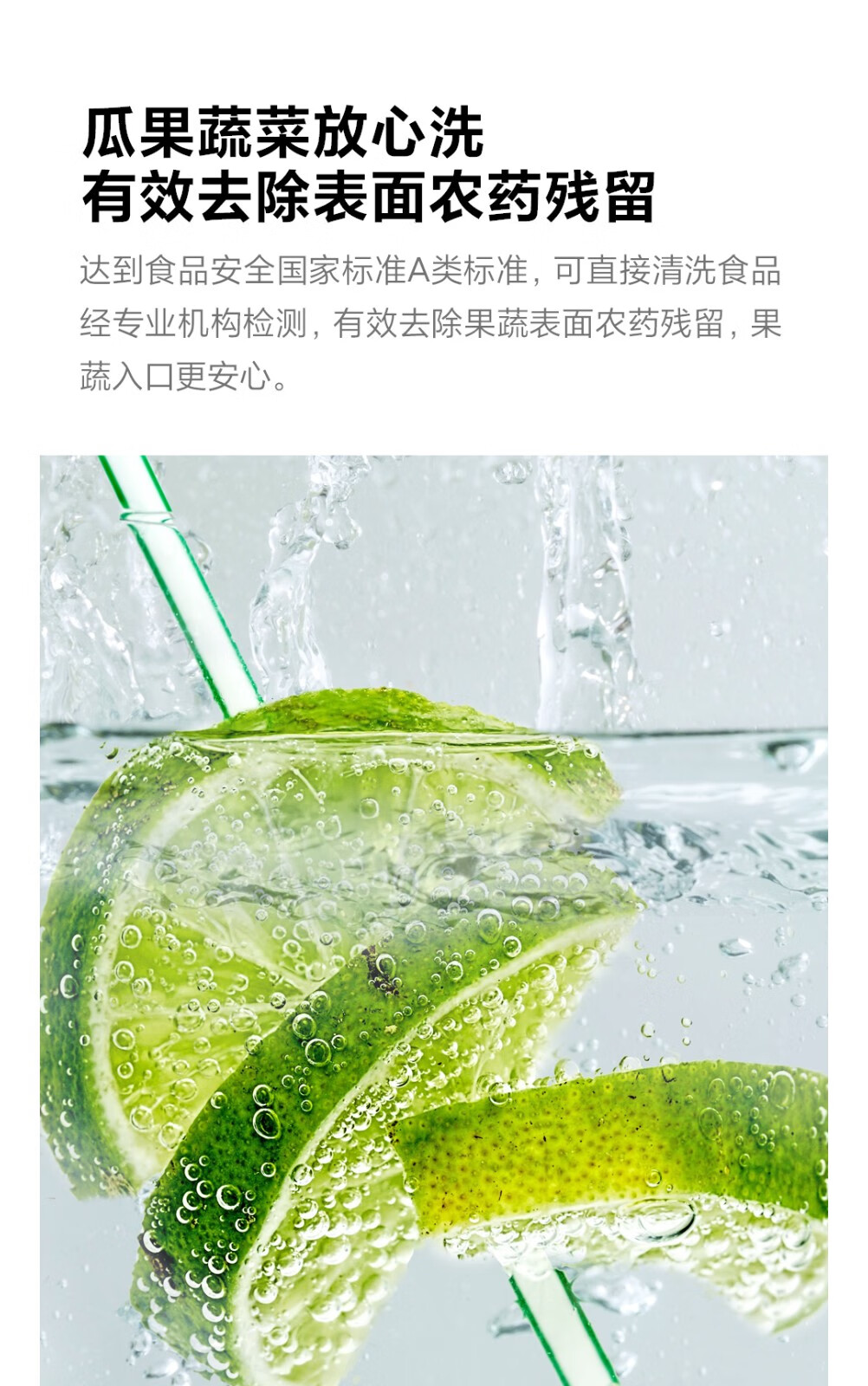 国家A类标准,植物洁净,放心洗涤,洗后无残留;分子复合技术,冷水强效去油;无毒无磷无荧光增白剂;通过皮肤刺激性测试温和不伤手;有效洗除农残
