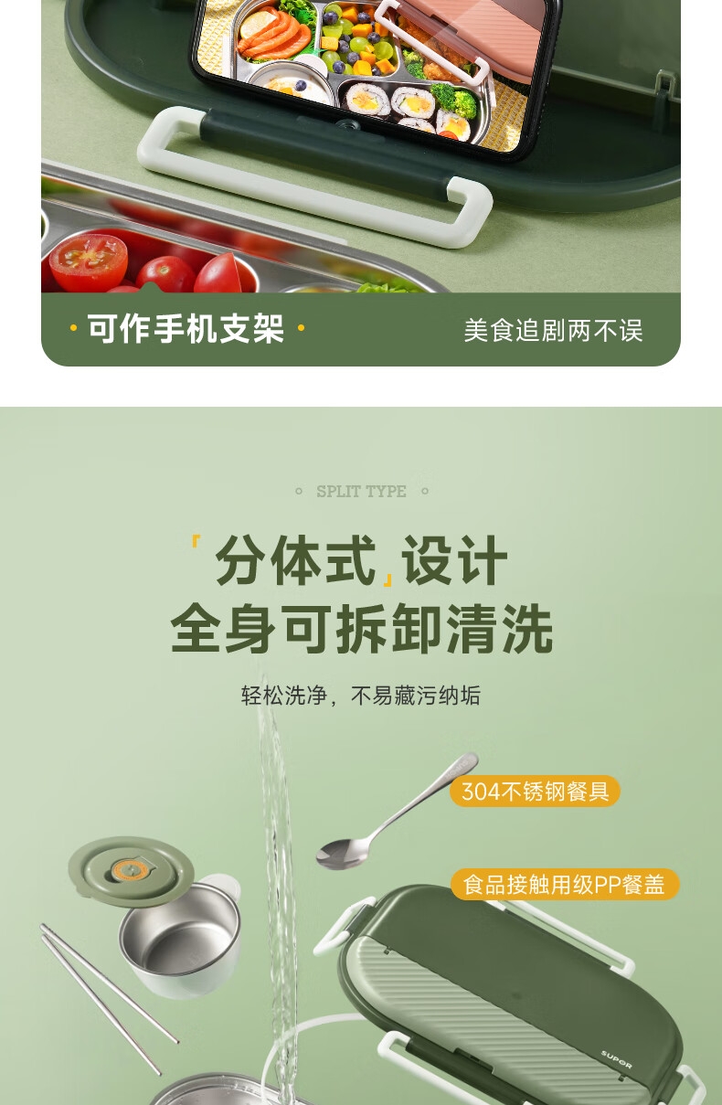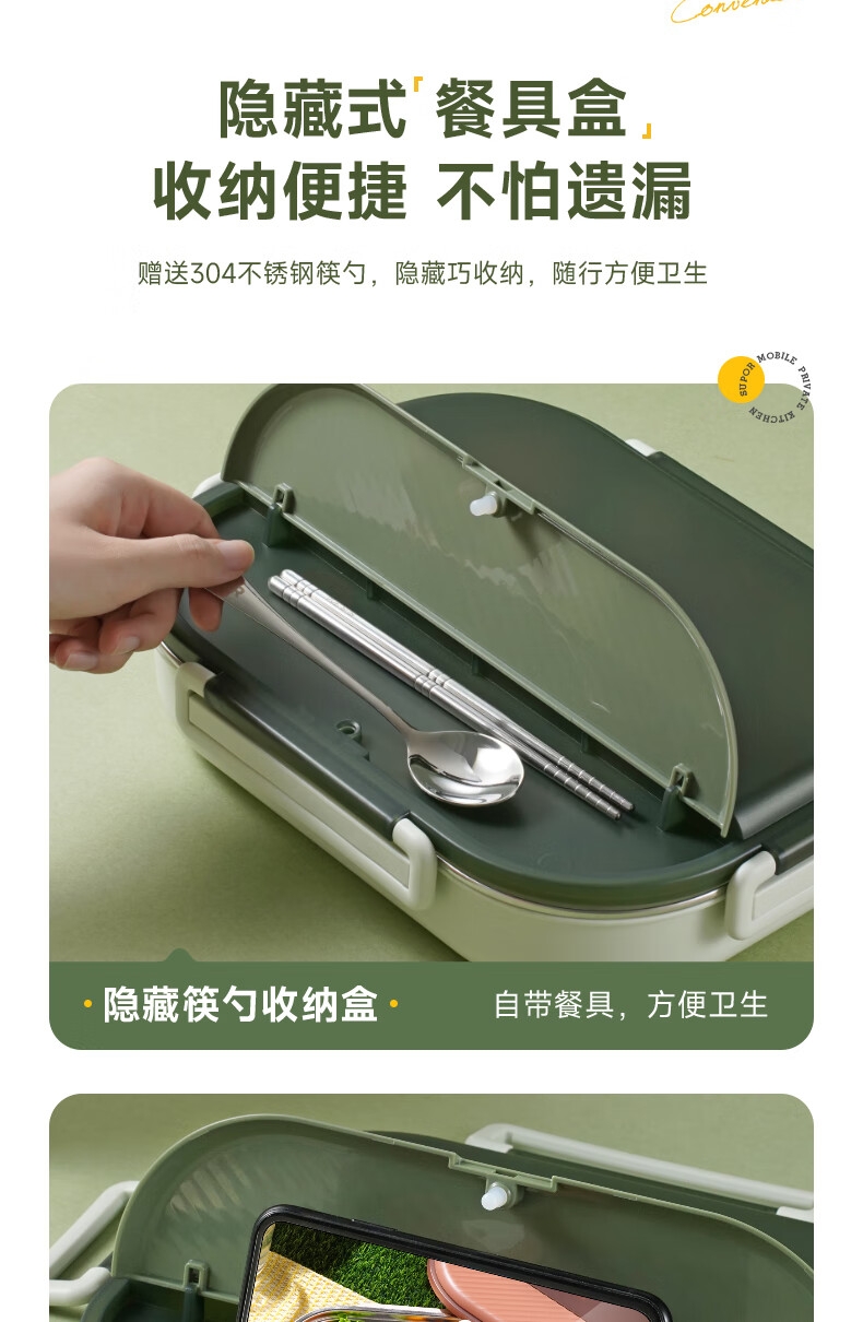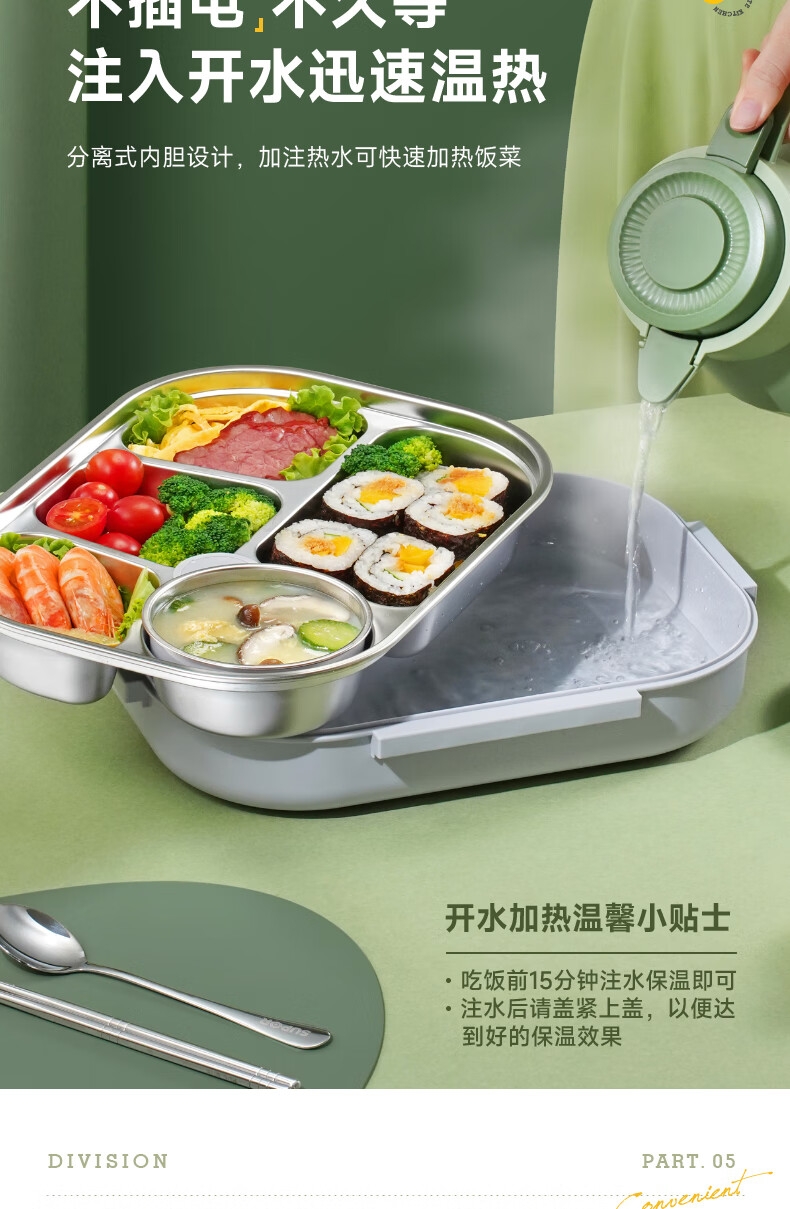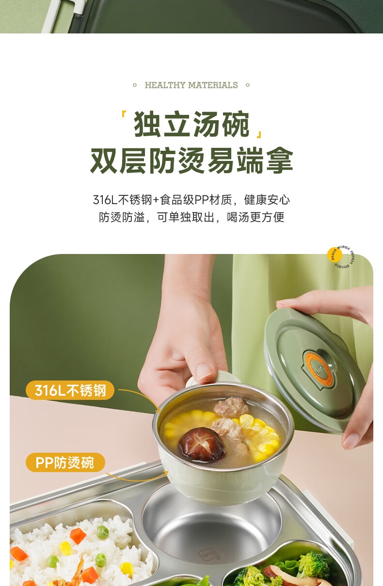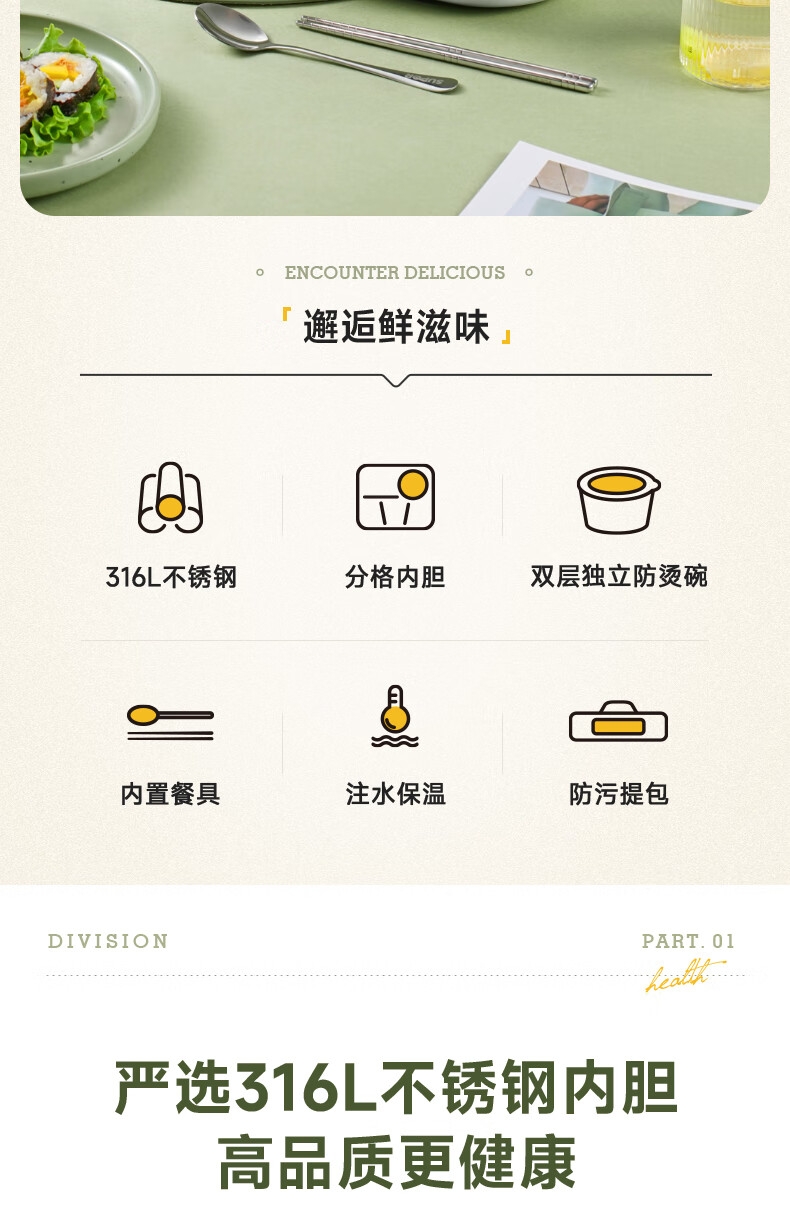 316不锈钢;内置餐具,注水保温;双层独立防烫碗