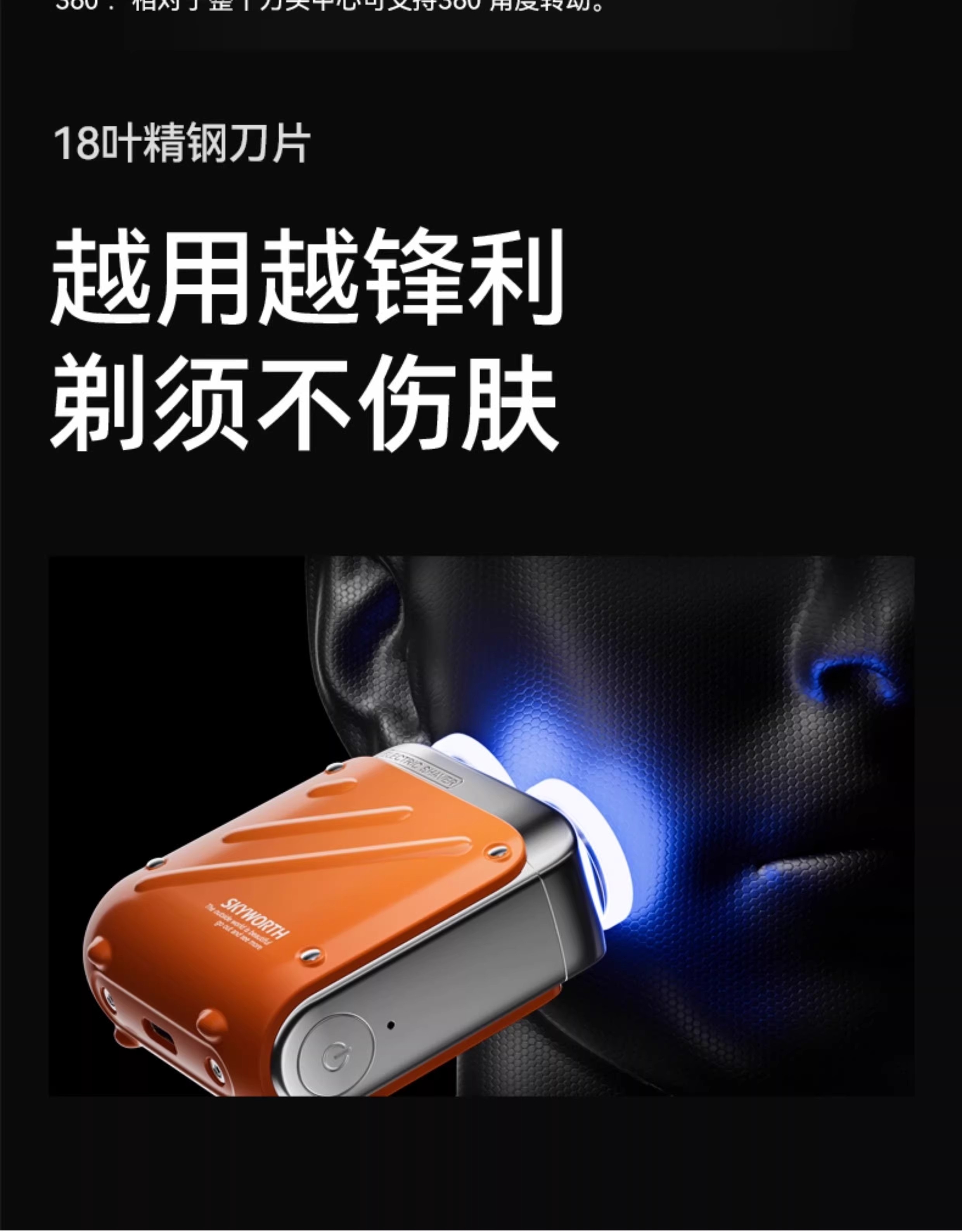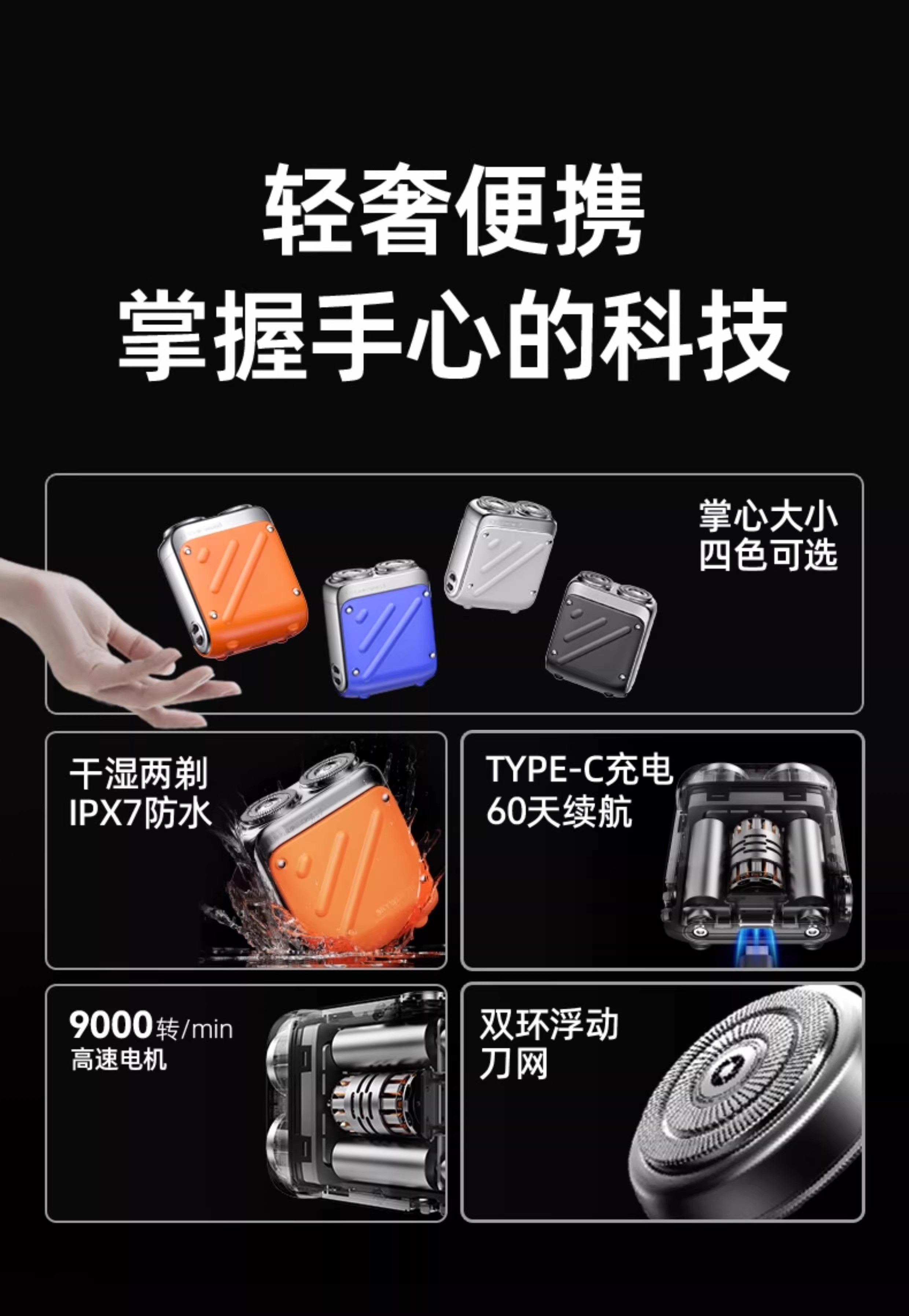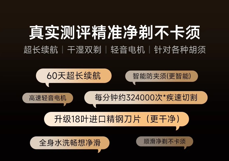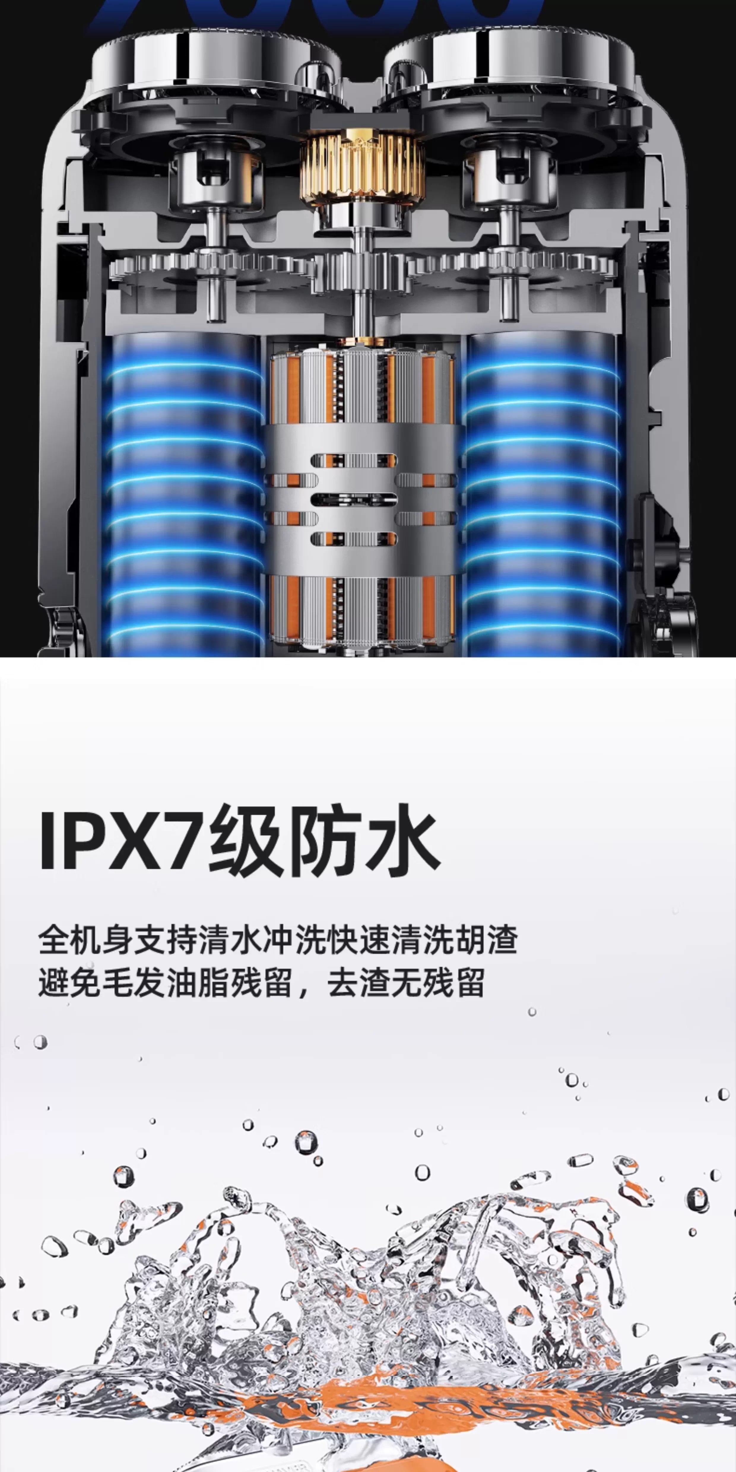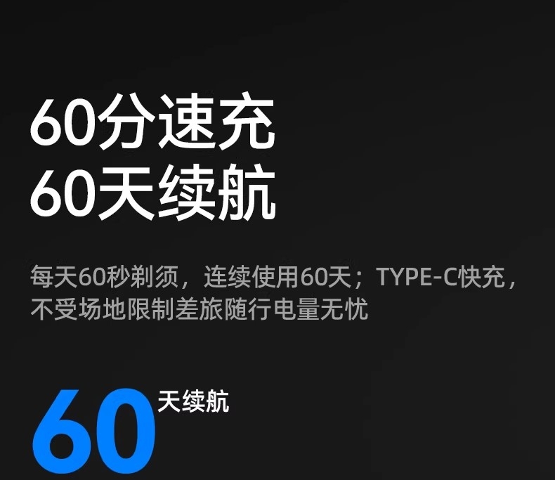 IPX7级防水,干湿双剃 全身水洗;充电一小时,续航60天;自研磨技术,刀片越用越锋利