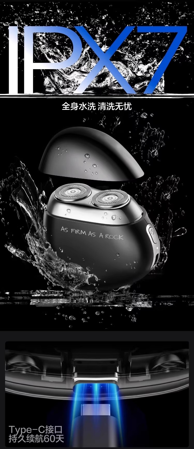 充电一小时,续航60天;IPX7级防水,干湿双剃;浮动刀网,360°捕捉残留胡须