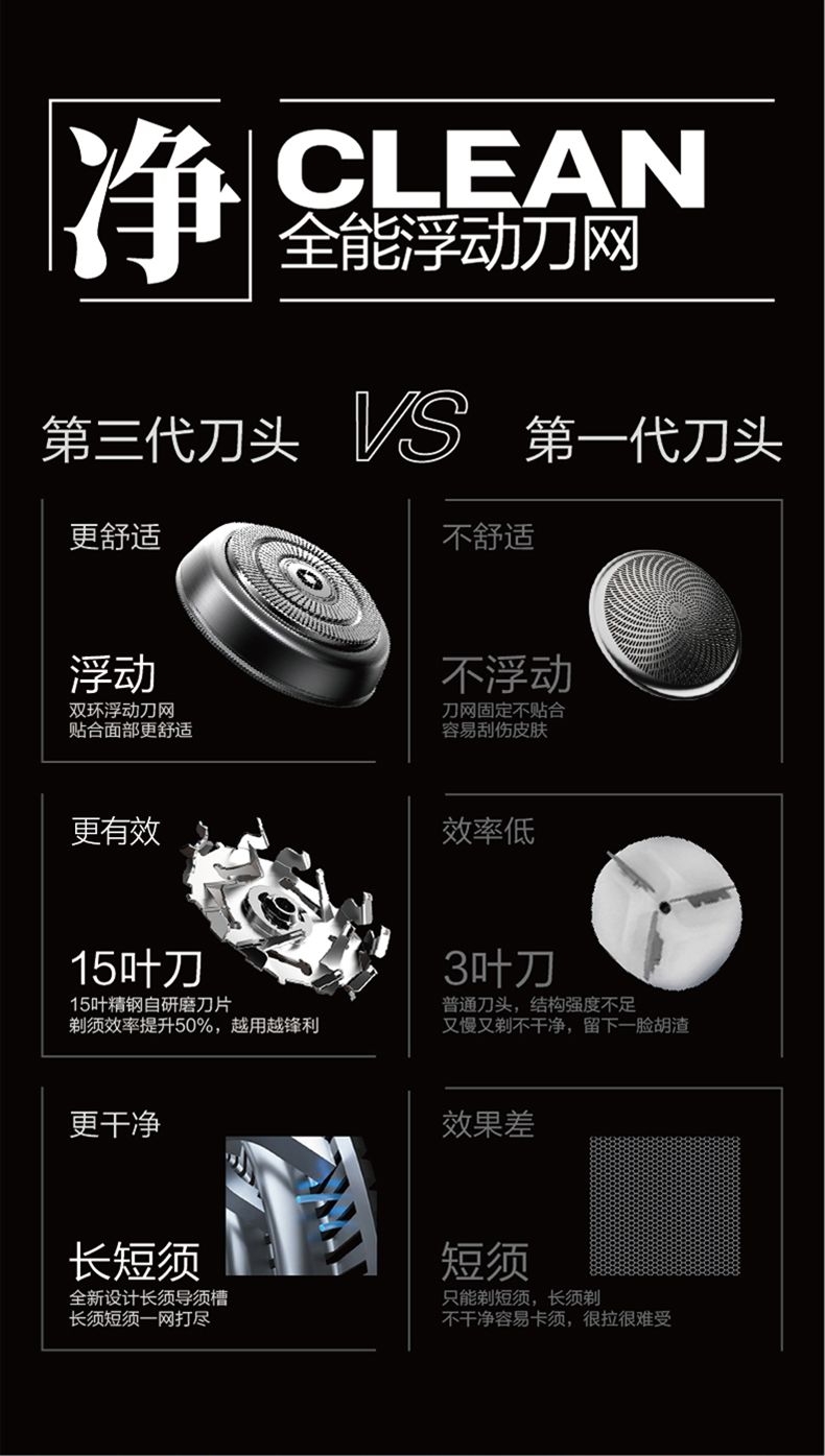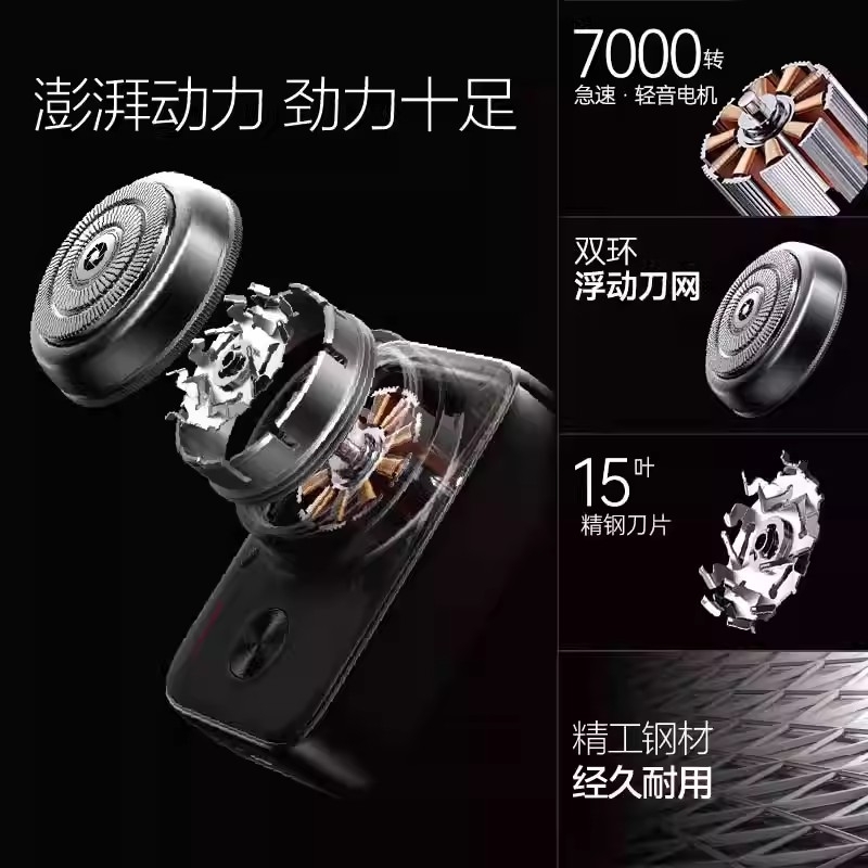 全身水洗,IPX7级防水;TYPE-C极速快充,;7000转高速静噪电机;光泽圆润,精工电镀;15+自研磨刀片,越用越锋利; 金卡礼盒包装