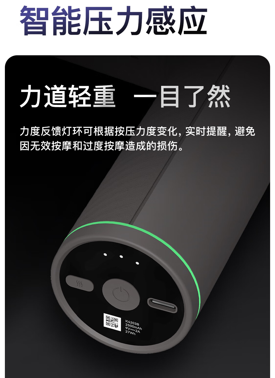 全新动力体验,12mm 按摩深度;双色感应灯环;丰富按摩体验3+1,按摩头亲肤硅胶+金属