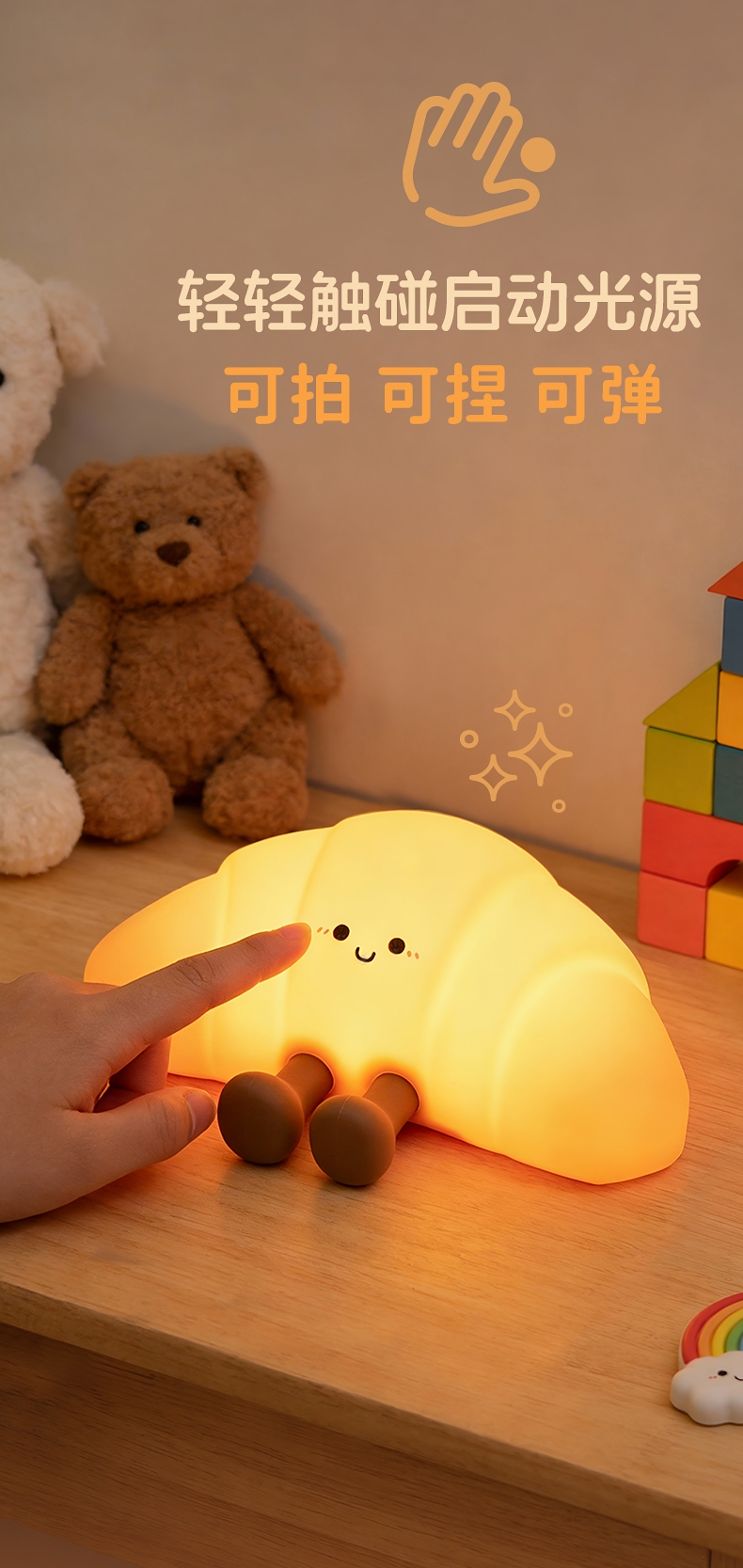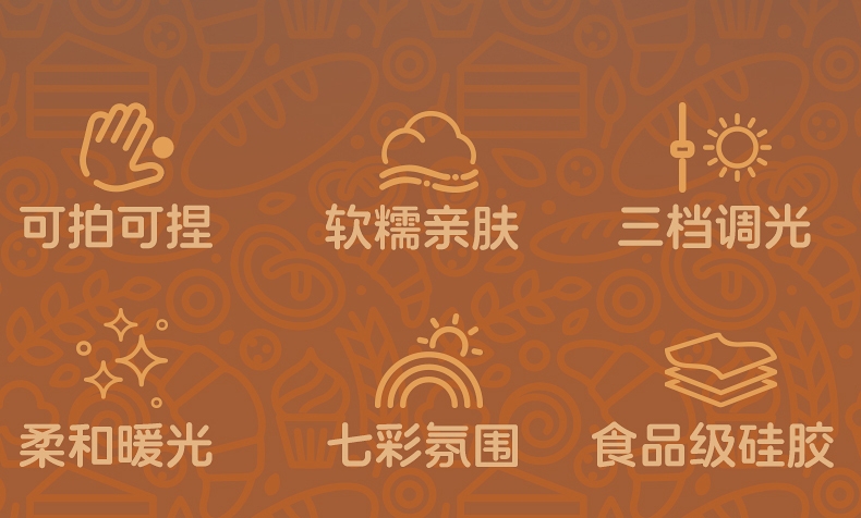 安全Q弹,治愈解压;柔和灯光,三档调节,七彩氛围;大容量电池, 持久续航