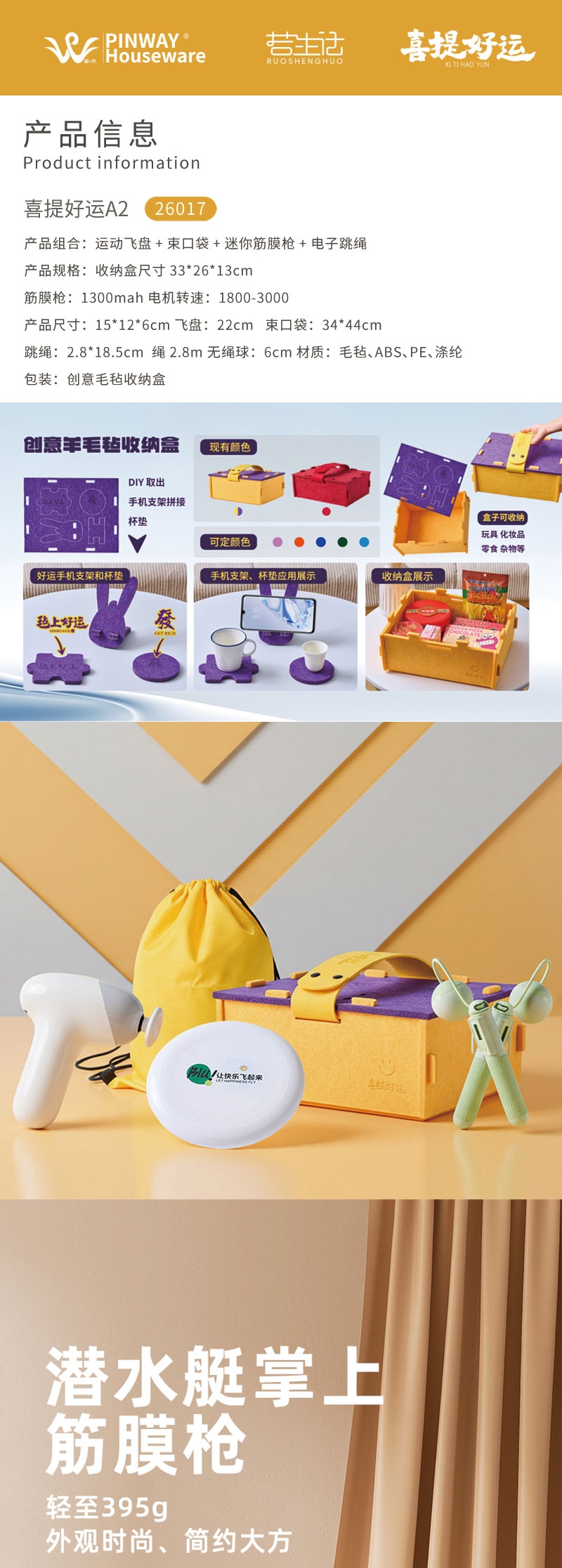 配置清单:筋膜枪*1;跳绳*1;运动飞盘*1;运动束口袋*1;毛毡收纳盒*1