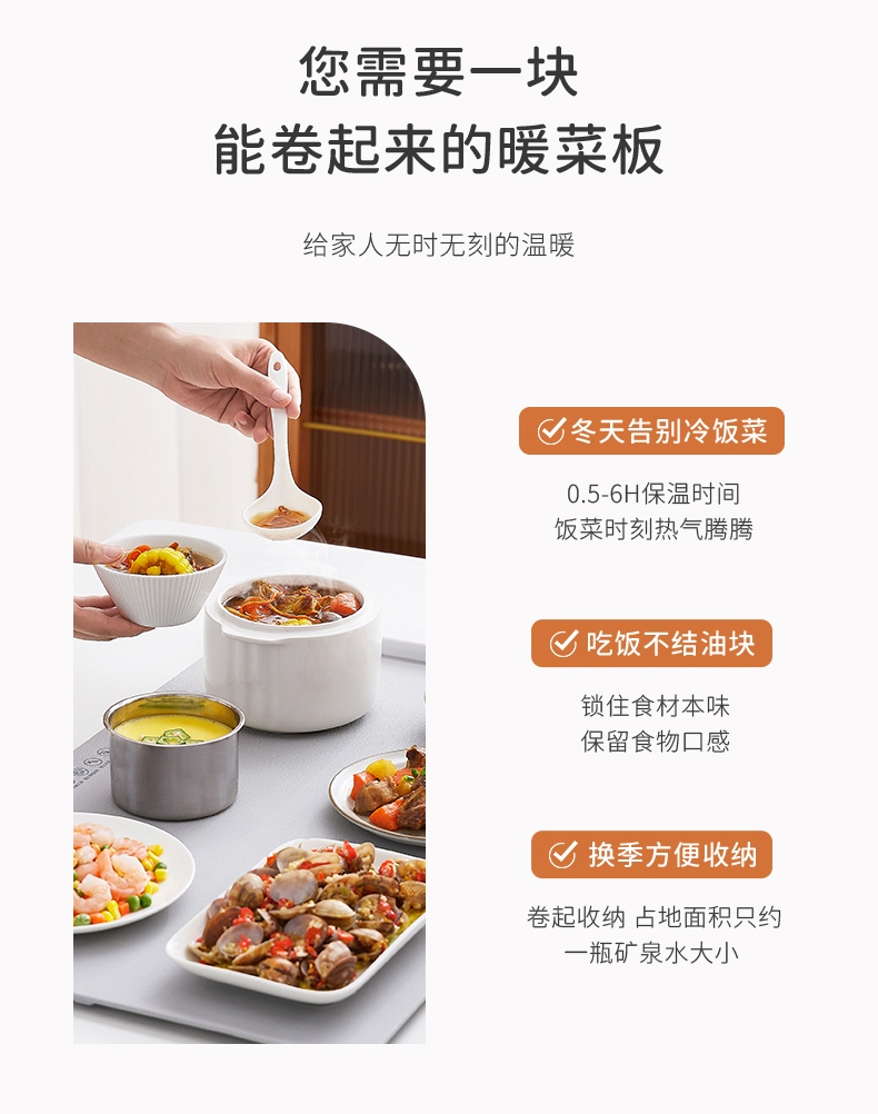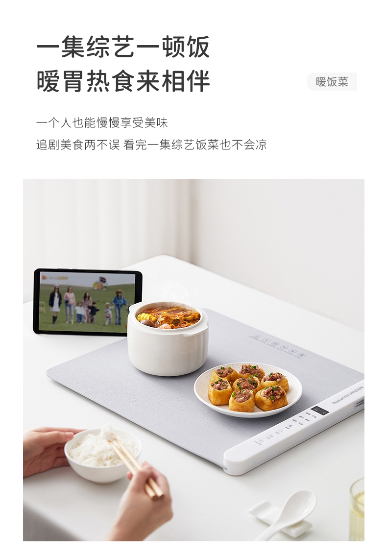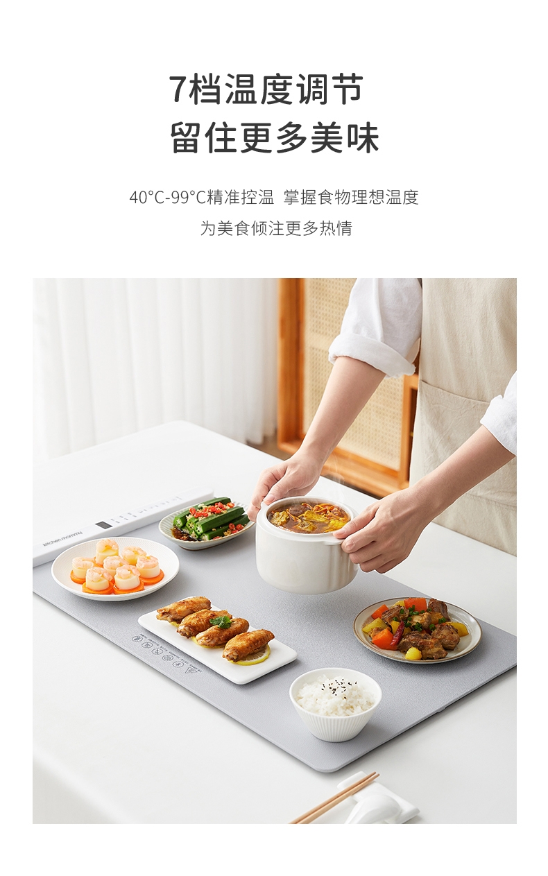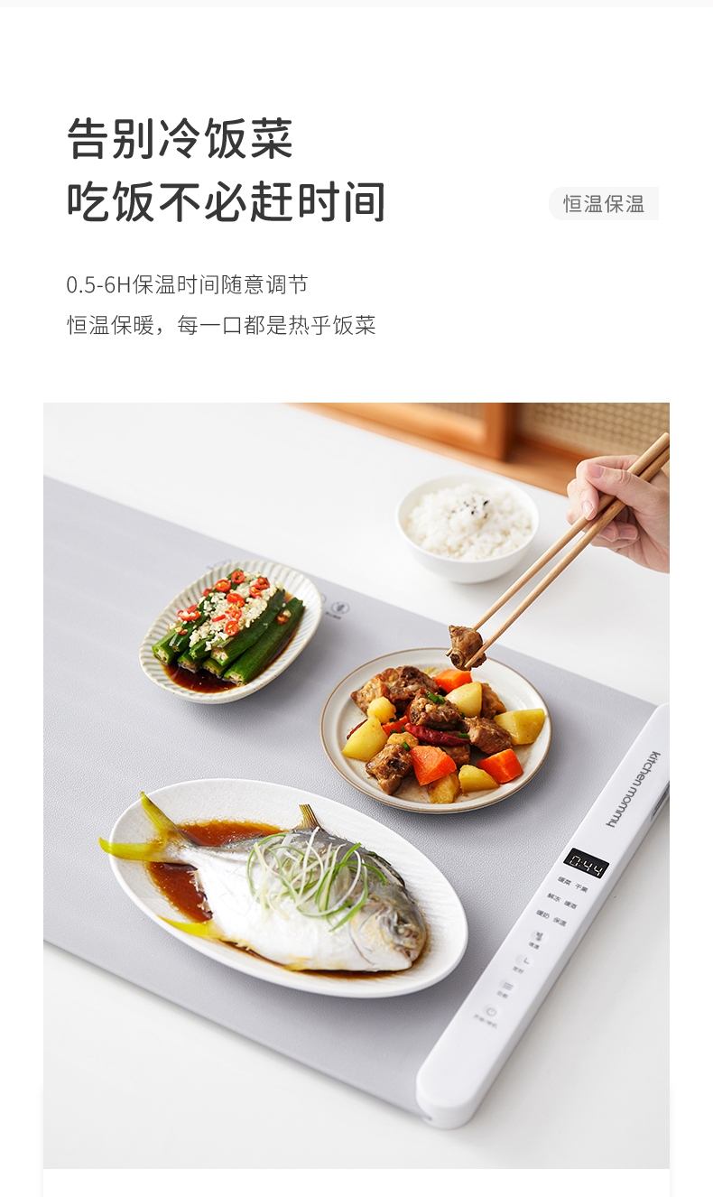 智能控温,锁住饭菜原有鲜美;耐⾼温⾯板,快速导热,告别冷饭菜;定时保温,可卷起收纳;温度可调40-99度,自由选择;多种功能,供您选择