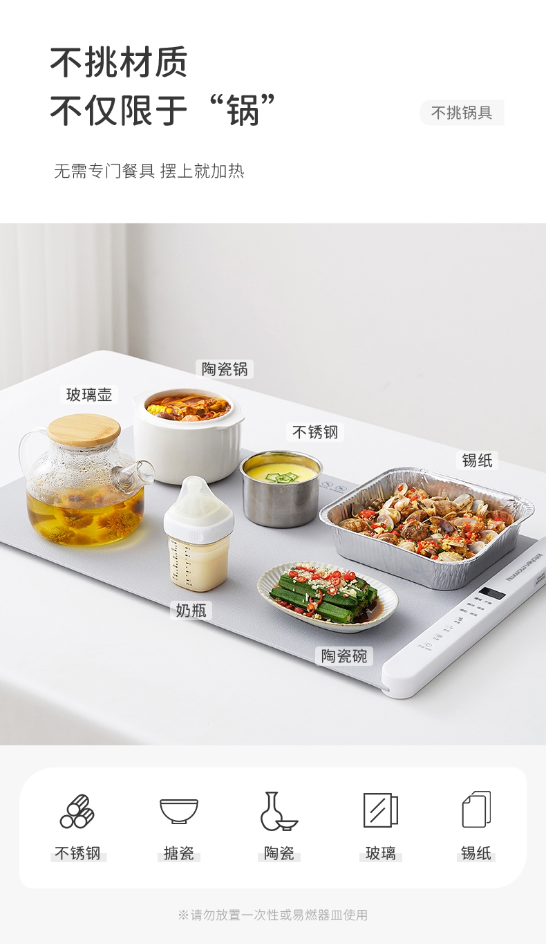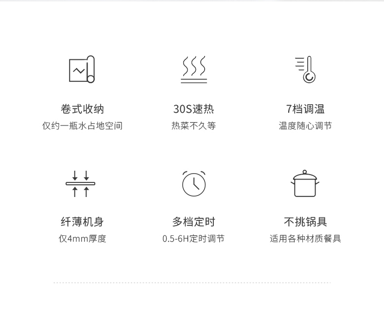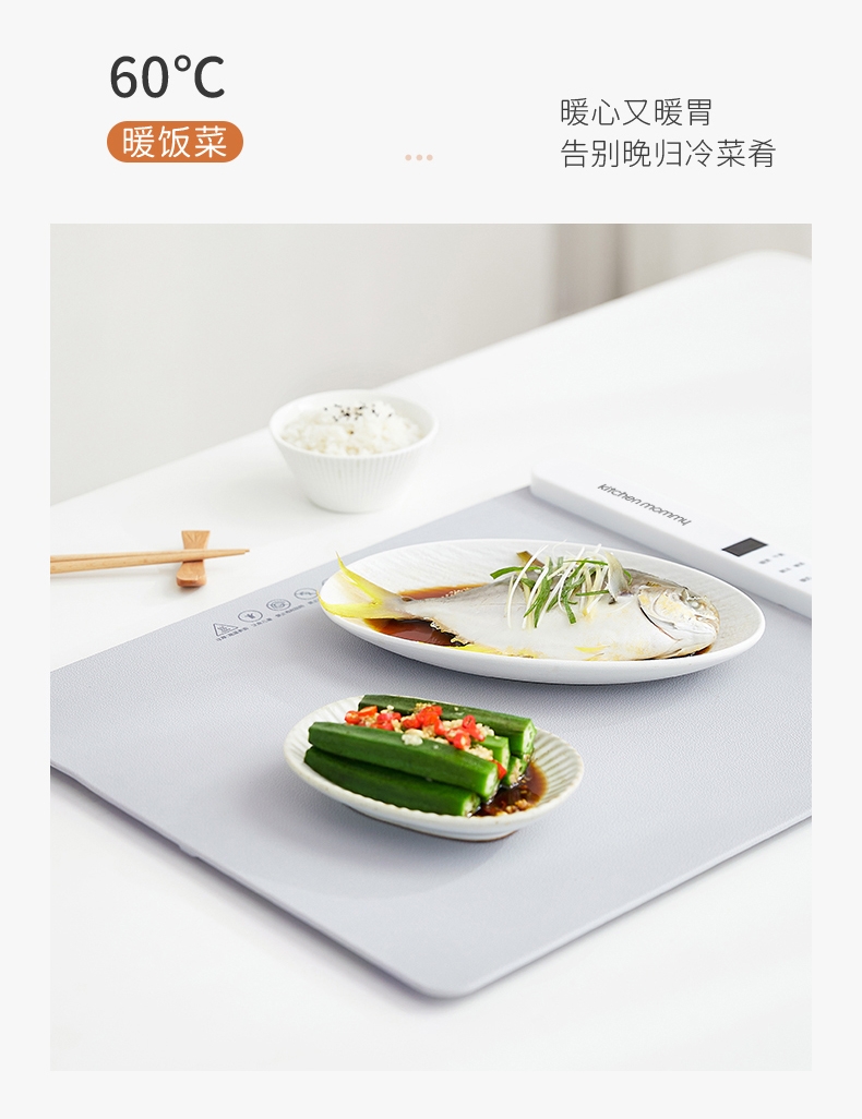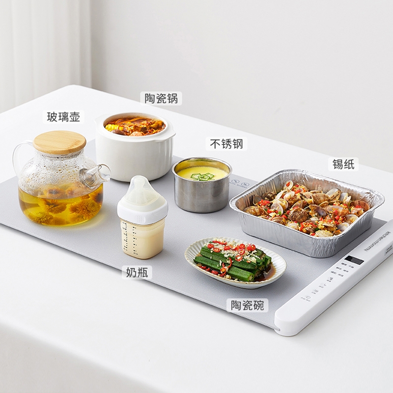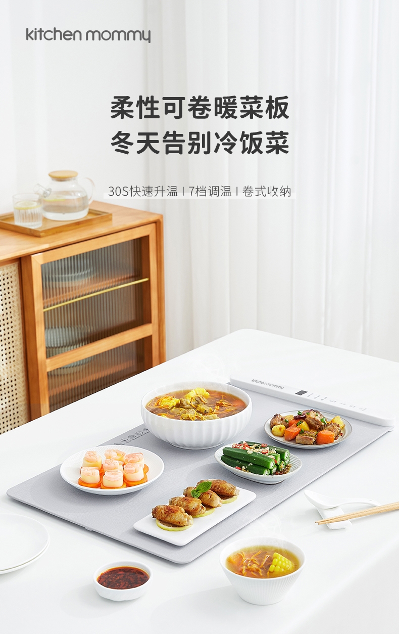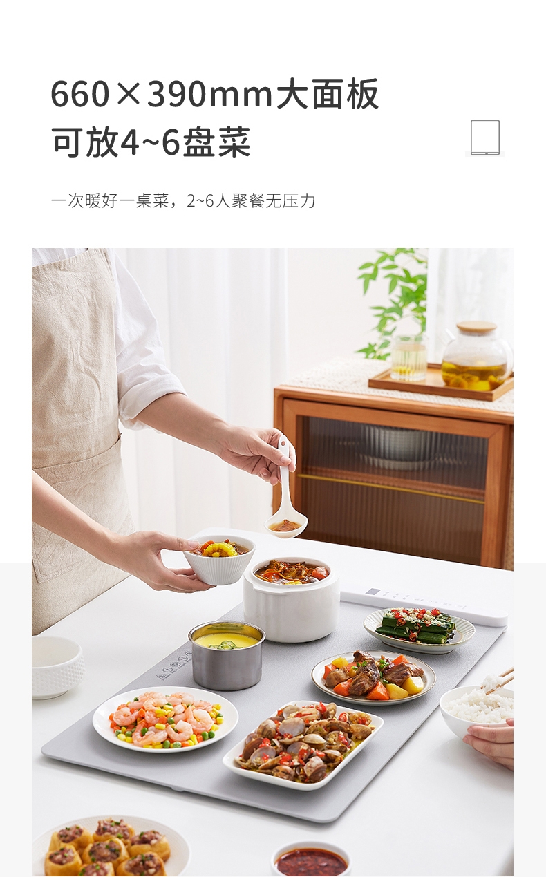 智能控温,锁住饭菜原有鲜美;耐⾼温⾯板,快速导热,告别冷饭菜;定时保温,可卷起收纳;温度可调40-99度,自由选择;多种功能,供您选择