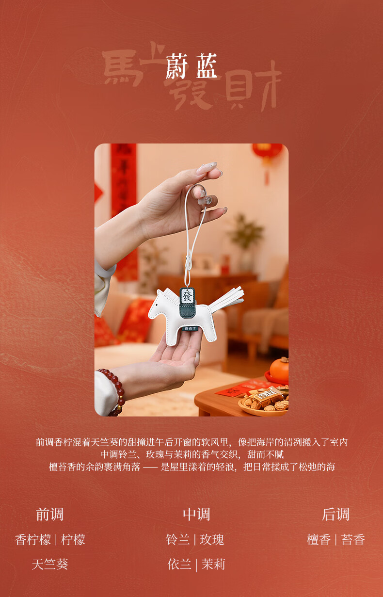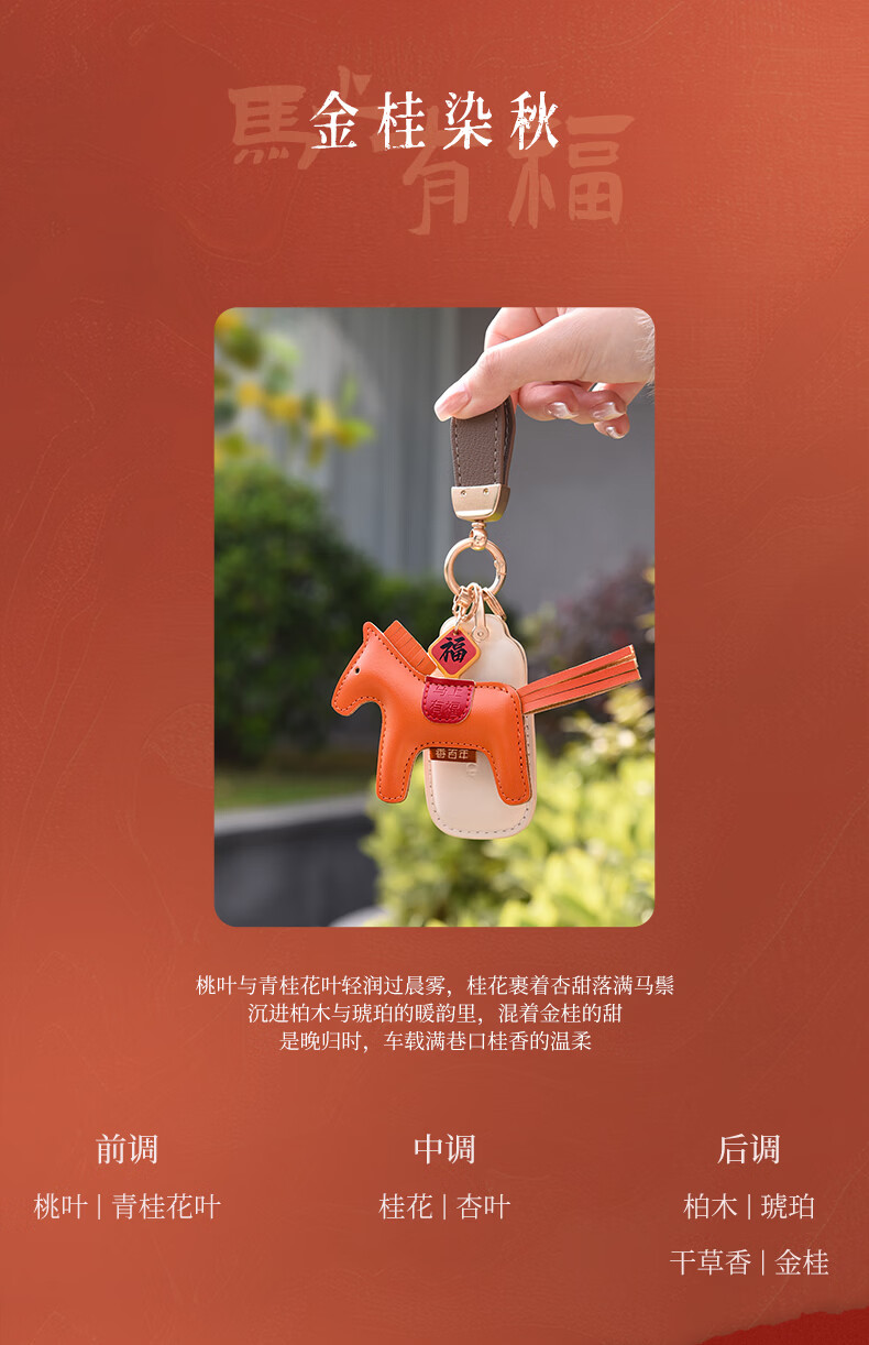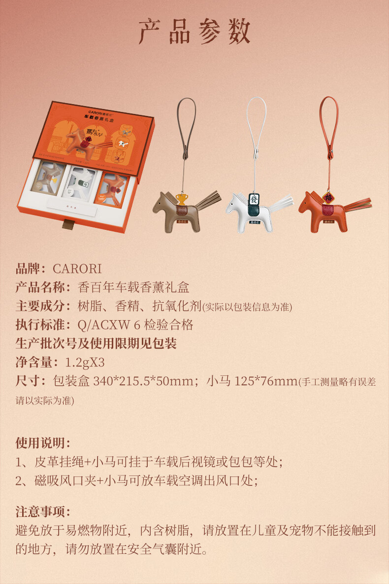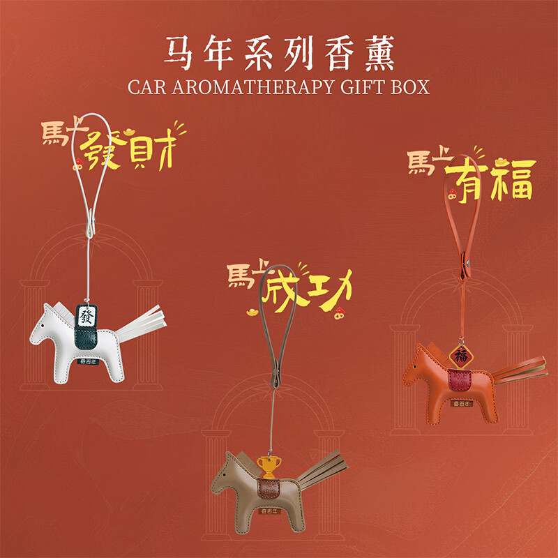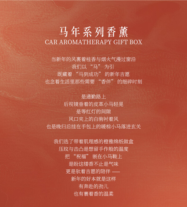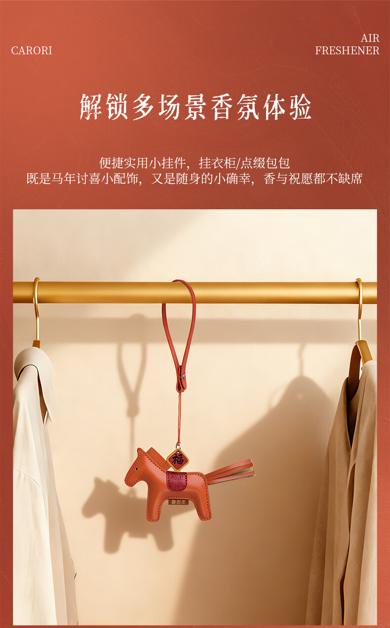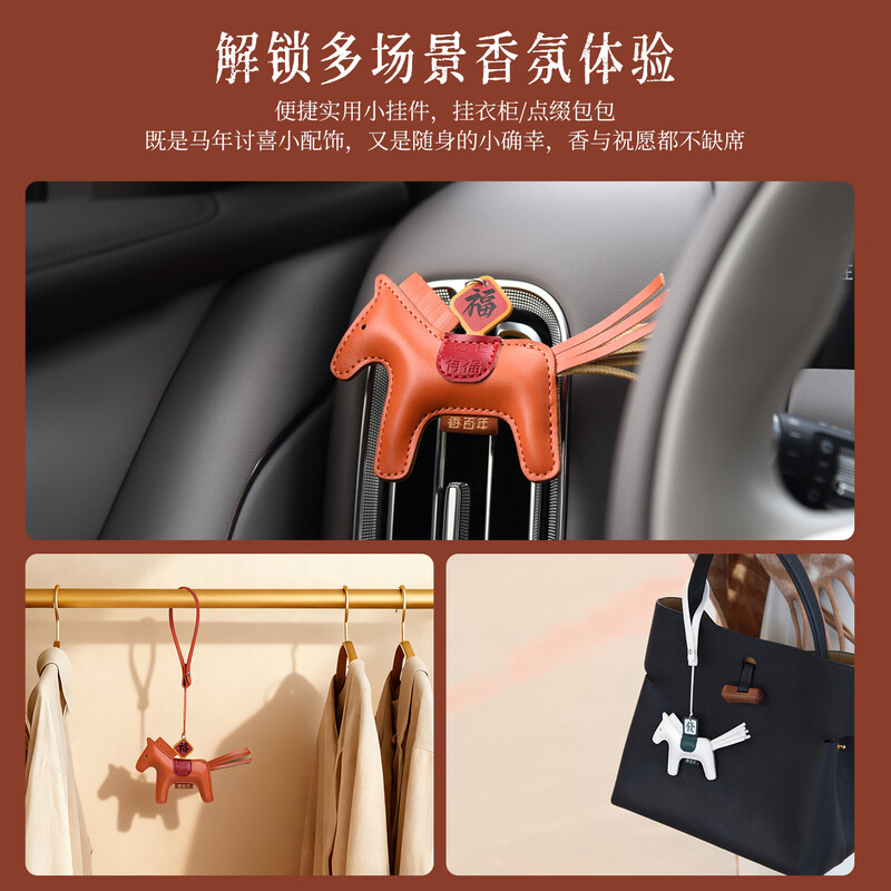肌理感的橙雅绵纸做盒 压纹与击凸是想留手作般的温度;便捷实用小挂件,挂衣柜/点缀包包既是马年讨喜小配饰;香氛颗粒不含甲醛车居香伴更安心