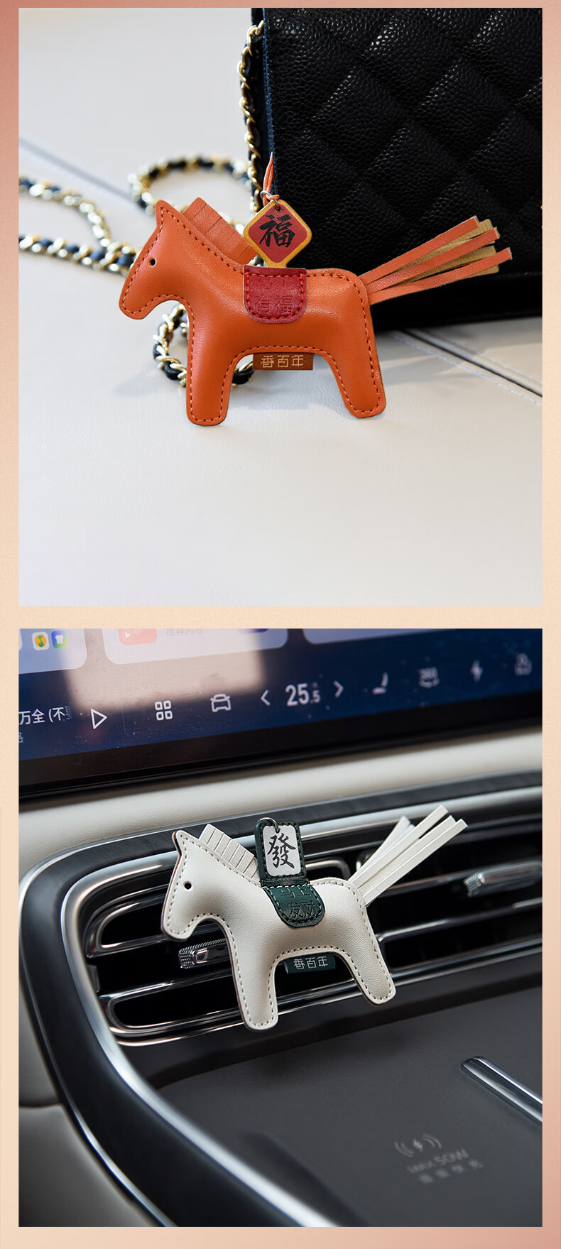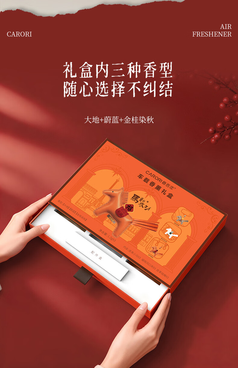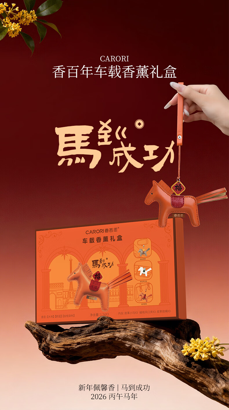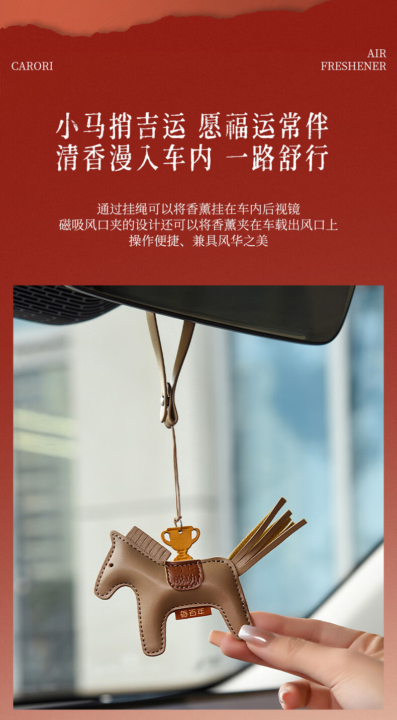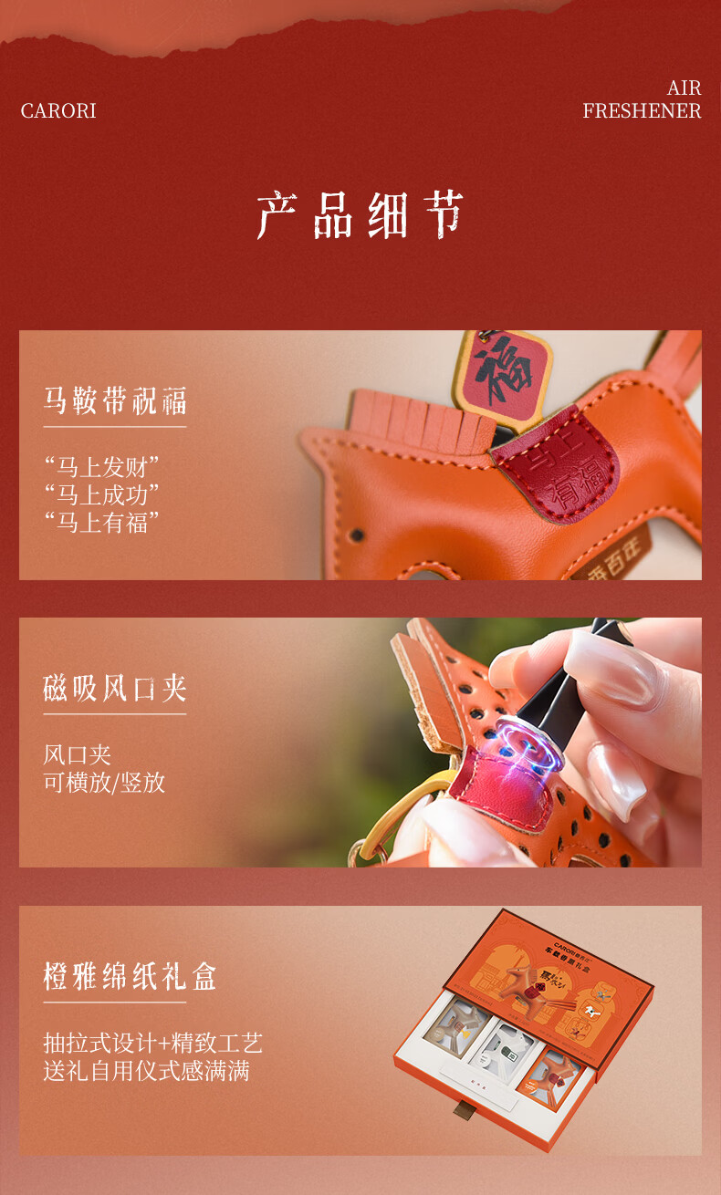 肌理感的橙雅绵纸做盒 压纹与击凸是想留手作般的温度;便捷实用小挂件,挂衣柜/点缀包包既是马年讨喜小配饰;香氛颗粒不含甲醛车居香伴更安心