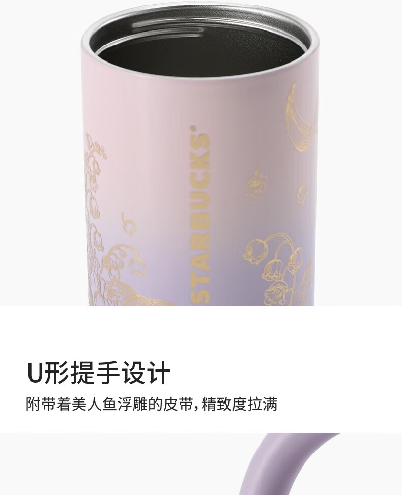 316不锈钢内胆, 双层真空工艺,锁温更持久;质感漆搭配金色贴花图案,彰显高端气质;形提手设计, 附带着美人鱼浮雕的皮带,精致度拉满