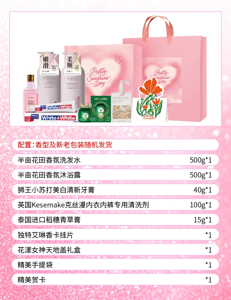 配置清单:半亩花田香氛洗发水500g*1 半亩花田香氛沐浴露500g*1 狮王小苏打美白清新牙膏40g*1 英国Kesemake克丝漫内衣内裤专用清洗剂100g*1 泰国进口稻穗青草膏15g*1 独特艾琳香卡挂片*1(赠品) 花漾女神天地盖礼盒*1 精美手提袋*1 精美贺卡*1