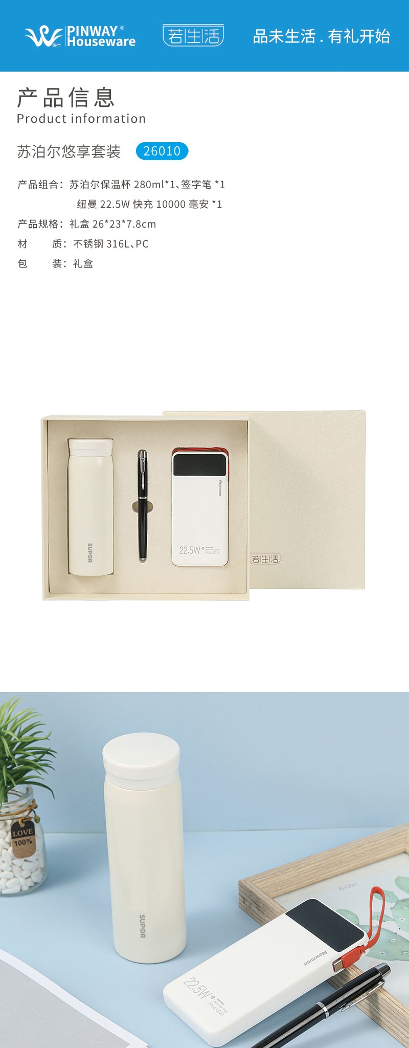 苏泊尔 316L 保温杯(安全材质 + 长效锁温);22.5W 快充移动电源(高功率快充解决用电焦虑);质感礼盒显用心:简约高级的礼盒包装