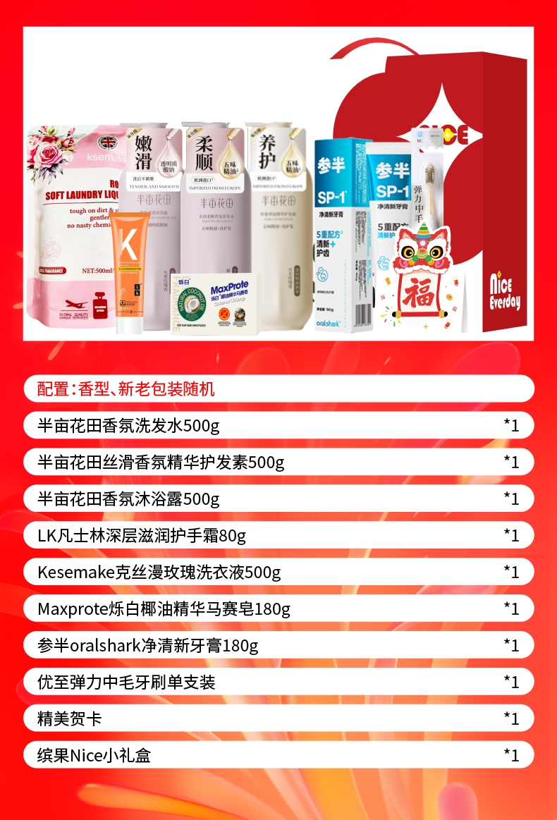 配置清单:半亩花田香氛洗发水500g*1 半亩花田丝滑香氛精华护发素500g*1 半亩花田香氛沐浴露500g*1 LK 凡士林深层滋润护手霜 80g*1 Kesemake克丝漫玫瑰洗衣液500g*1 Maxprote烁白椰油精华马赛皂180g*1 参半oralshark净清新牙膏180g*1 优至弹力中毛牙刷单支装*1 精美贺卡*1(量大可定制) 缤果Nice小礼盒ZS177*1