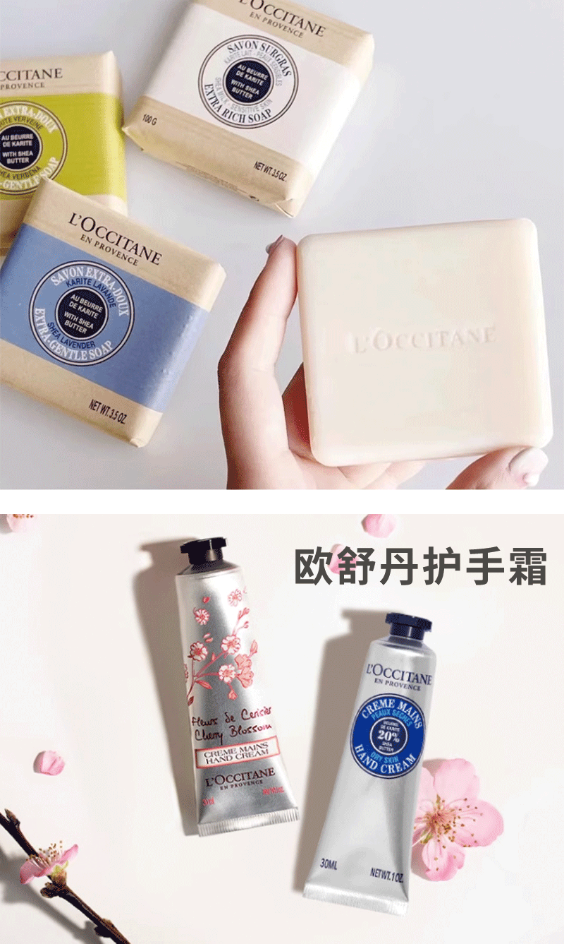 欧舒丹护手霜 + 香皂(大牌香氛,滋养舒缓);适配多场景的温柔好物;搭配欧舒丹的大牌质感 + 保温杯的实用