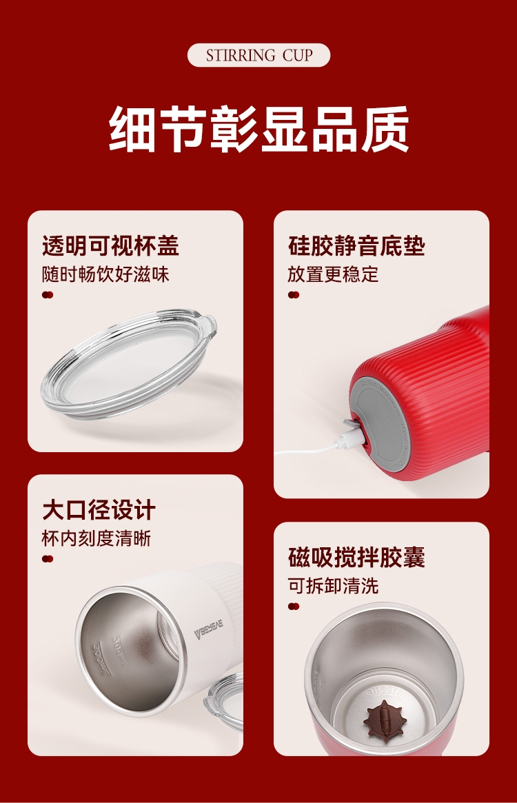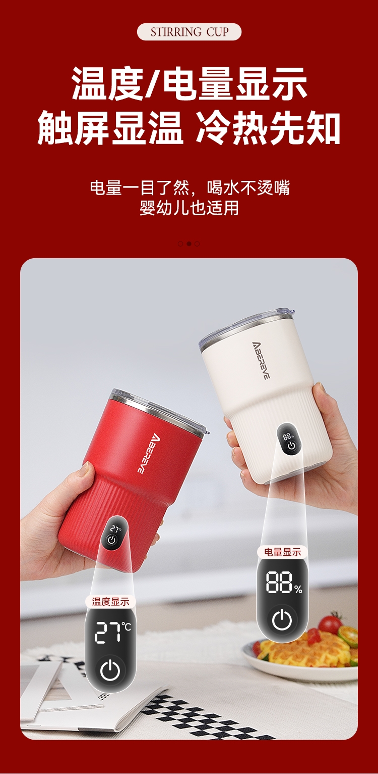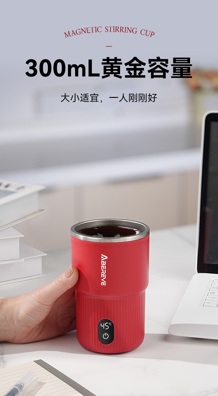 316不锈钢内胆300mL容量;一键启动搅拌功能,口感顺滑,均匀不结块;Type-C充电,充电方便,持久续航;贴心电量显示+温度显示