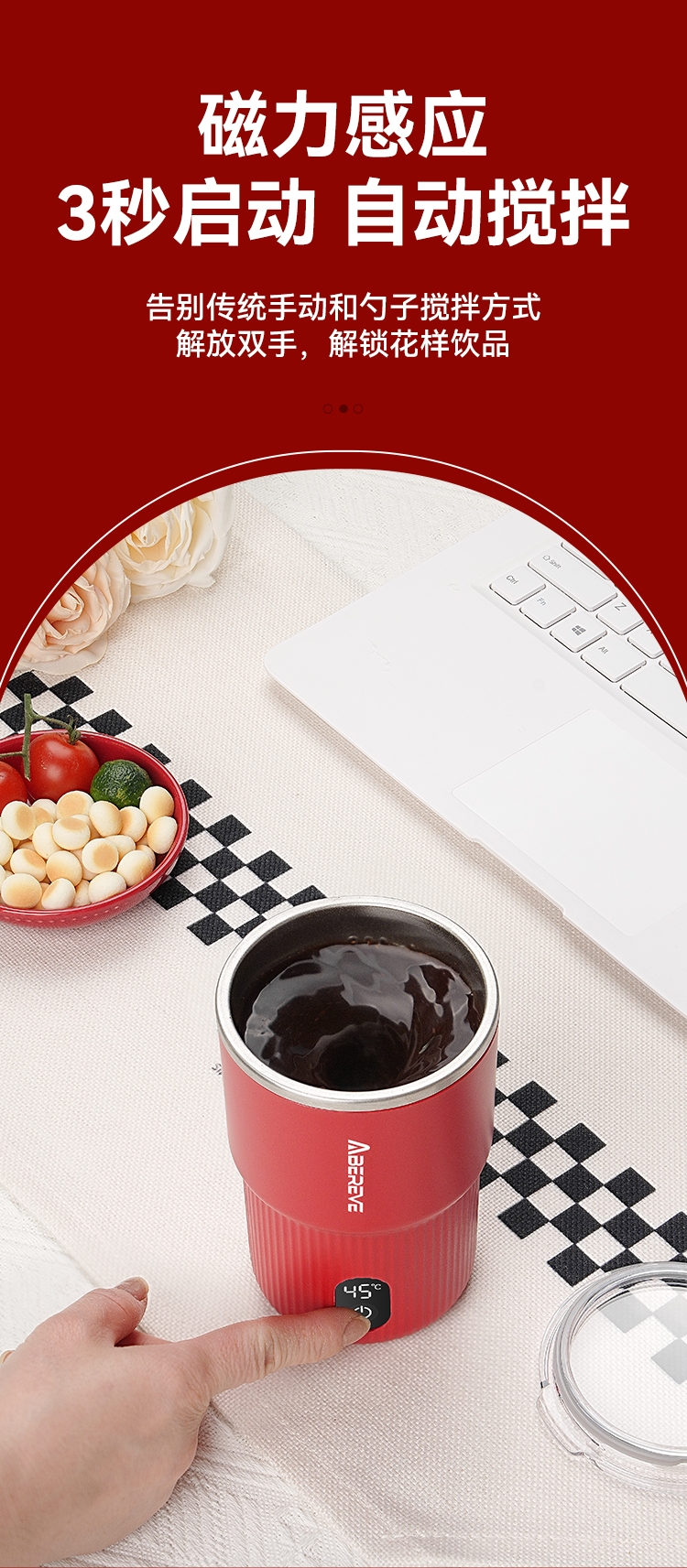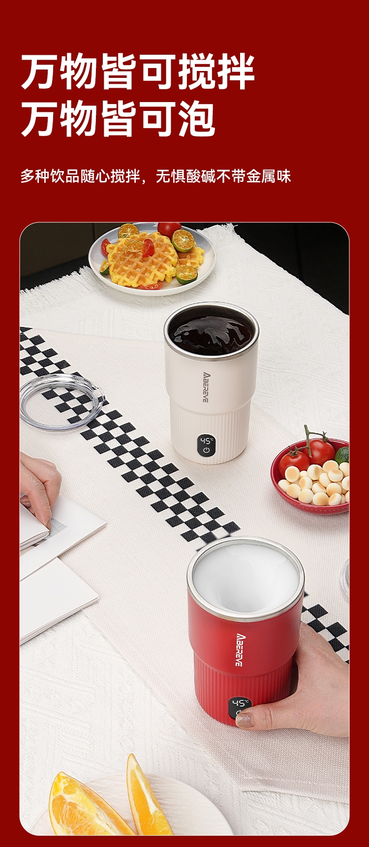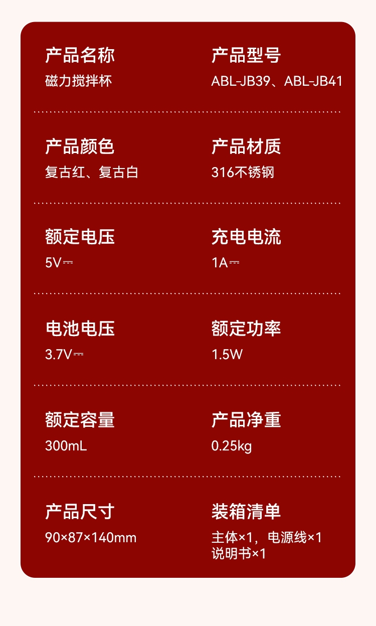 316不锈钢内胆300mL容量;一键启动搅拌功能,口感顺滑,均匀不结块;Type-C充电,充电方便,持久续航;贴心电量显示+温度显示