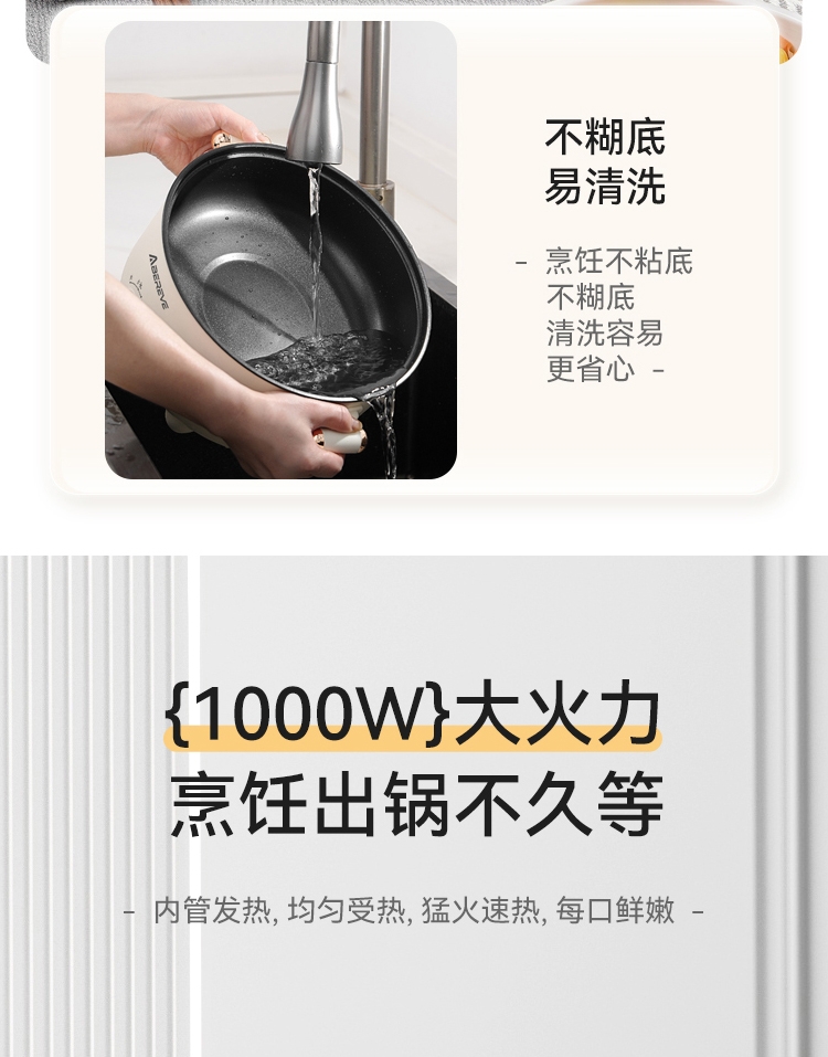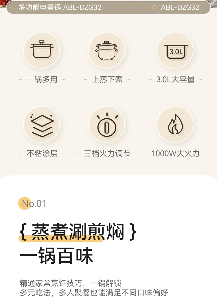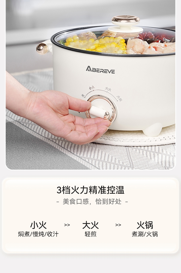 3.0L黄金比例容量,满足家庭所需;1000W大火力,三档火力调节,温度尽在掌控;一锅多用,上蒸下煮,沉浸式享受烹饪乐趣