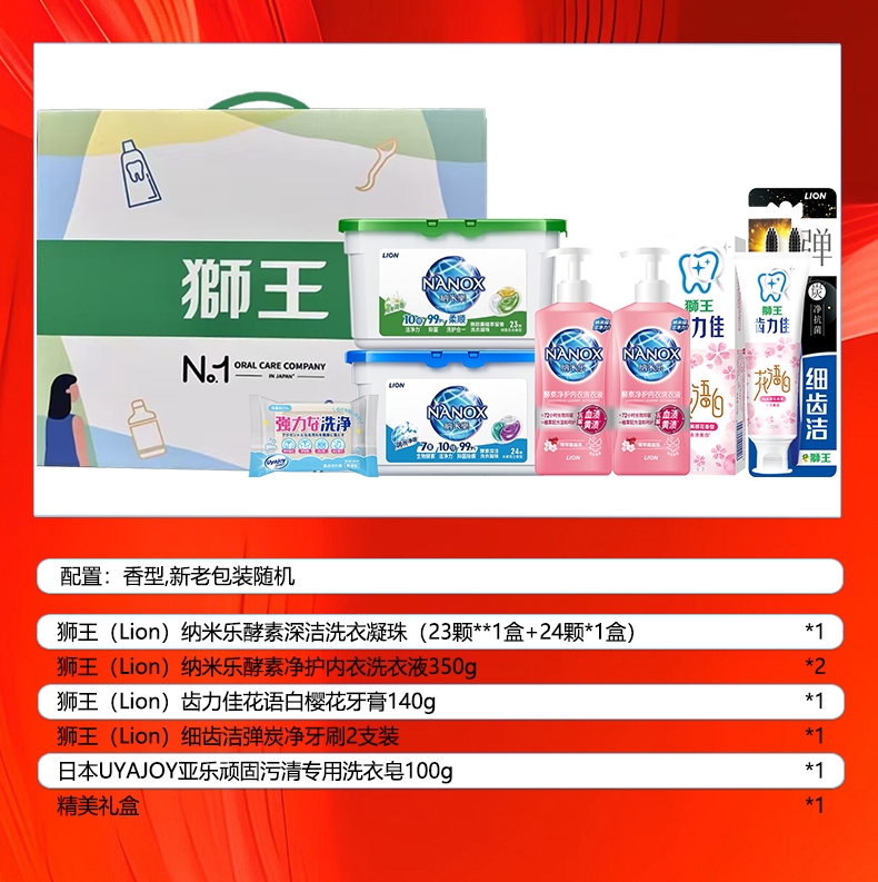 配置清单:狮王(Lion)纳米乐酵素深洁洗衣凝珠(24颗*2盒)*1(零售价79.8元) 狮王(Lion)纳米乐酵素净护内衣洗衣液350g*2 狮王(Lion)齿力佳花语白樱花牙膏140g*1 狮王(Lion)细齿洁弹炭净牙刷2支装*1 日本UYAJOY亚乐顽固污清专用洗衣皂100g*1 狮王精美彩盒shiwang122*1