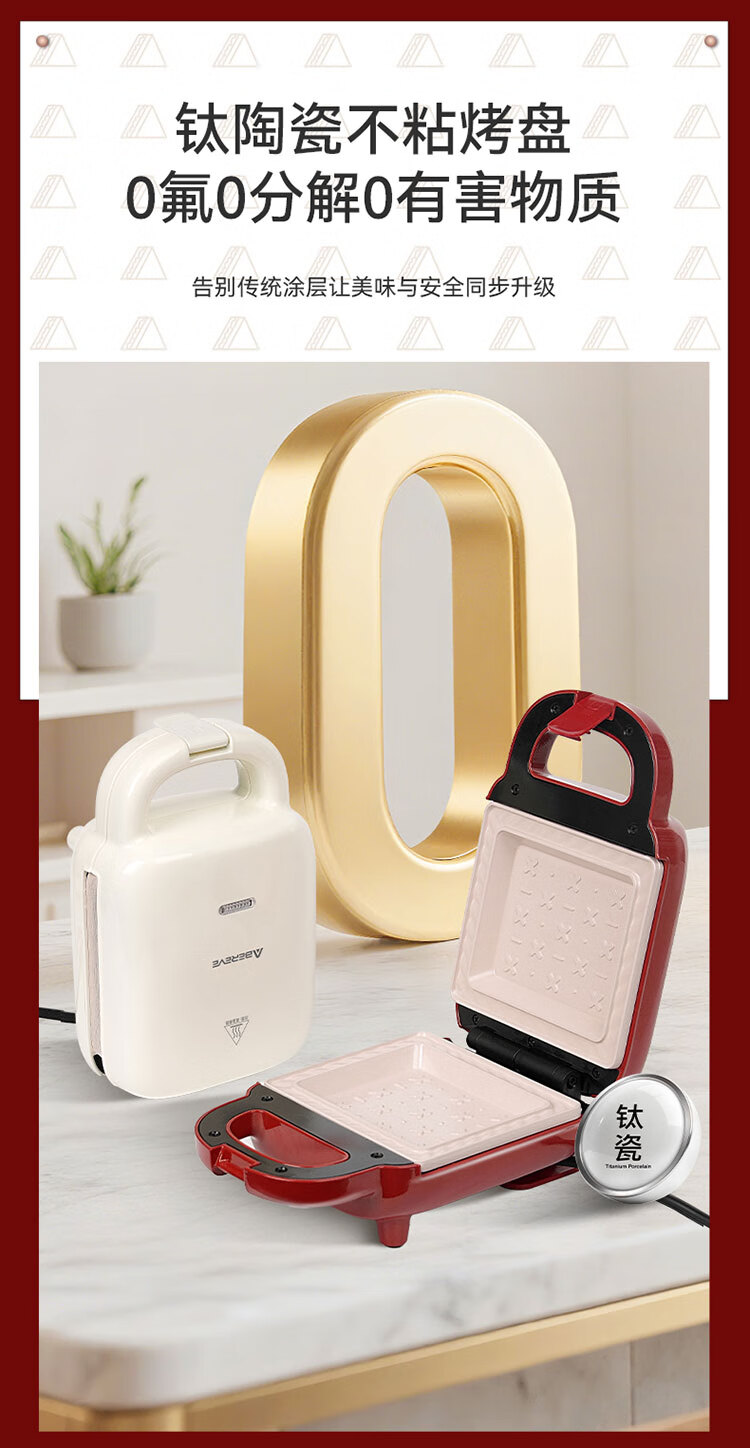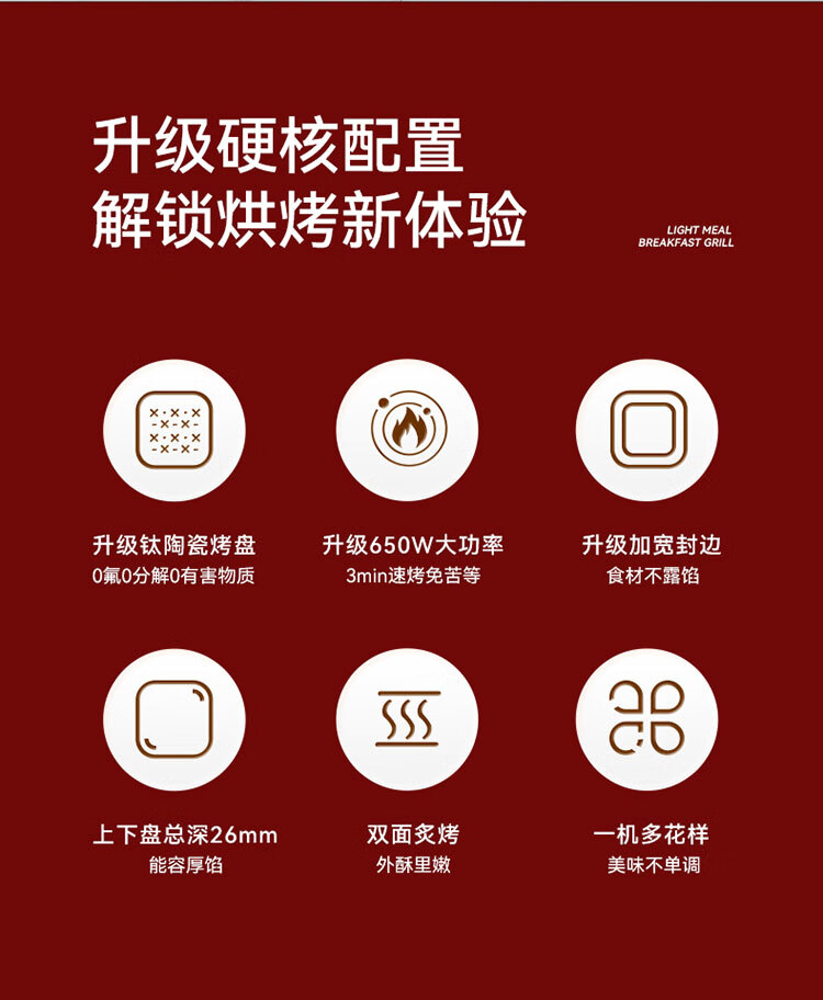 铝合金+钛陶瓷涂层不沾盘,安全稳定耐用易清洗;一机多样,多款美食轻松搞定;两档可调,上下同步加热,3min高温速烤