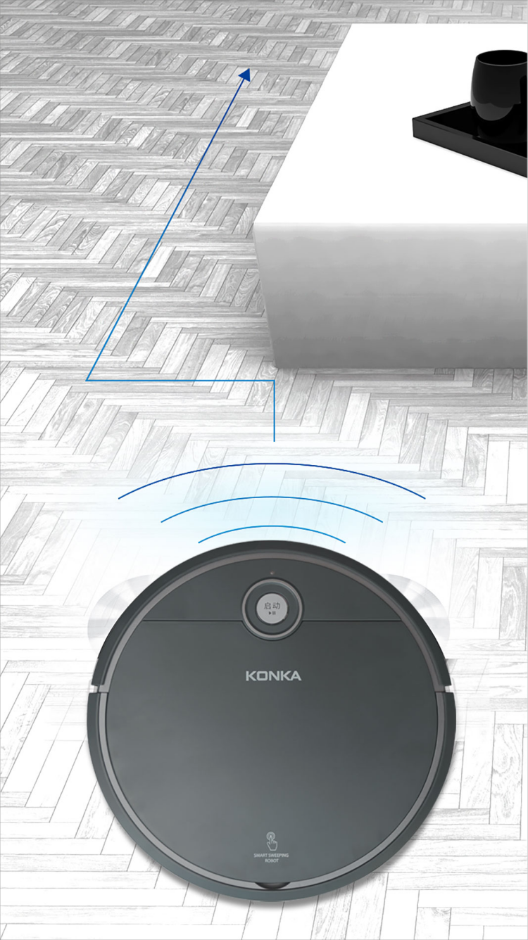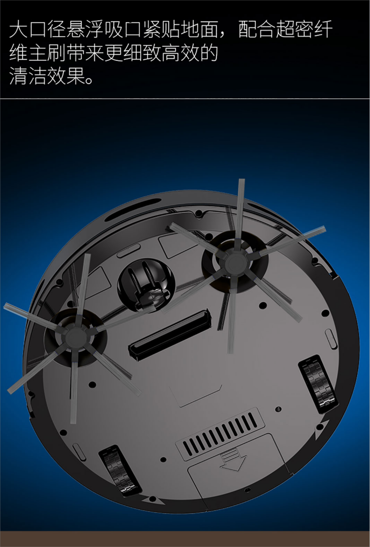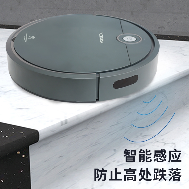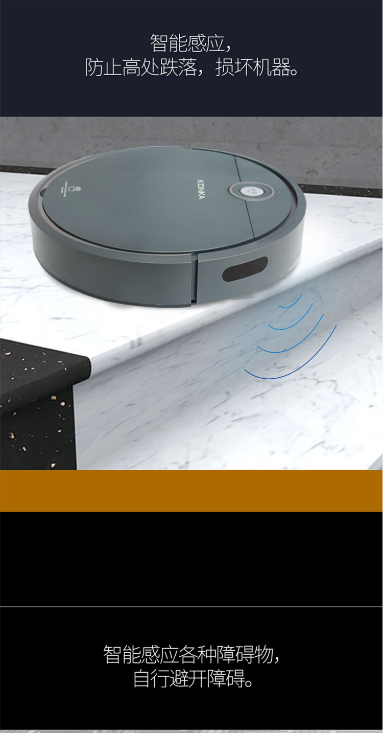 扫地机器人 轻松清理毛发灰尘颗粒杂物;智能感应,防止高处跌落,损坏机器。;智能感应各种障碍物,自行避开障碍。