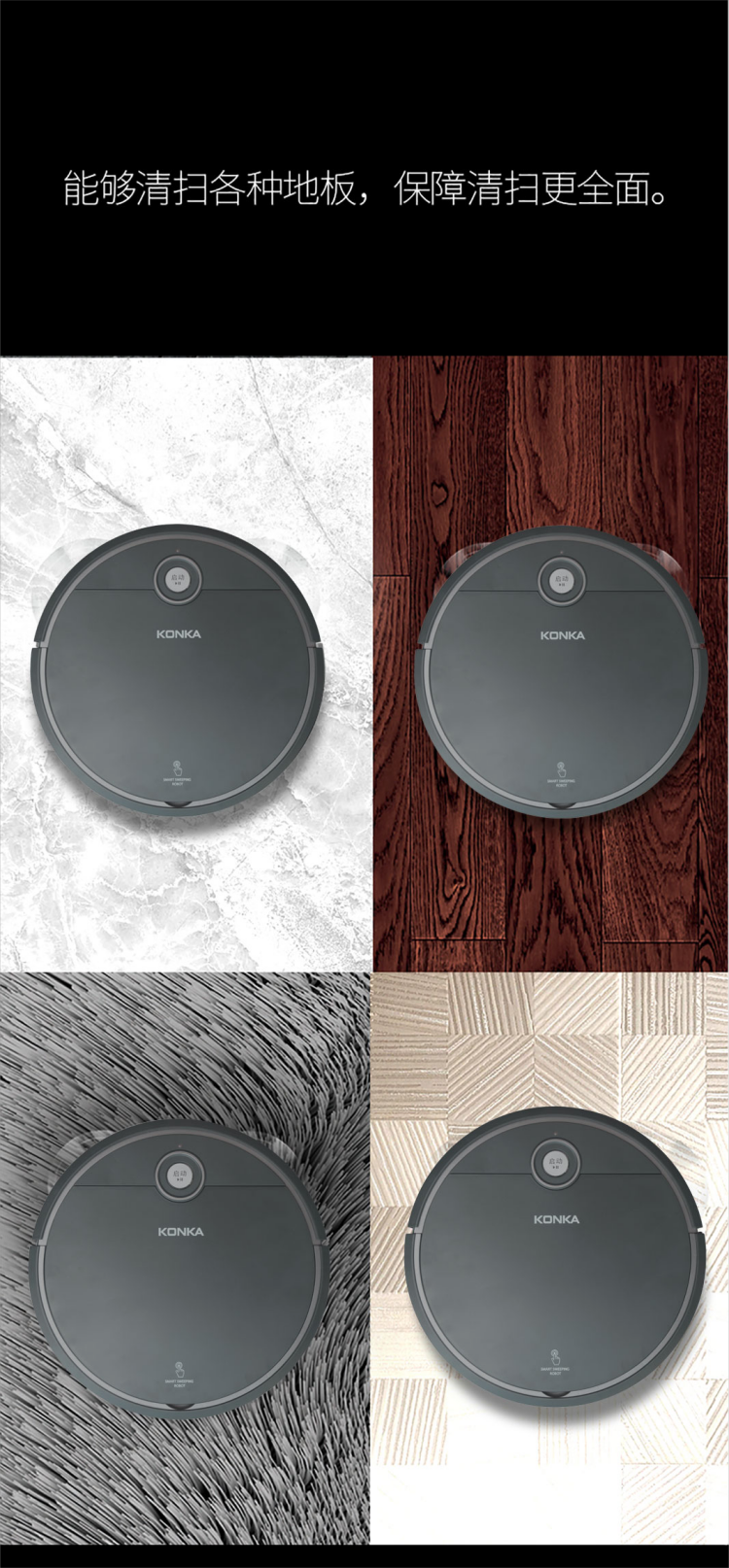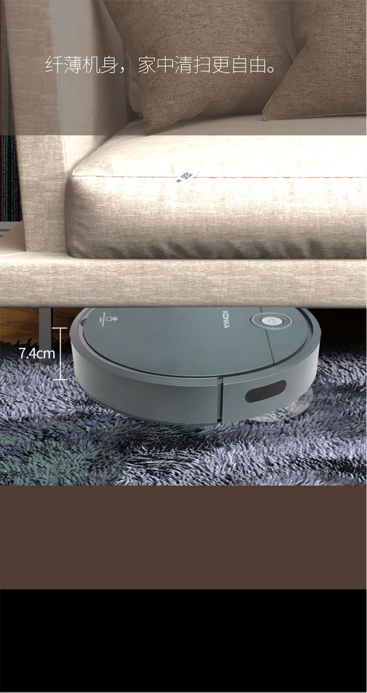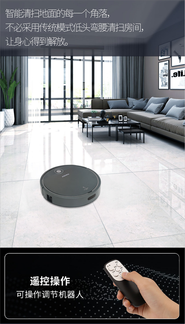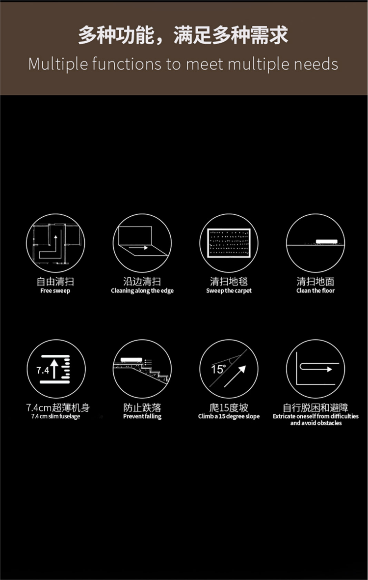 扫地机器人 轻松清理毛发灰尘颗粒杂物;智能感应,防止高处跌落,损坏机器。;智能感应各种障碍物,自行避开障碍。
