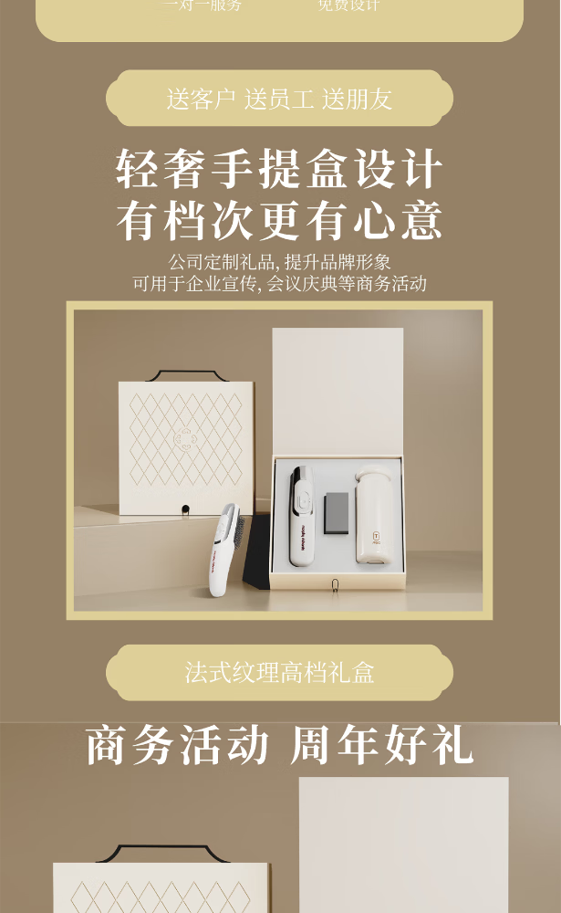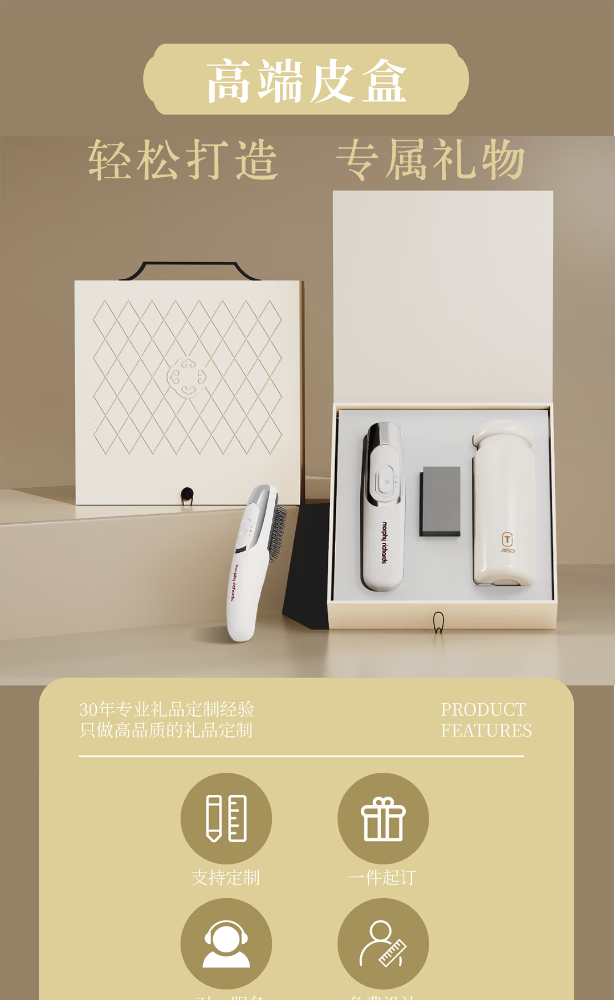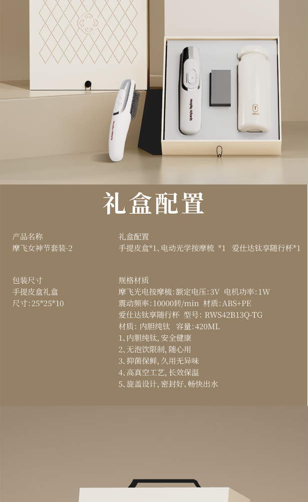 电动光学按摩梳:红光微电流,养发护头皮;爱仕达钛享随行杯:纯钛锁鲜,保温无异味;手提皮盒:精致收纳,便携送礼有面