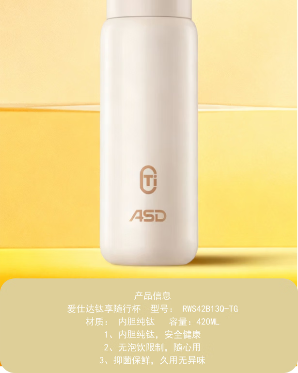 爱仕达钛享随行杯:型号: RWS42B13Q-TG 材质: 内胆纯钛 容量:420ML