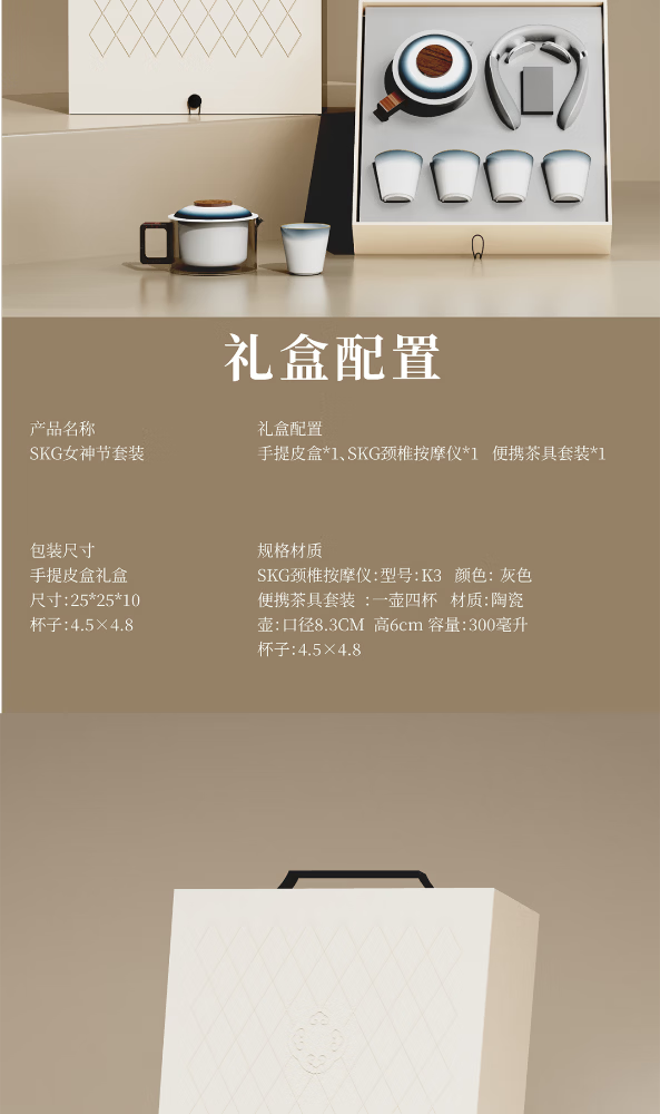 配置清单:手提皮盒*1、SKG颈椎按摩仪*1 便携茶具套装*1