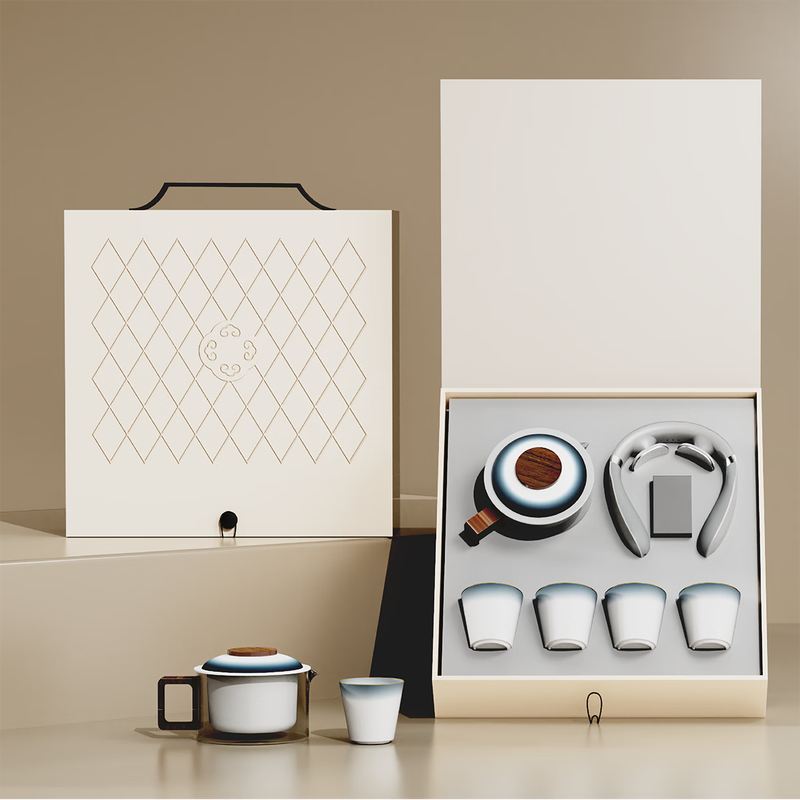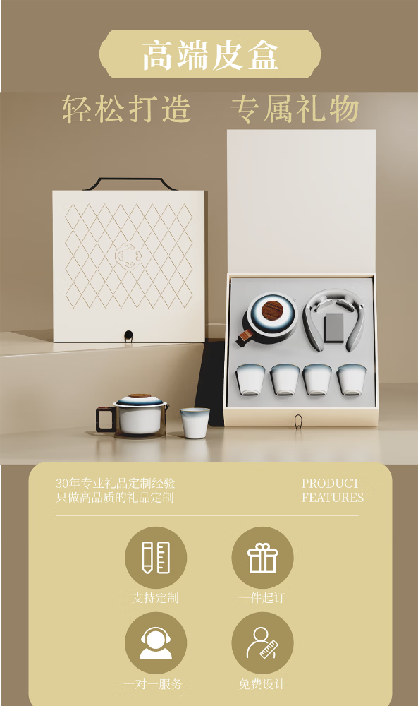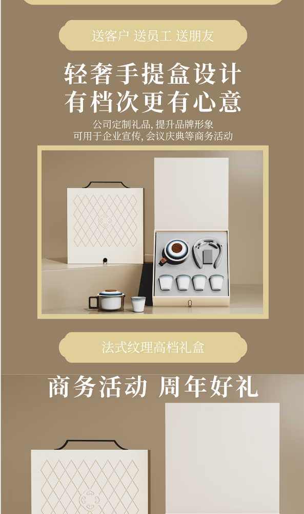 颈椎按摩仪:脉冲热敷,便携护颈无忧;便携茶具套装:收纳小巧,随行享茶雅趣;手提皮盒:质感收纳,送礼体面实用