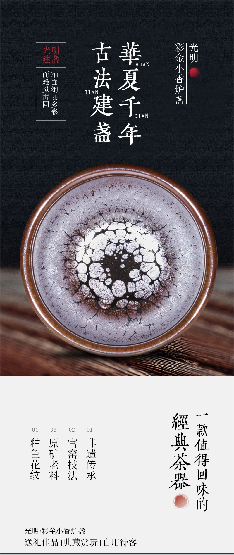 「彩金釉 + 香炉型」颜值暴击;「聚香锁味 + 不挂茶渍」实用为王;「非遗工艺 + 握感适配」品质细节