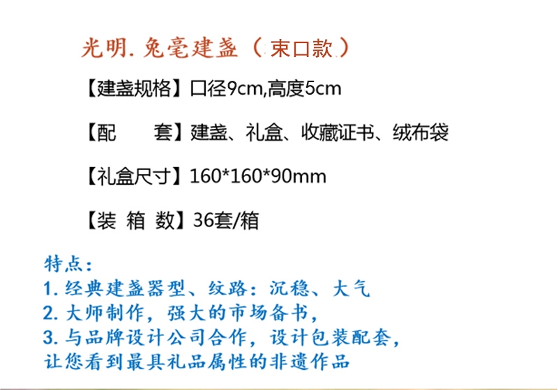 经典束口 + 兔毫纹理,颜值与辨识度拉满」;「非遗工艺 + 高含铁胎,茶感与质感双优」;「釉面致密 + 易清洁,传统质感适配现代生活」