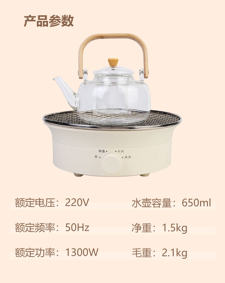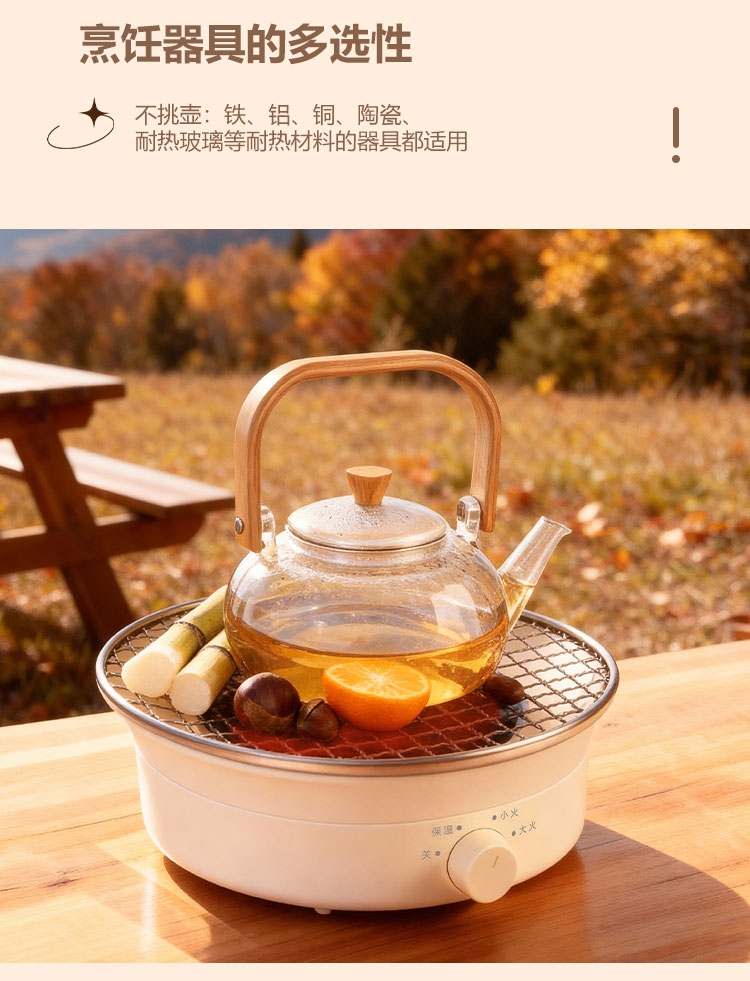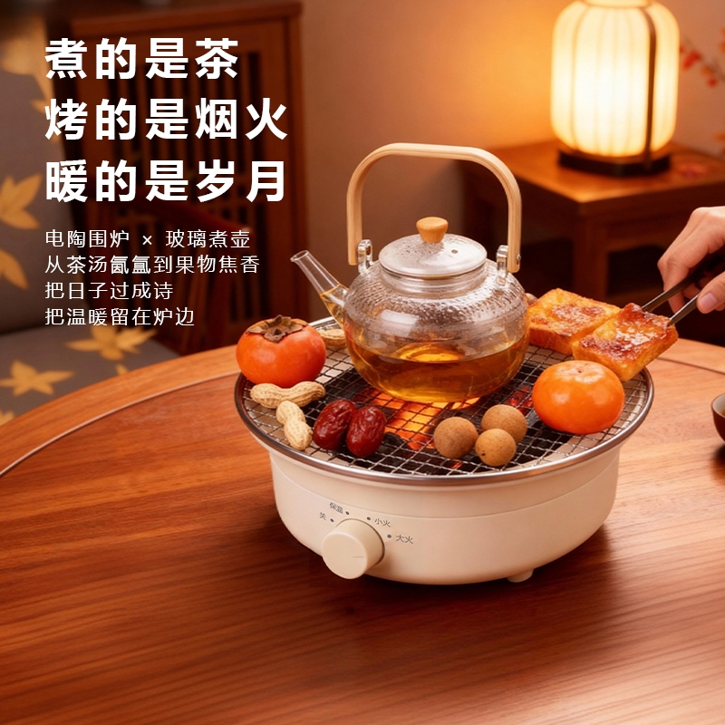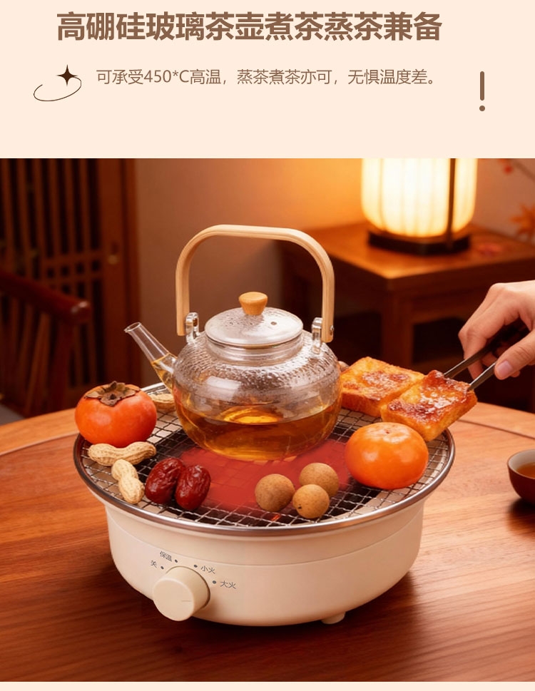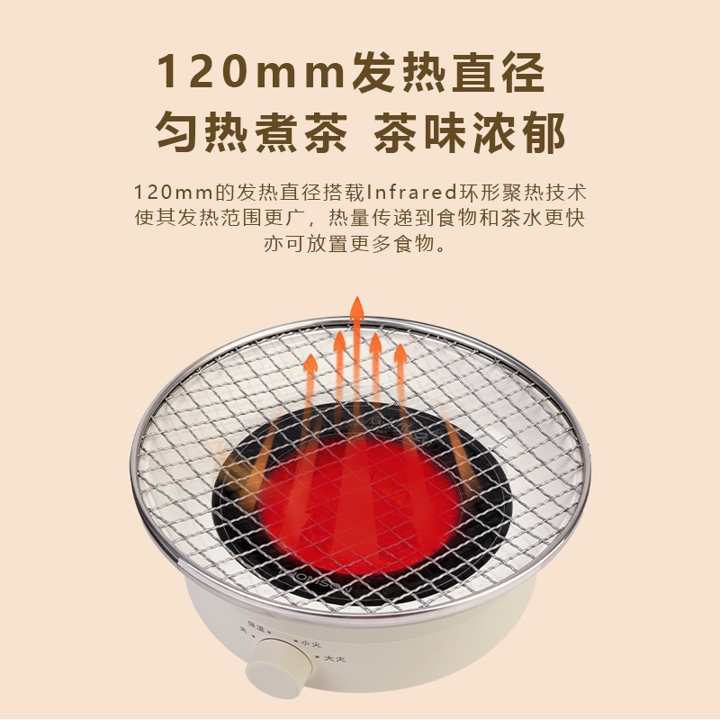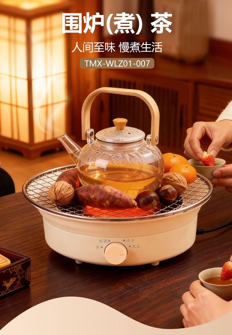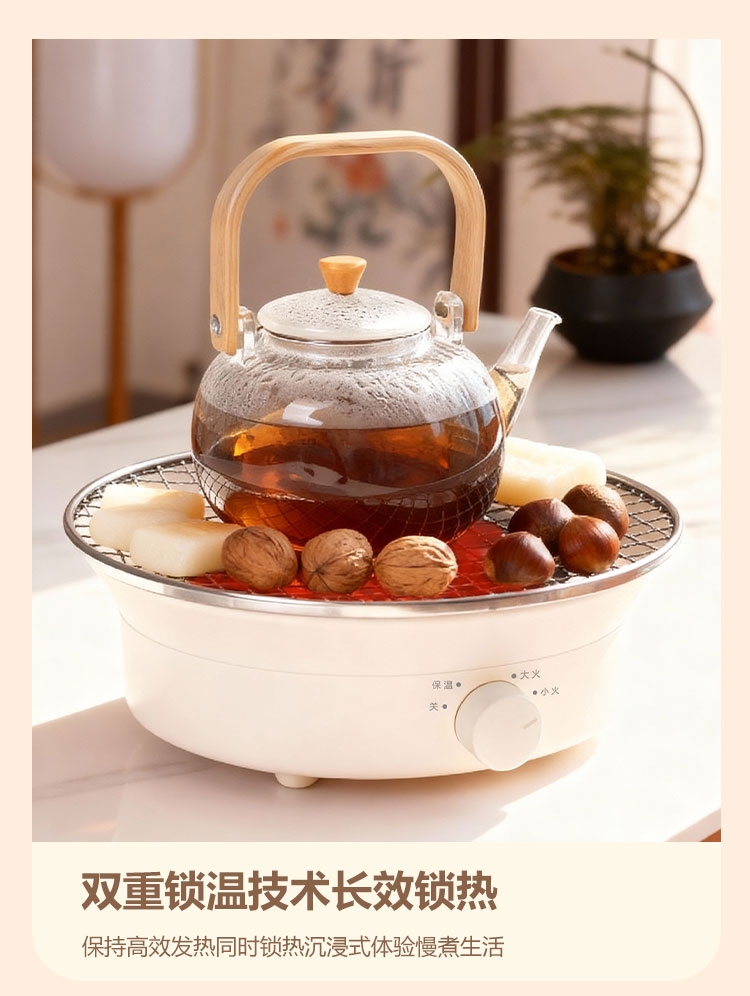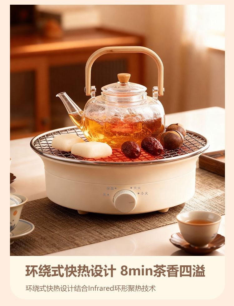外观精美,结构稳定,围炉煮茶十分惬意;1300W功率,烧水泡茶,烤干果,两不误;旋钮操控,简单清晰,适用面广
