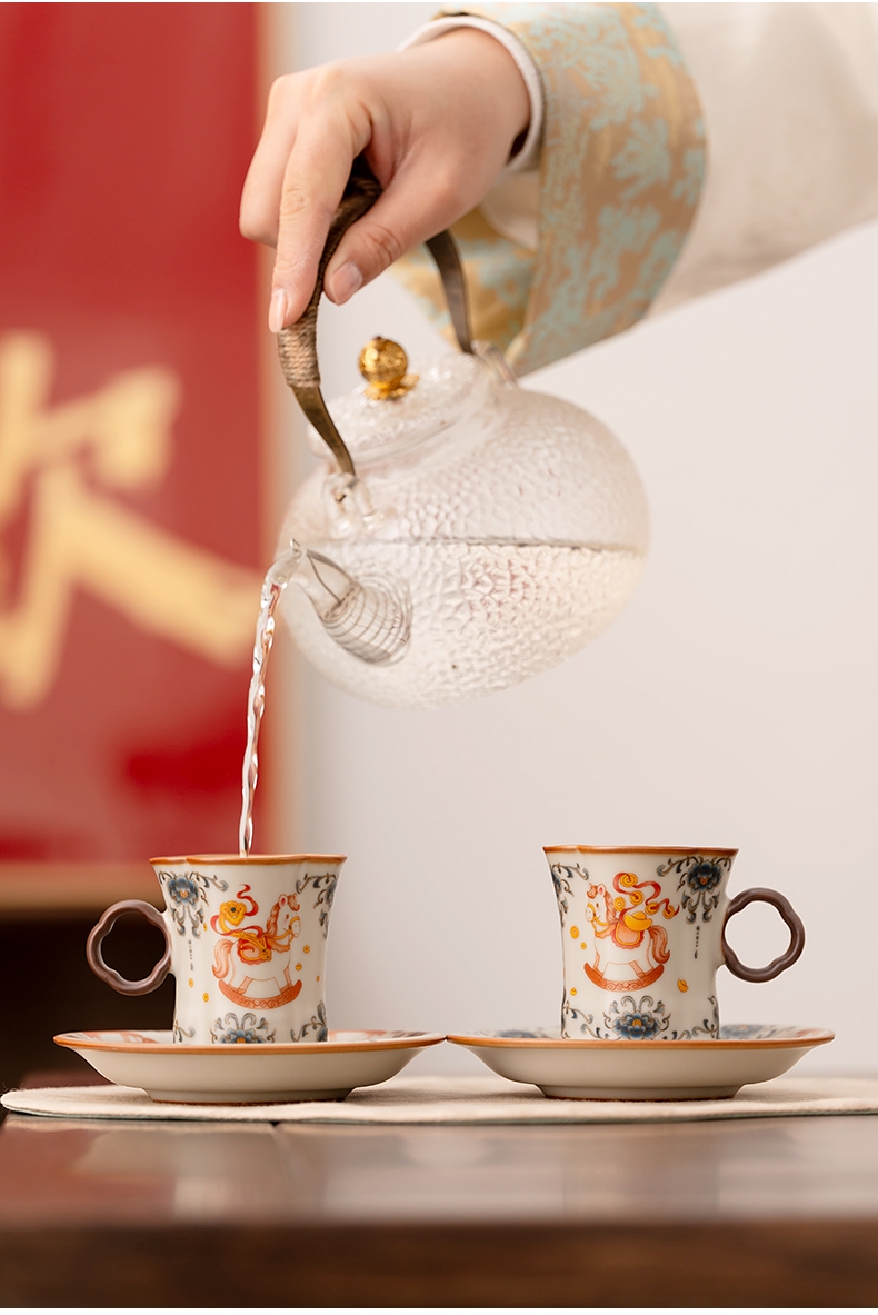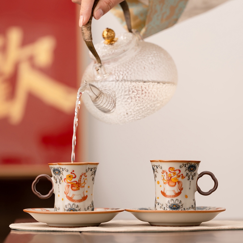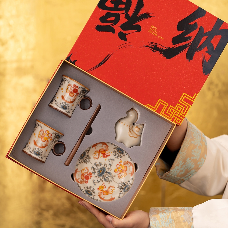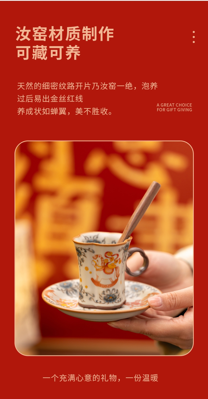 马年开门红礼品,马上有钱杯子摆件套装,马背上葫芦;寓意福禄,2盘高档大气。亚黄汝瓷,玛瑙入釉蝉翼开片;内外皆有花面,家有千财万贯,不如汝窑一片。独家专利