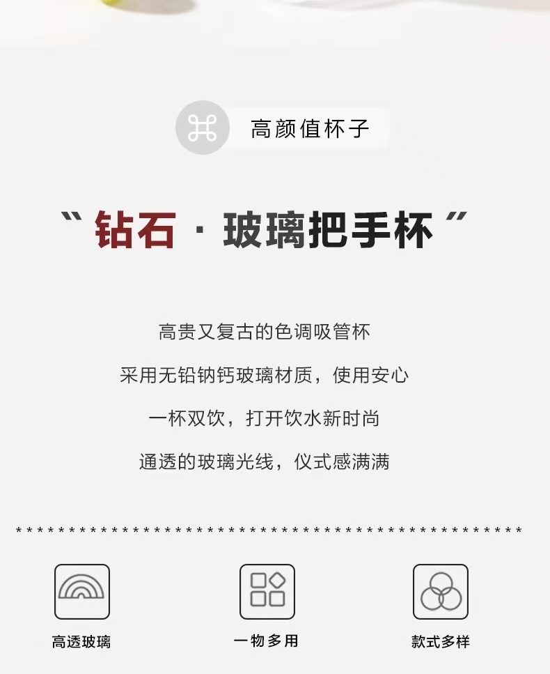 无铅安全玻璃,获得国家质检检测报告合格证书。;玻璃吸管,使用安全方便。;独特的花纹设计,美观大方。