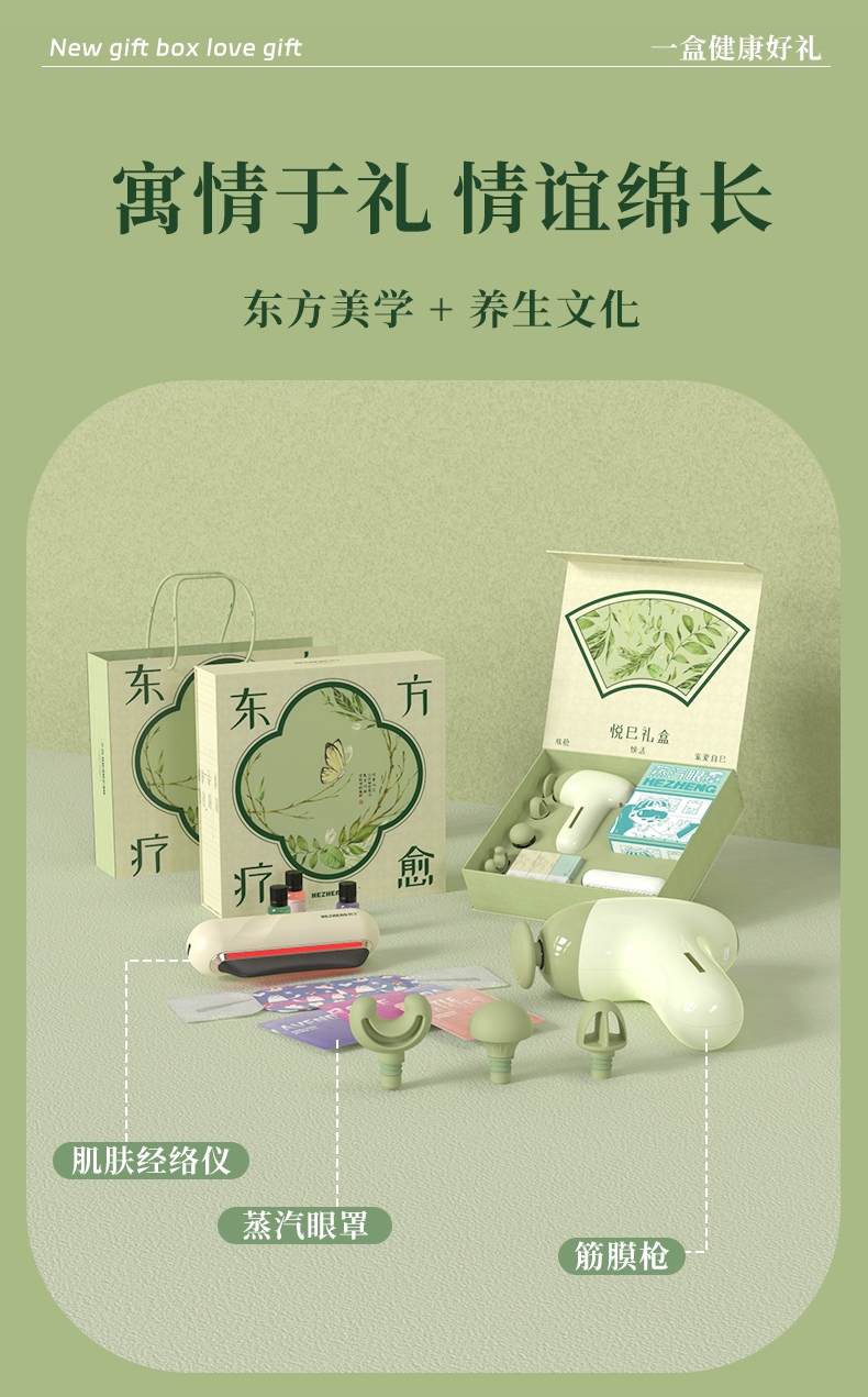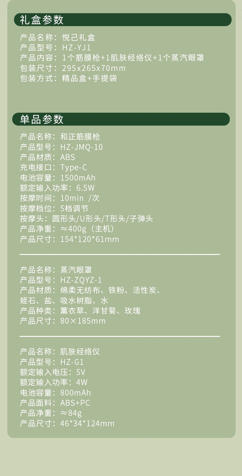 礼盒内容:肌肤经络仪 HZ-G1 筋膜枪 HZ-JMQ-10 蒸汽眼罩 HZ-ZQYZ-1 精品盒+手提袋
