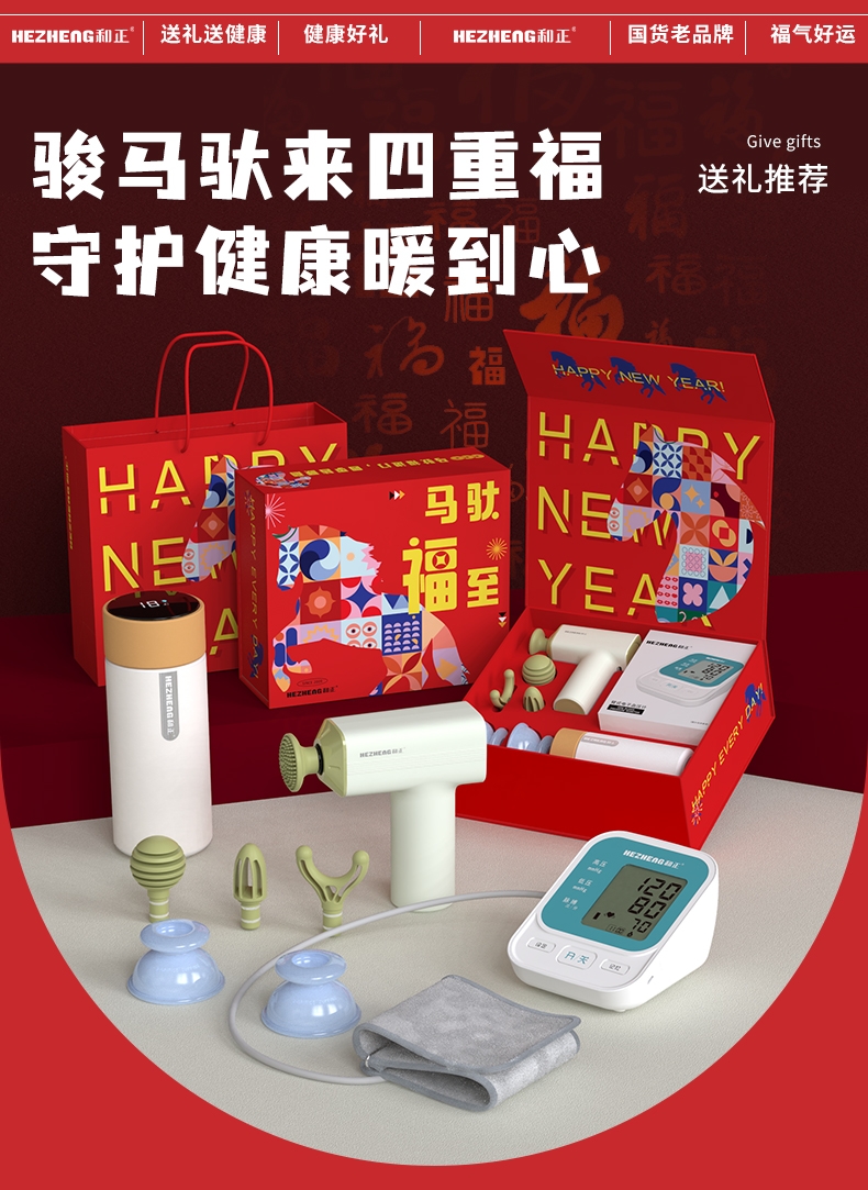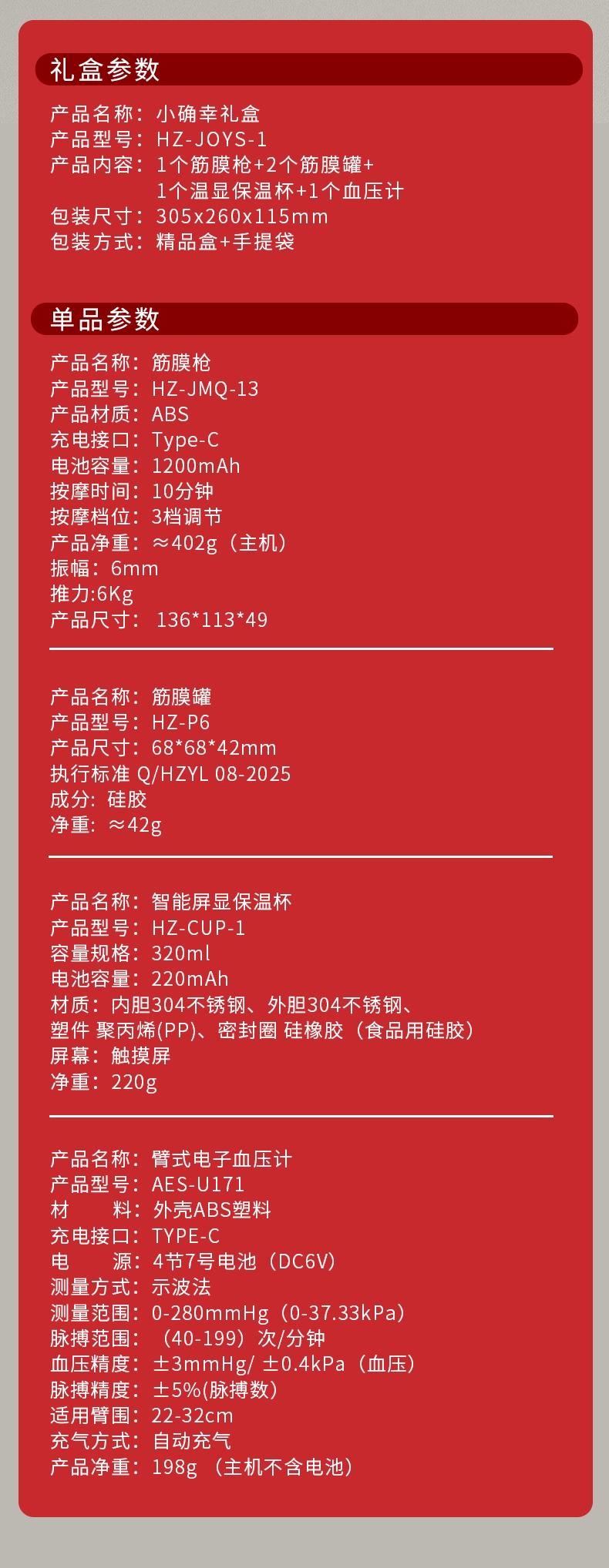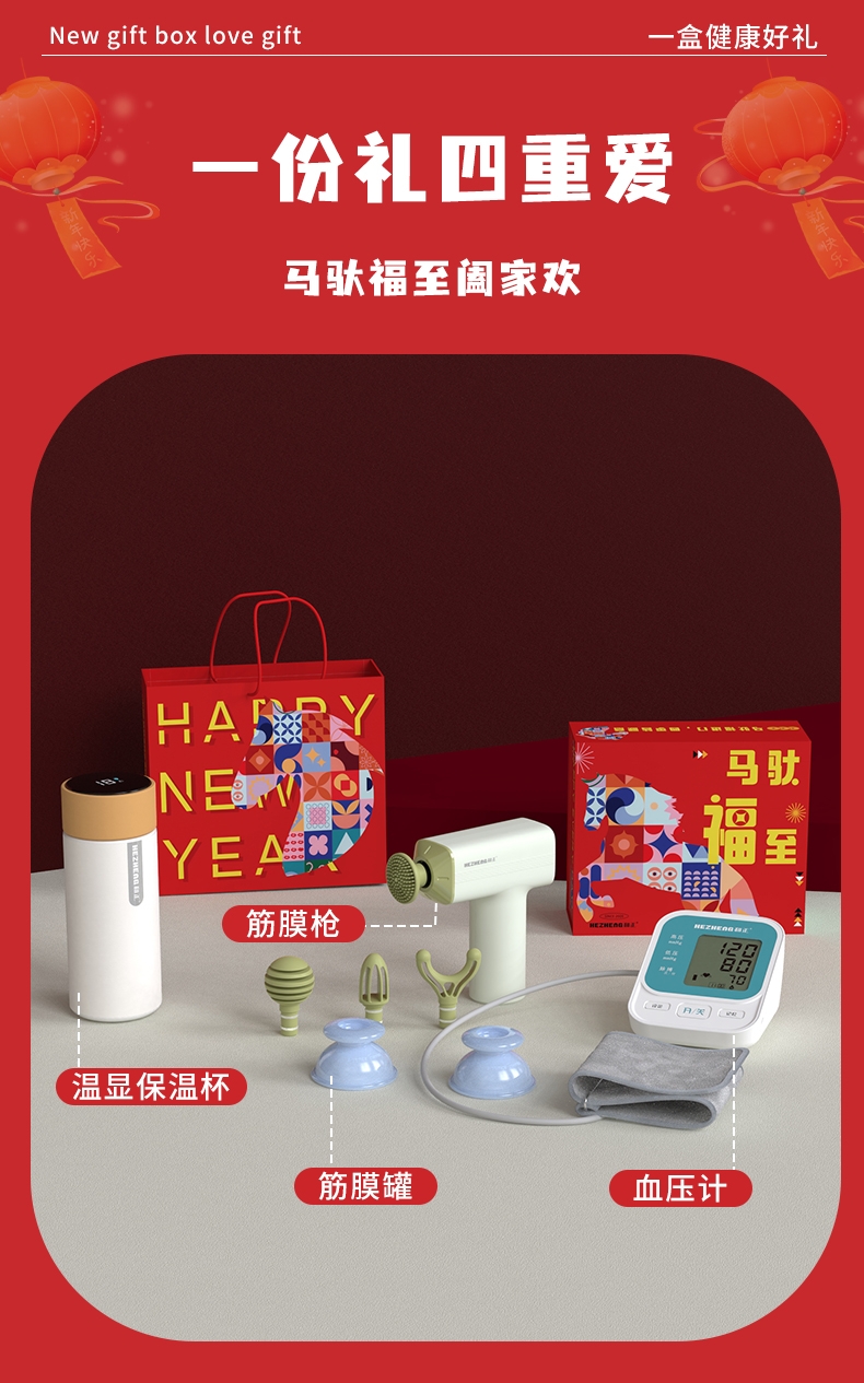 礼盒内容:臂式电子血压计 HZ-AES-U171 筋膜罐HZ-P6 筋膜枪 HZ-JMQ-13 智能温显杯 HZ-CUP-1