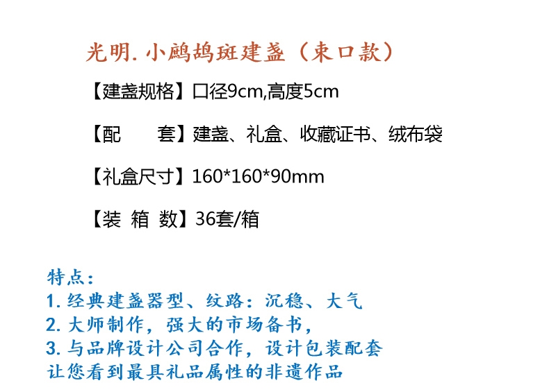 鹧鸪斑纹 + 束口器型,颜值与实用双在线;釉面致密 + 百搭场景,传统茶器适配现代生活;非遗工艺 + 高含铁胎,茶感与质感双重加持