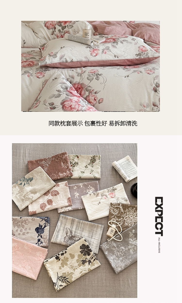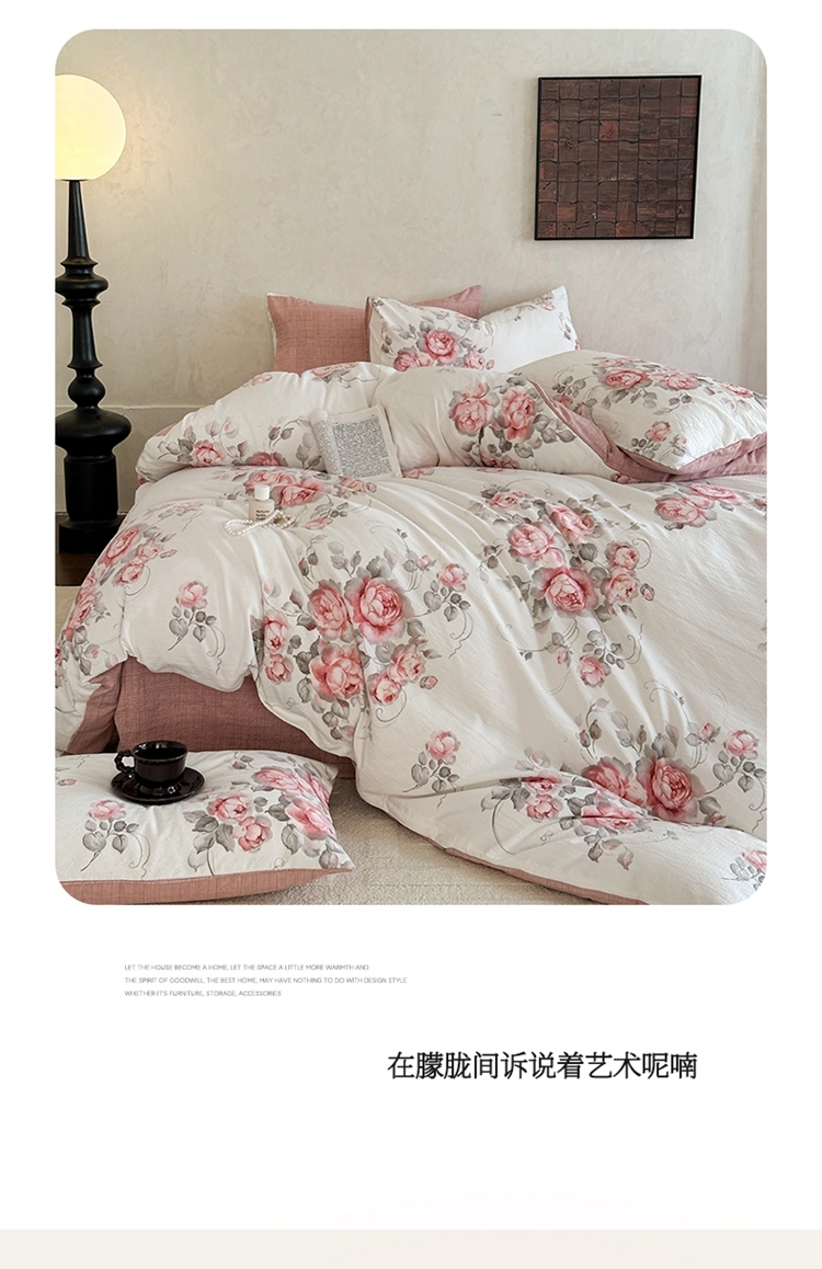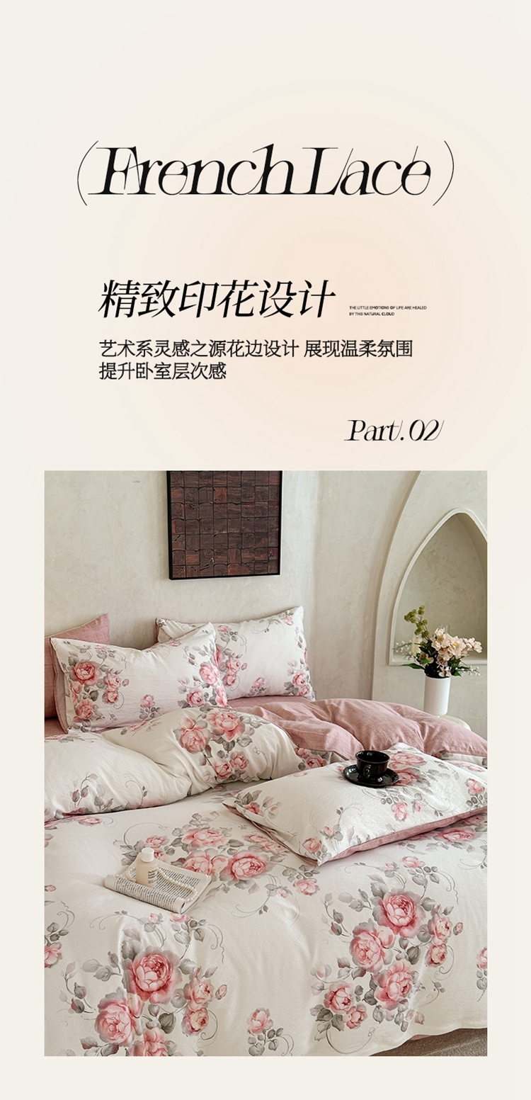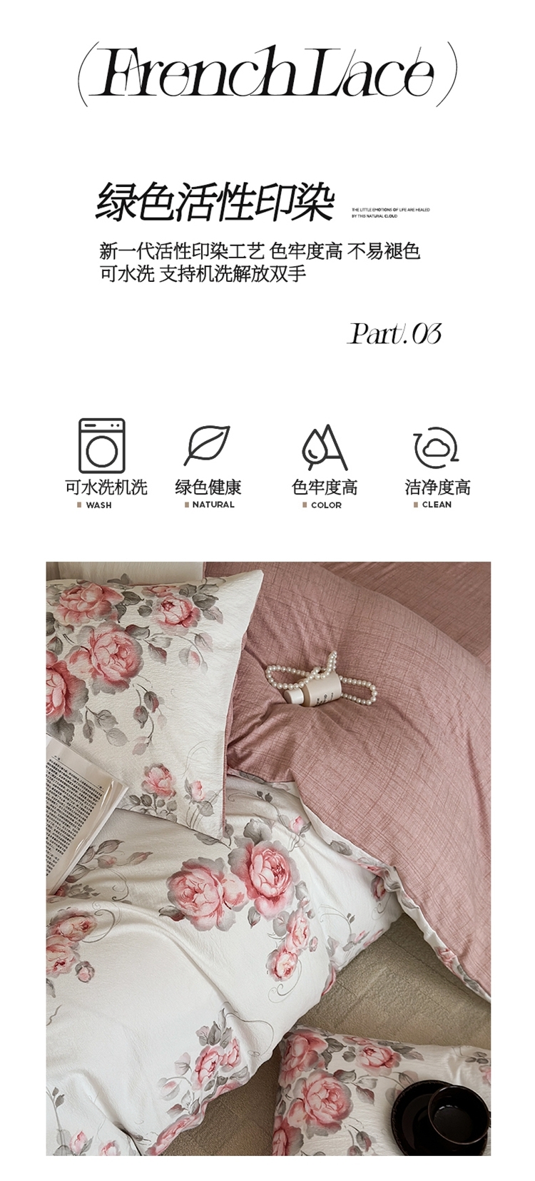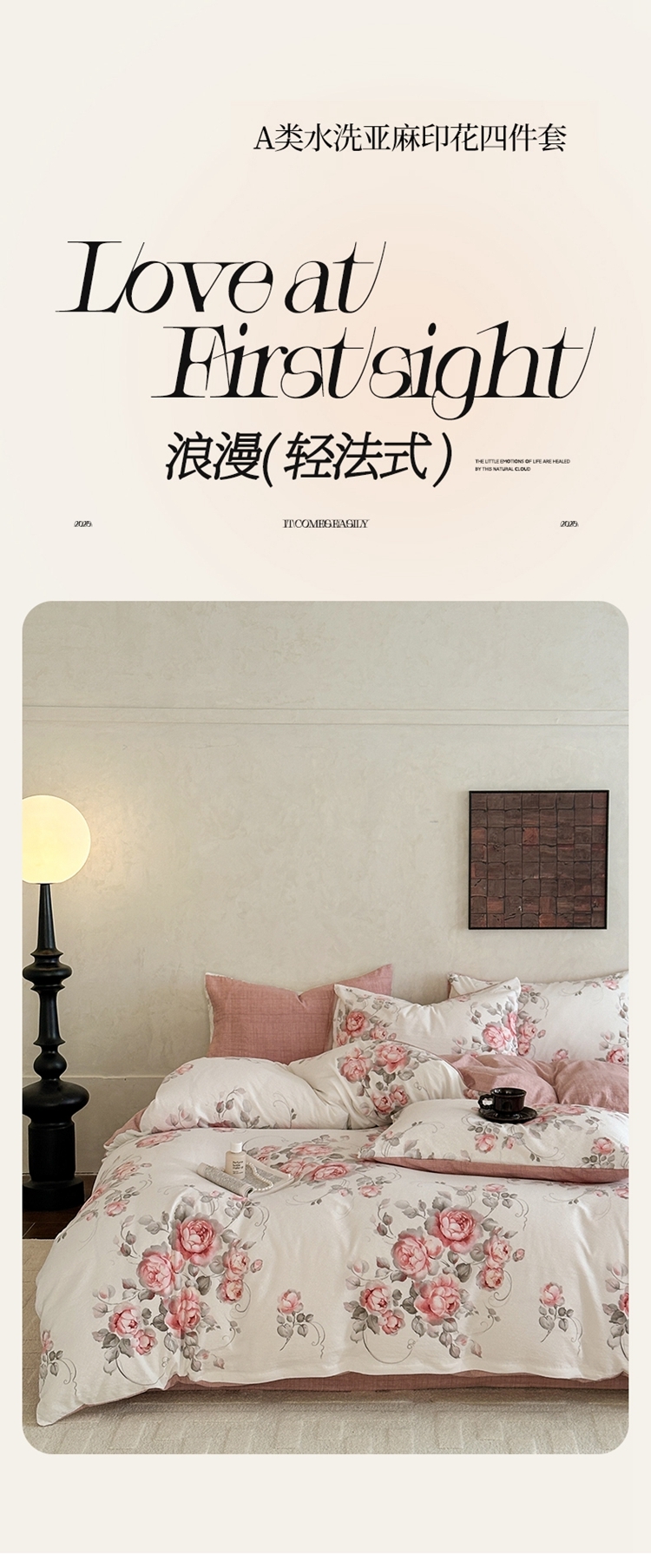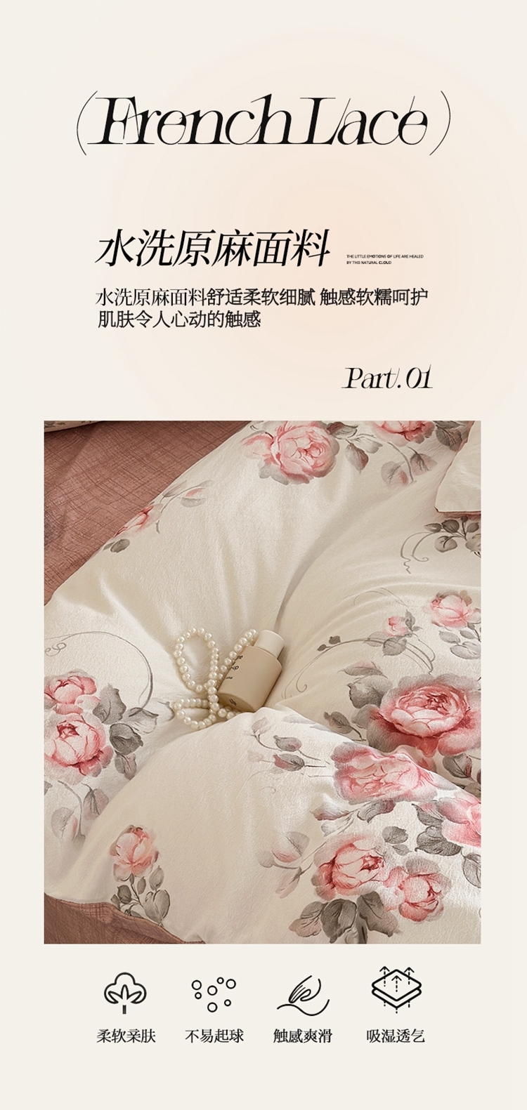 水洗原麻面料舒适柔软细腻 触感软糯呵护肌肤令人心动;艺术系灵感之源花边设计展现温柔氛围提升卧室层次感;新一代活性印染工艺色牢度高不易褪色可水洗支持机洗解
