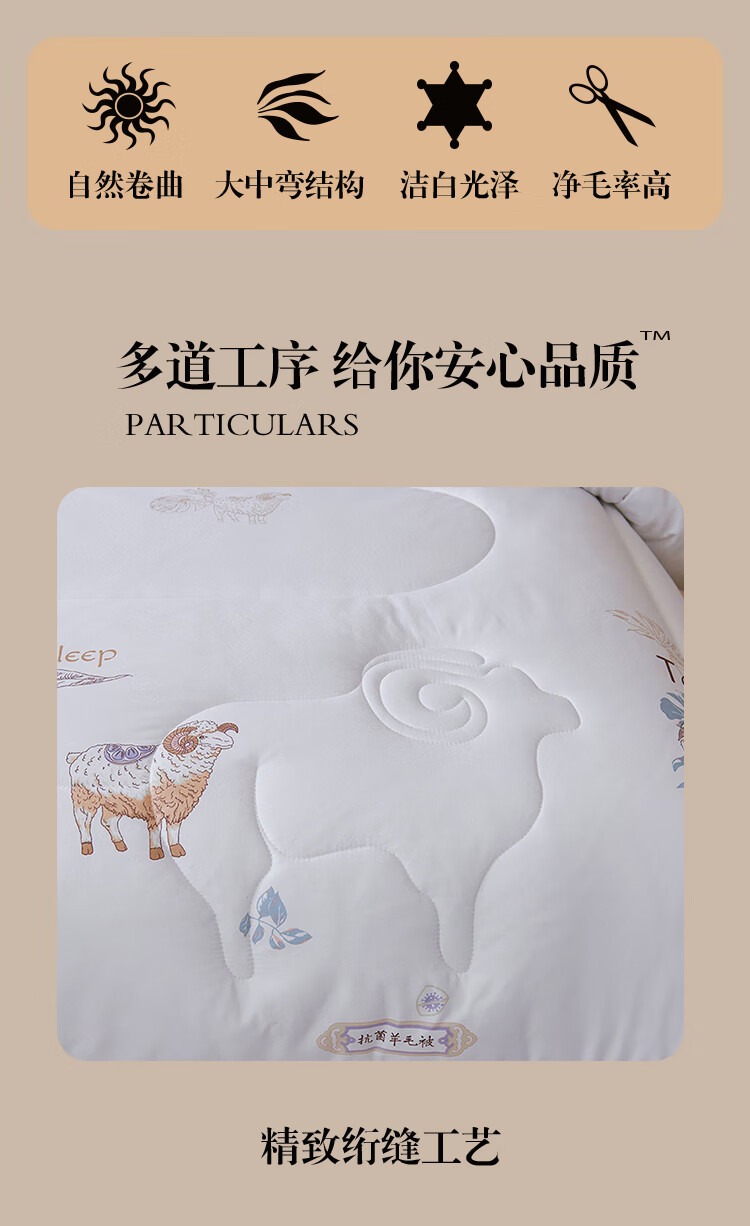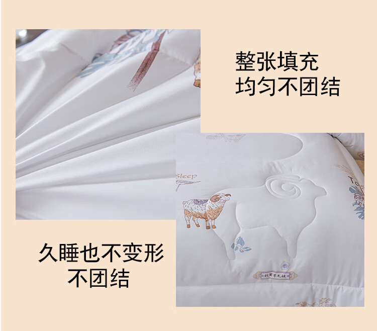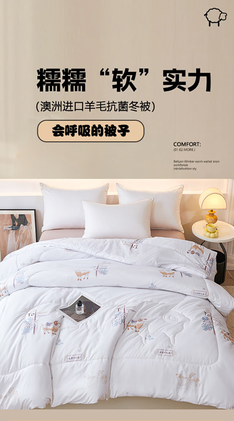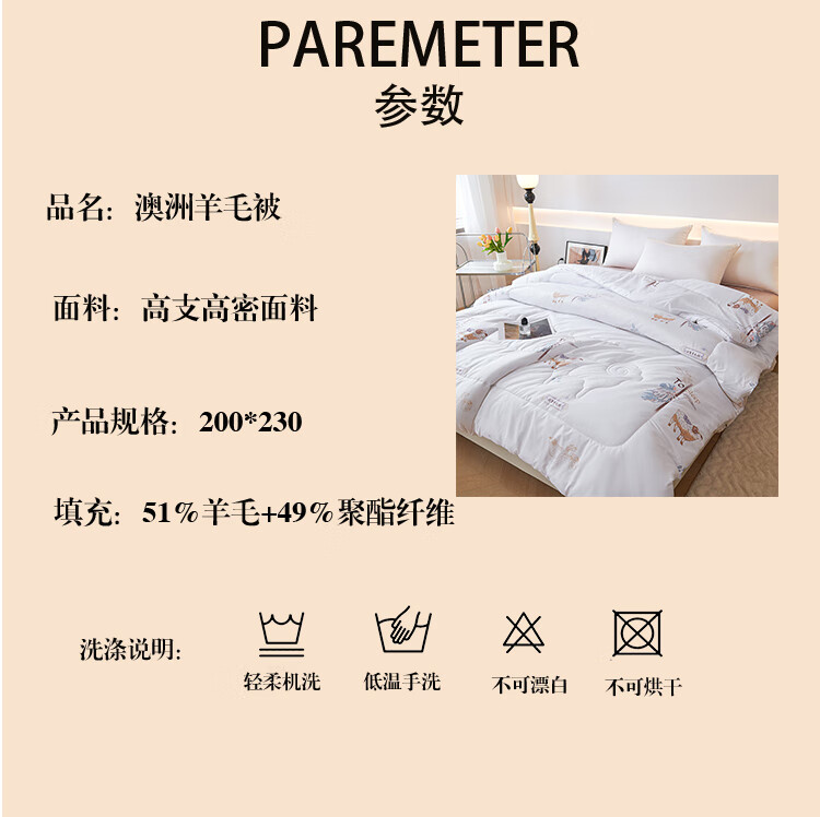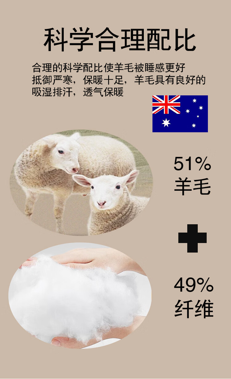 这款填充51% 的精准羊毛含量;规避了纯羊毛被易板结、难护理的痛点;让天然羊毛的温控魔力得到充分释放