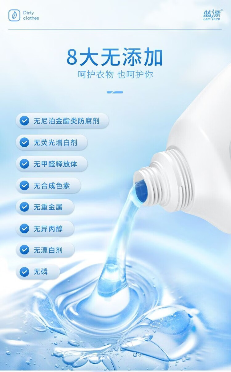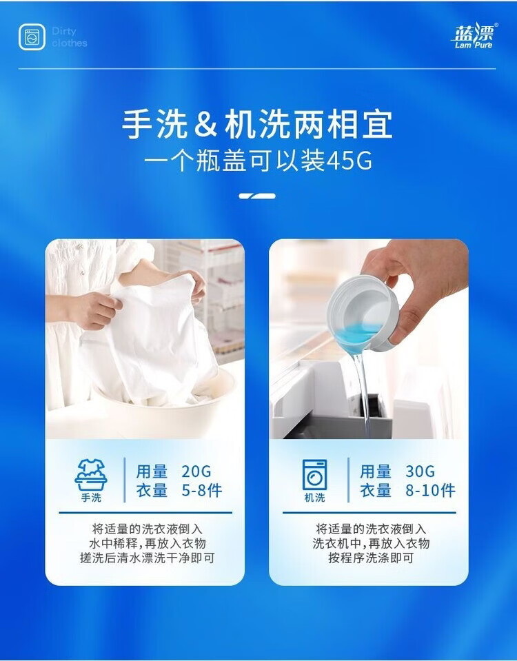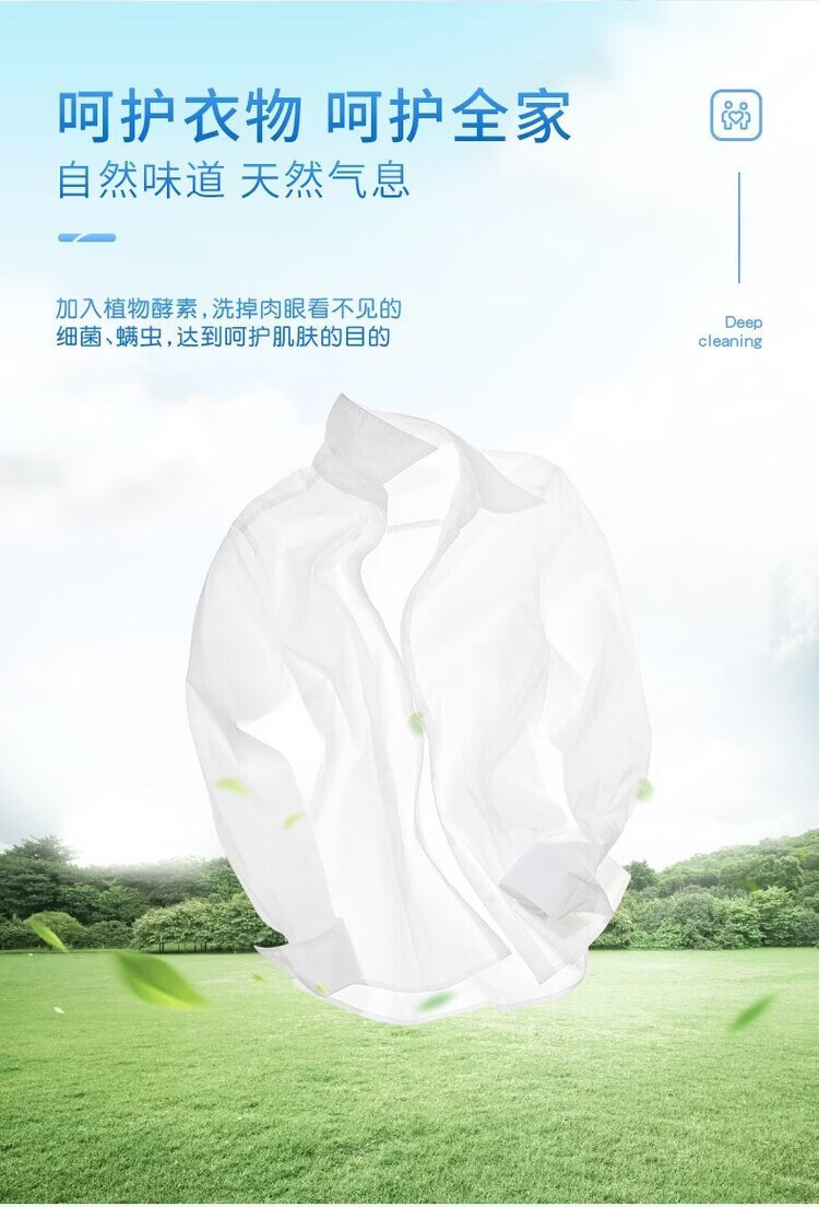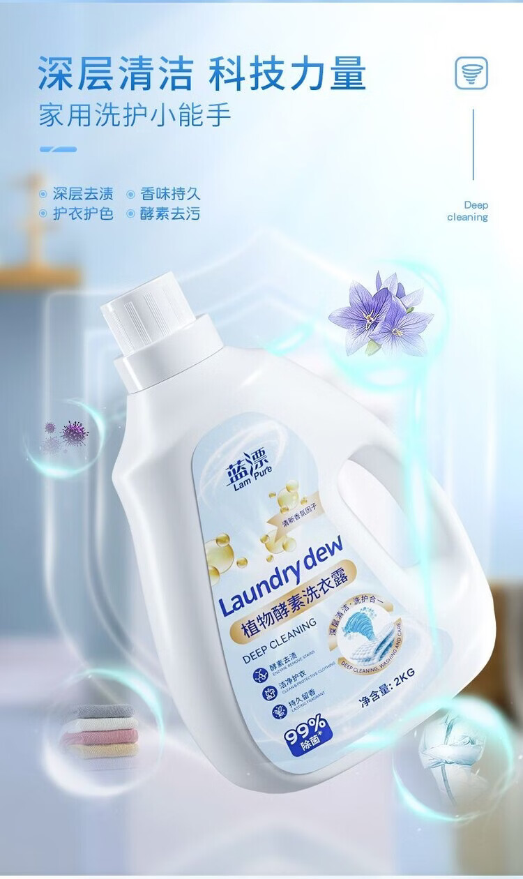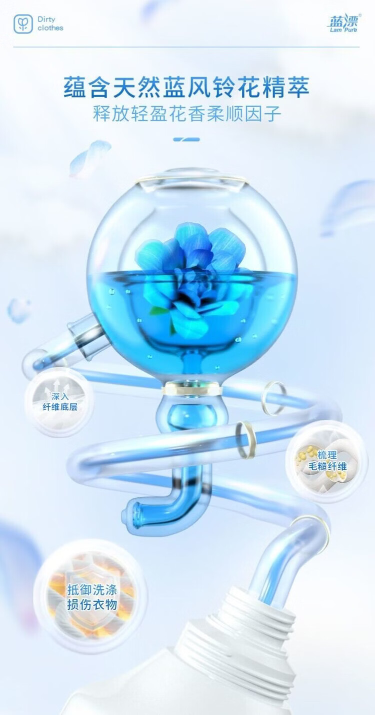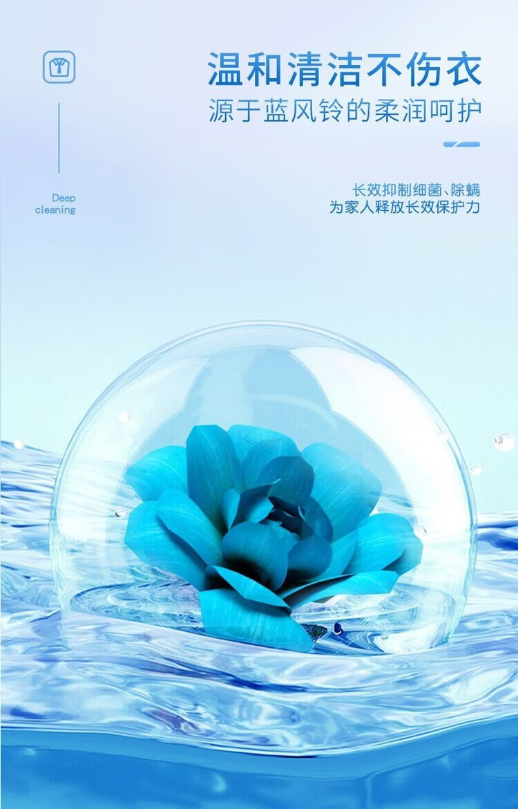 香味持久 清新怡人;精心调配洁净成分,高效去污去渍;温和清洁不伤衣,源于蓝风铃的柔润呵护