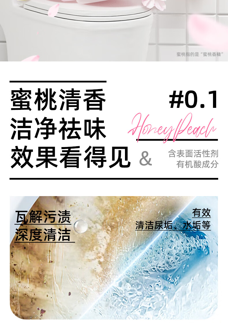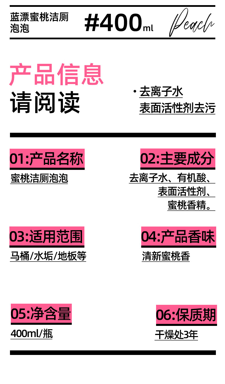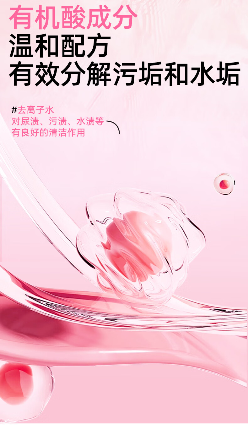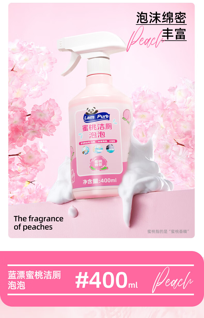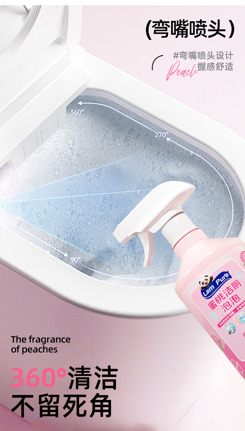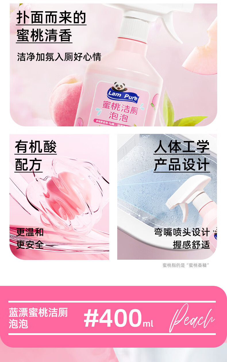 扑面而来的蜜桃清香,洁净加氛入厕好心情;弯嘴喷头设计,握感舒适;有机酸配方,更温和更安全