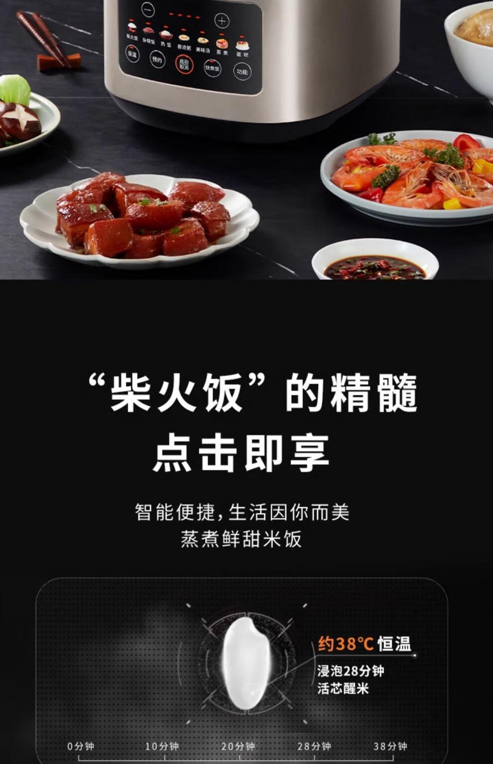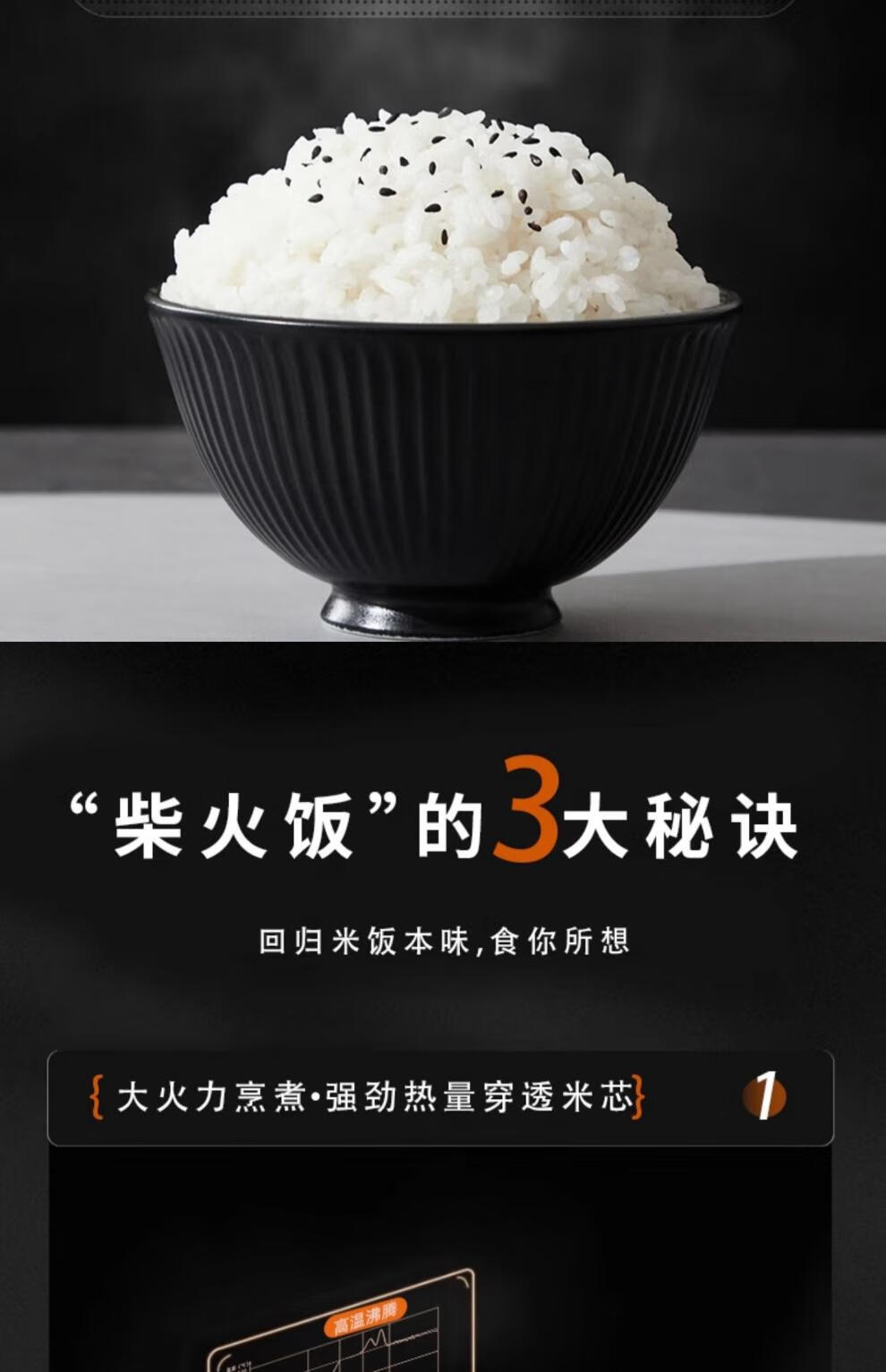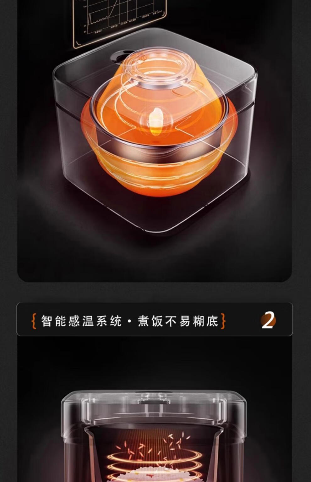 前置彩屏操作界面,一目了然少;简约金属机身,一键开盖;大火力烹煮,释放米饭原香