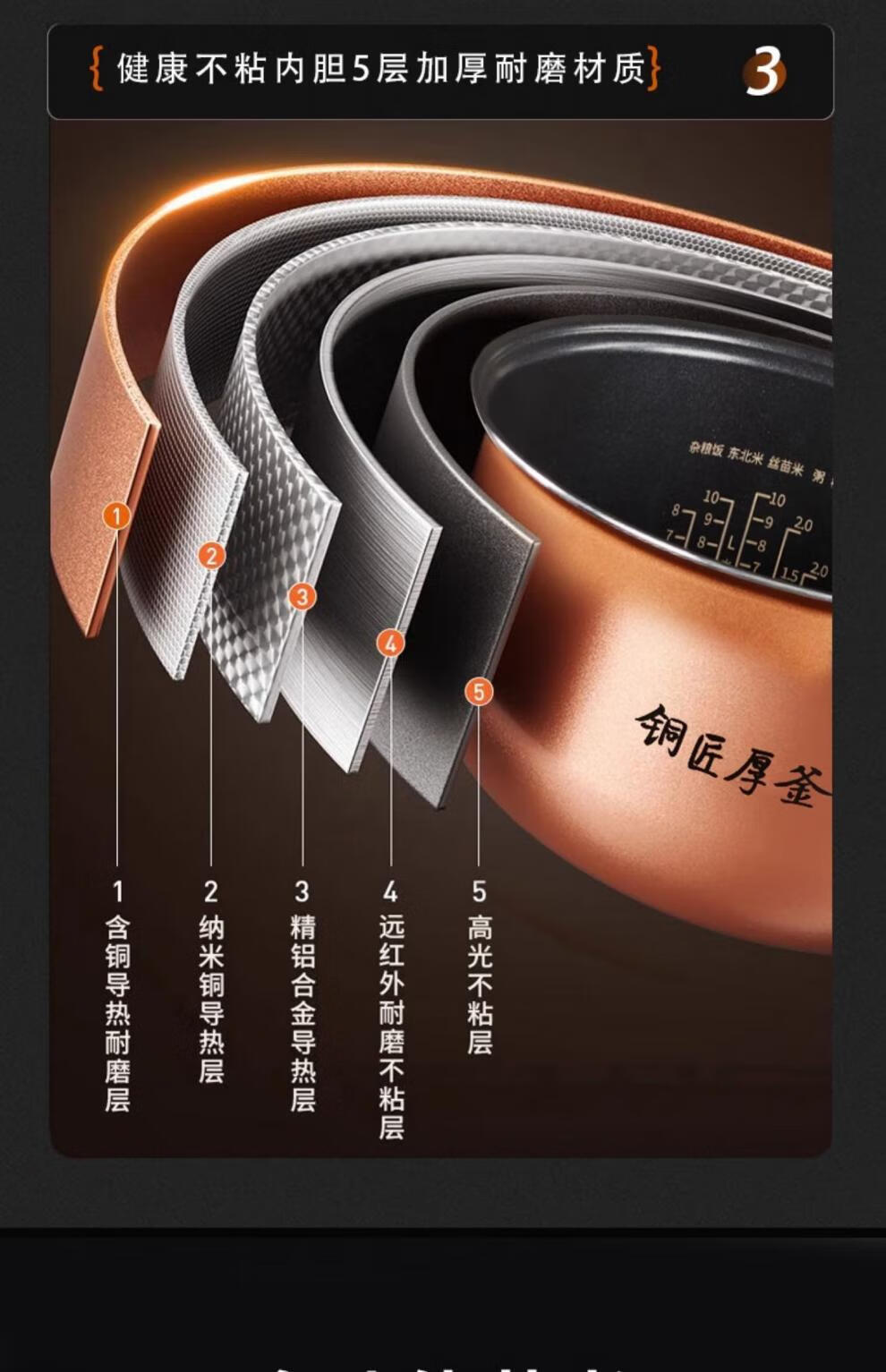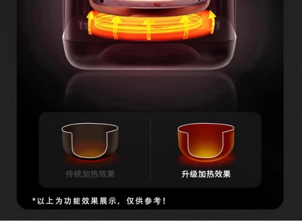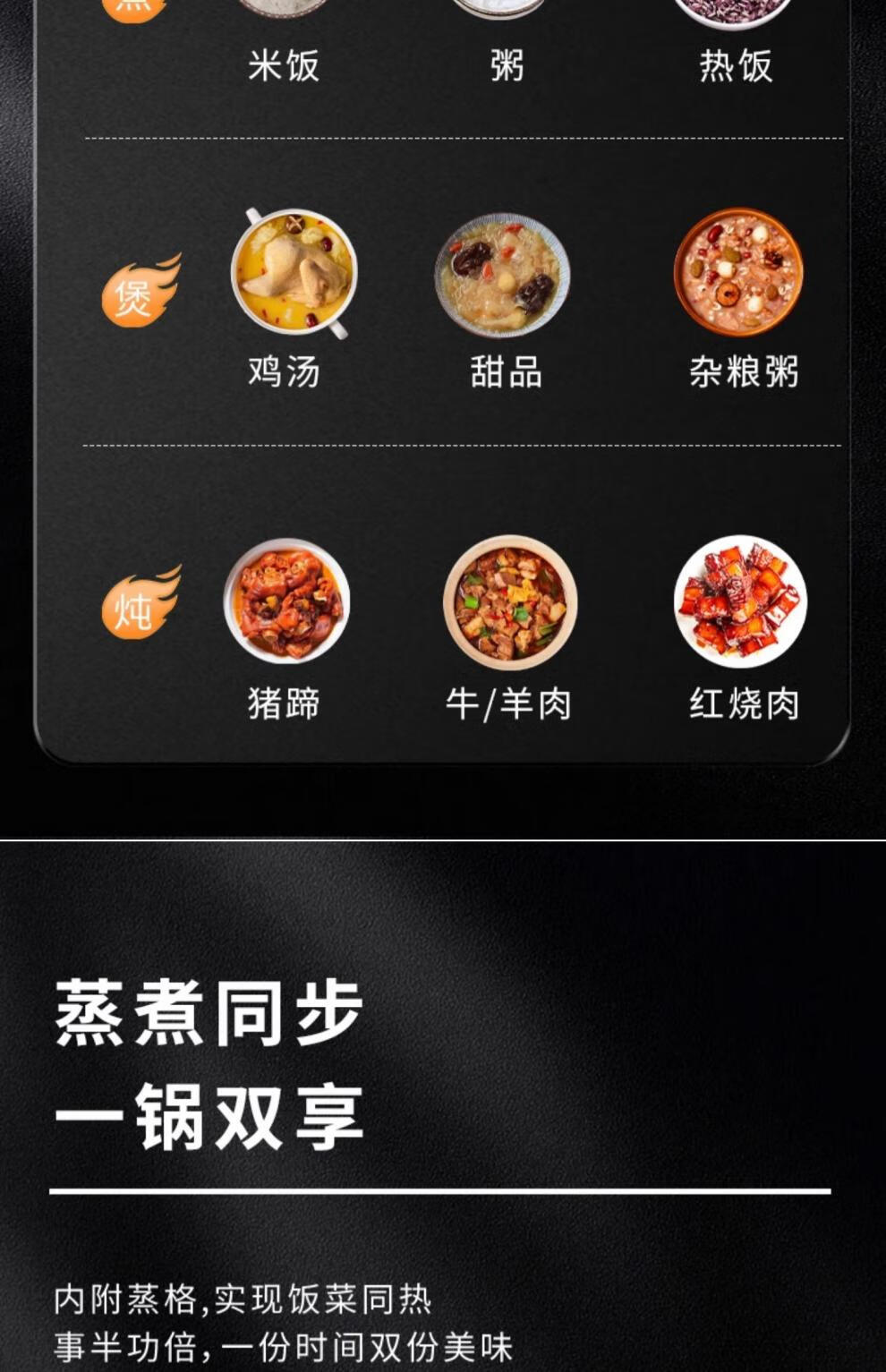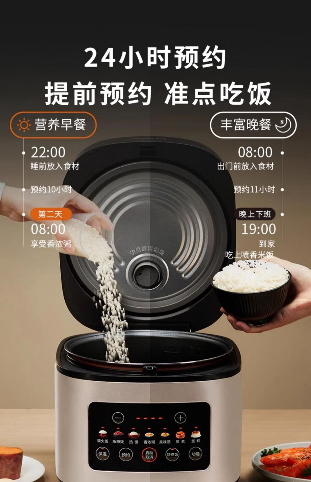 前置彩屏操作界面,一目了然少;简约金属机身,一键开盖;大火力烹煮,释放米饭原香