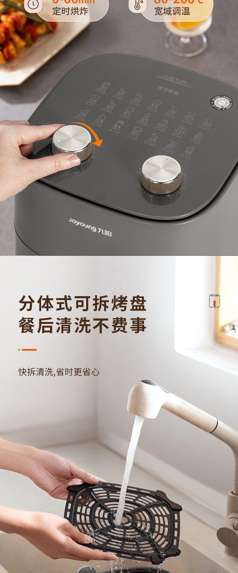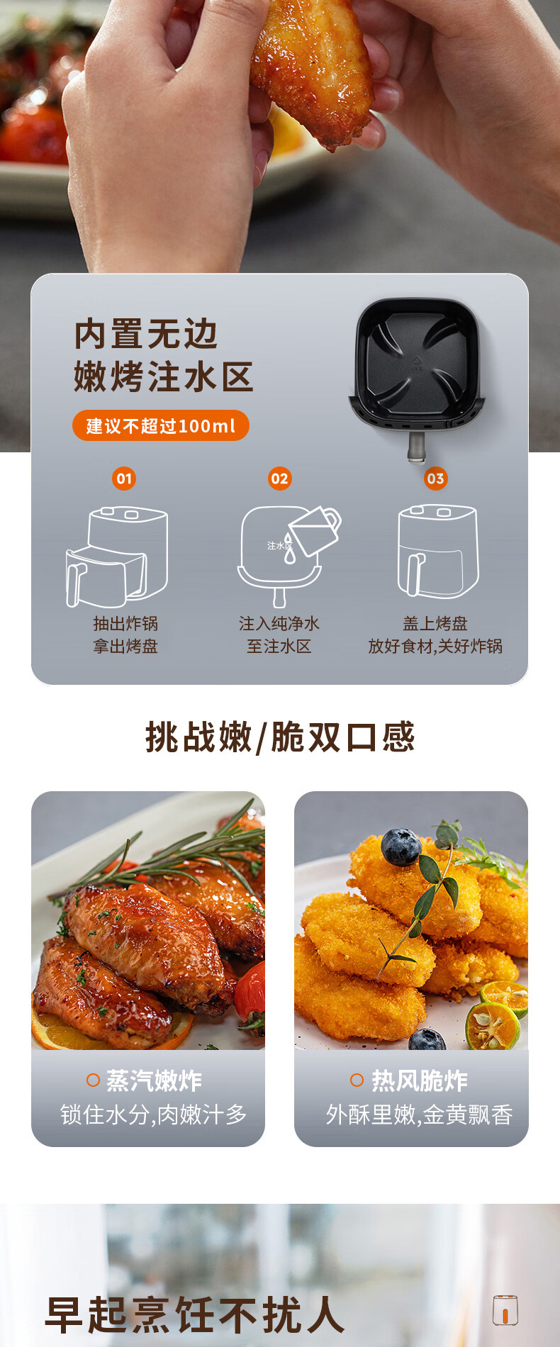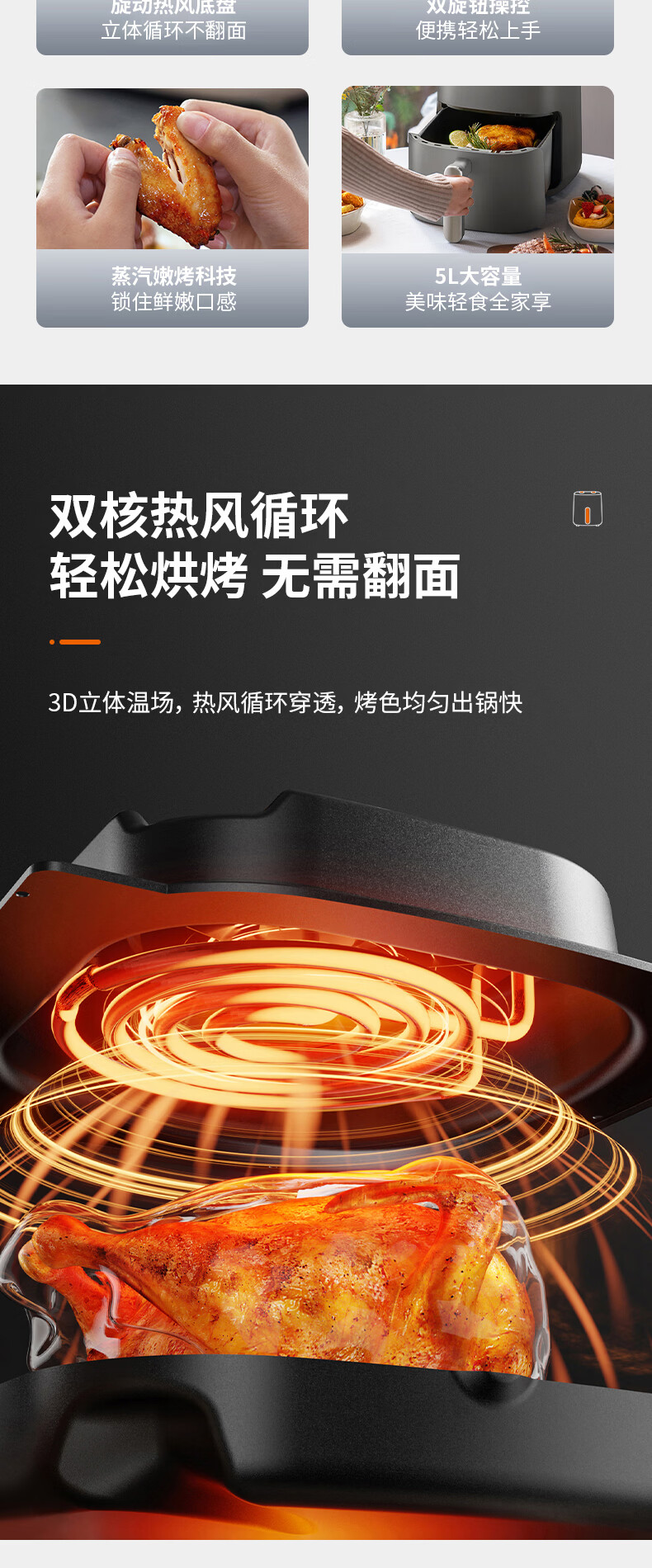蒸汽嫩烤科技,锁住鲜嫩口感;双核热风循环,轻松烘烤;烤架式炸篮,分体设计易清洁
