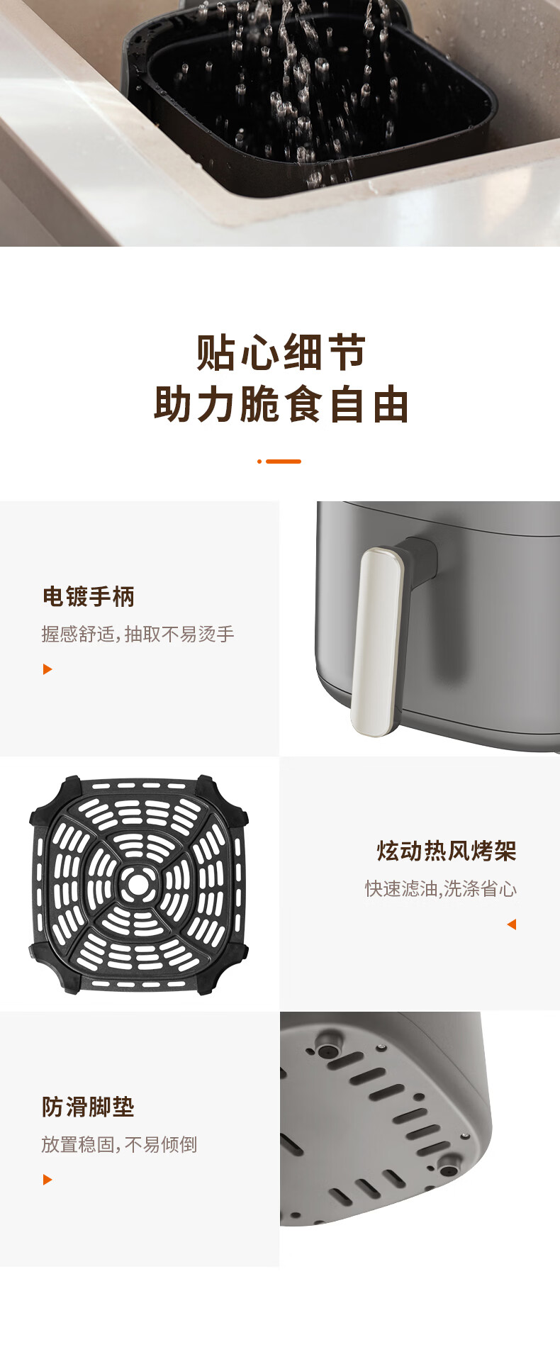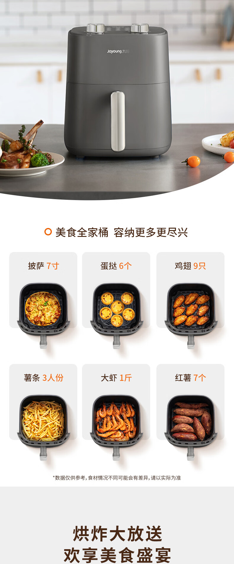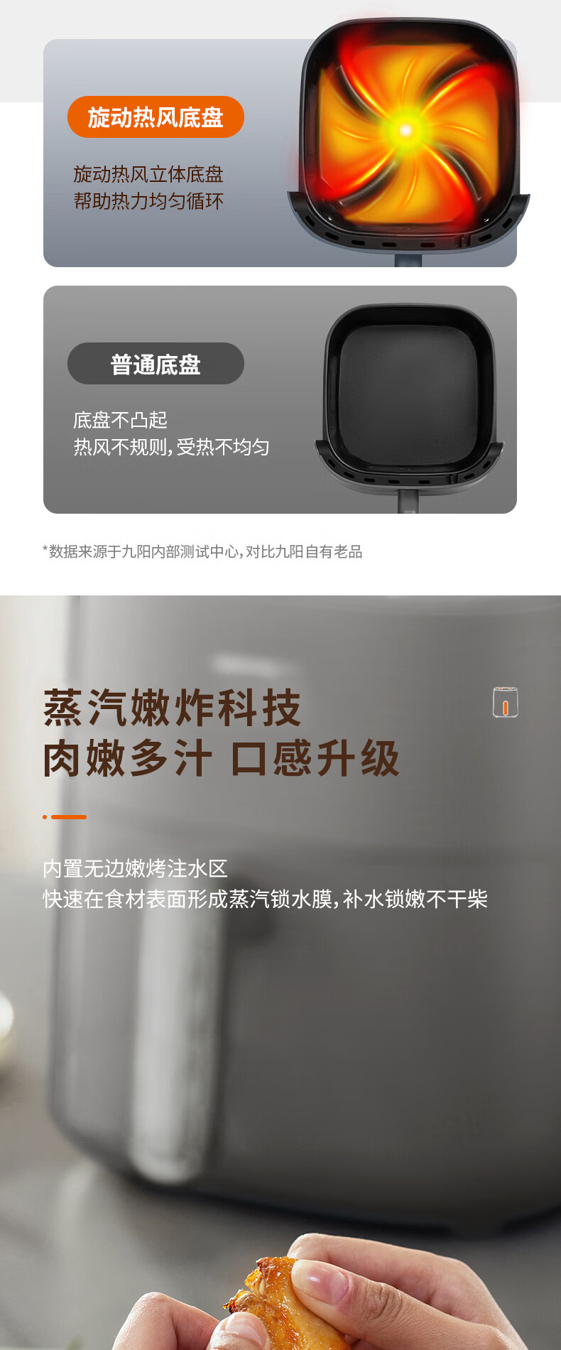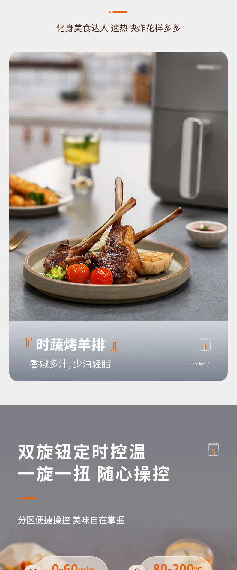 蒸汽嫩烤科技,锁住鲜嫩口感;双核热风循环,轻松烘烤;烤架式炸篮,分体设计易清洁