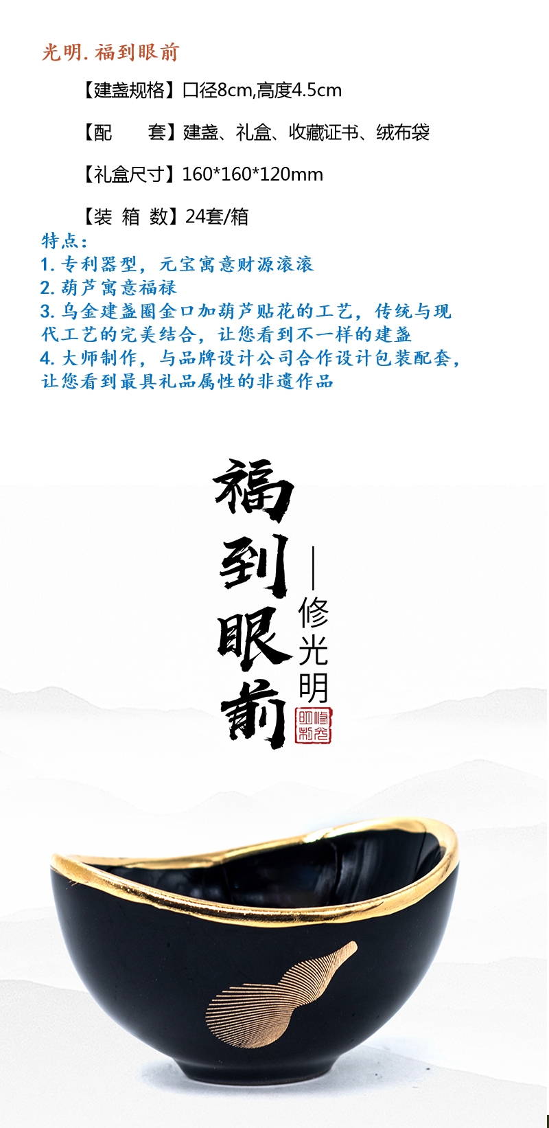 专利 “福到眼前” 器型,颜值寓意双 buff;非遗建盏工艺 + 匠心细节,品质质感在线;吉祥属性 + 场景百搭,自用送礼超合适